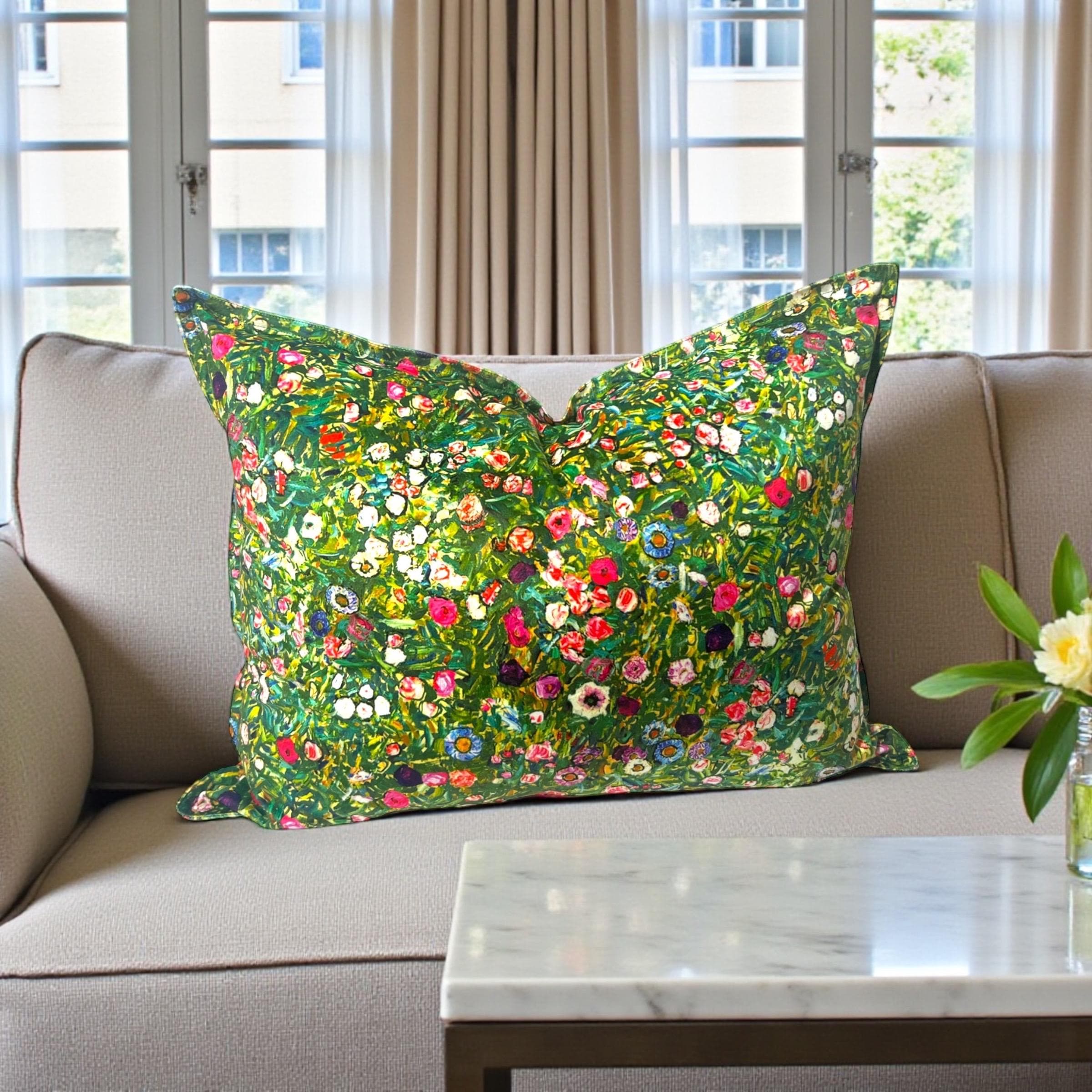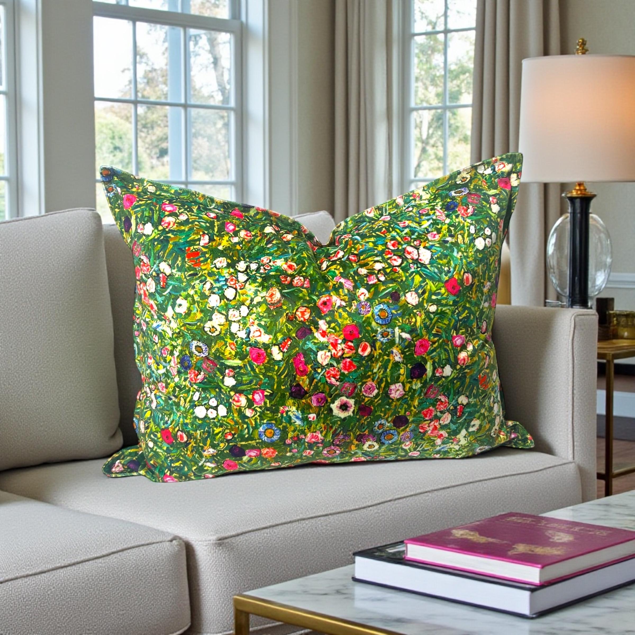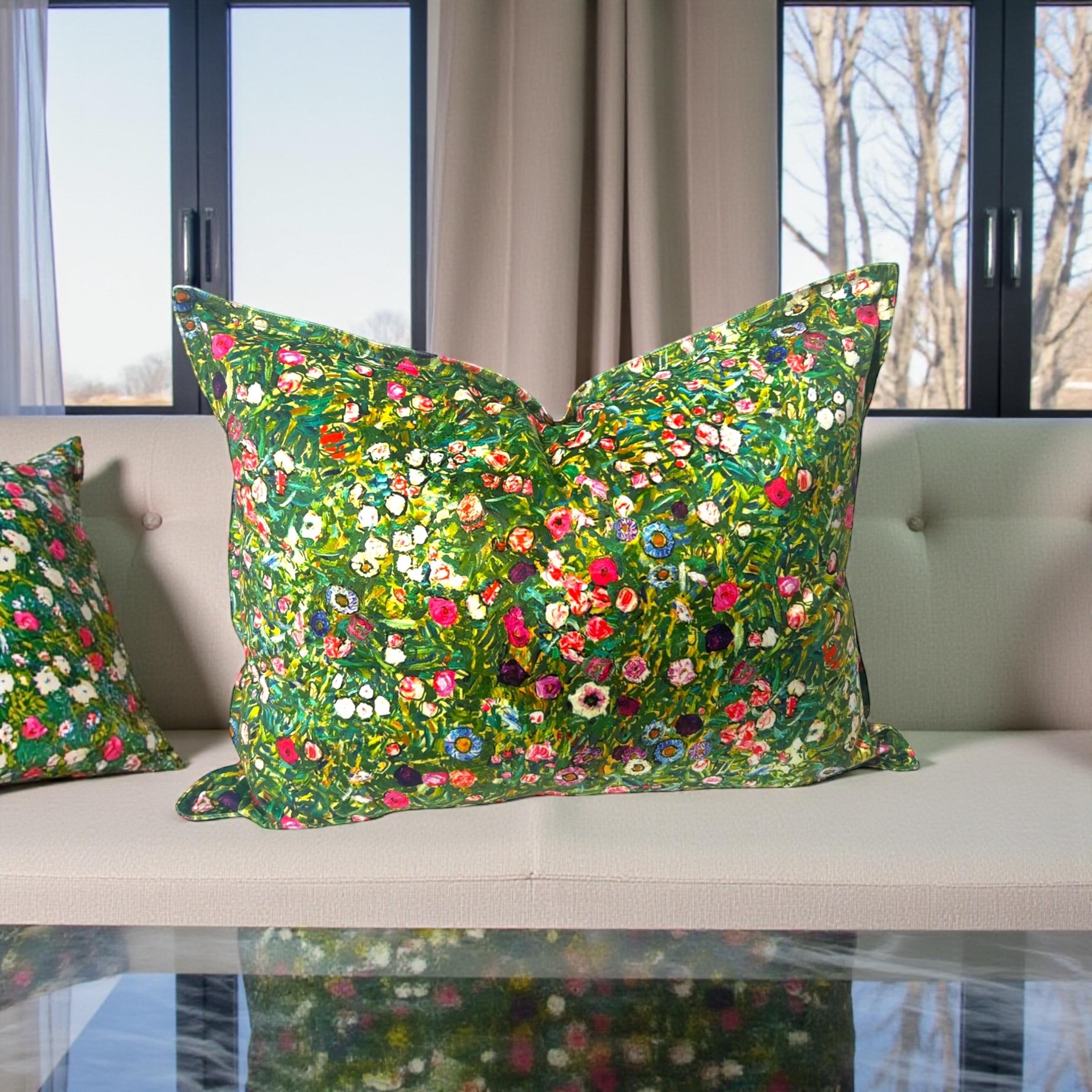 Bring the beauty of a true masterpiece into your home with this exquisite handmade velvet pillow cover, crafted from the luxurious Gustav Klimt “Italian Garden” designer fabric.