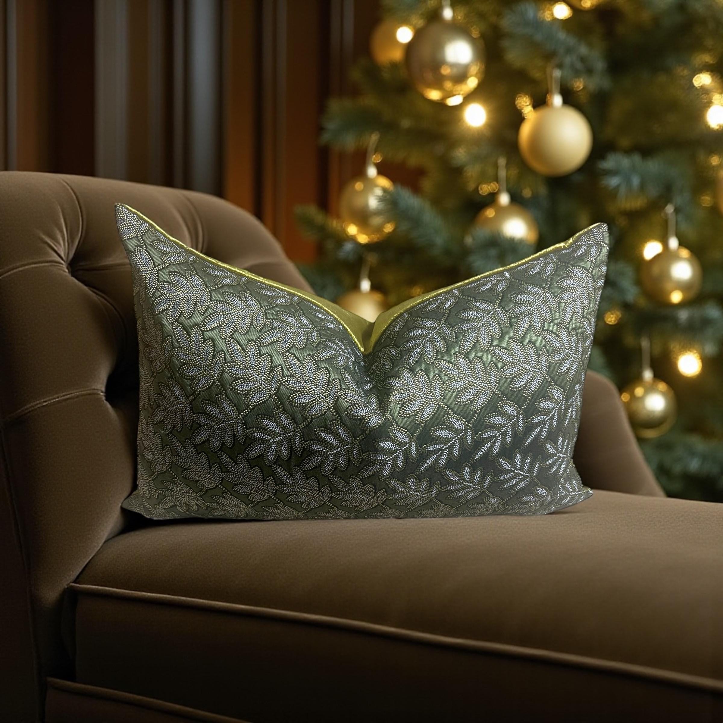 Elevate your festive décor with this luxury khaki-green French jacquard pillow, richly woven with shimmering gold lurex bay leaves and finished with a sumptuous lime-green velvet back. Elegant, artistic and handcrafted — this is a truly high-end Christmas accent for refined interiors.