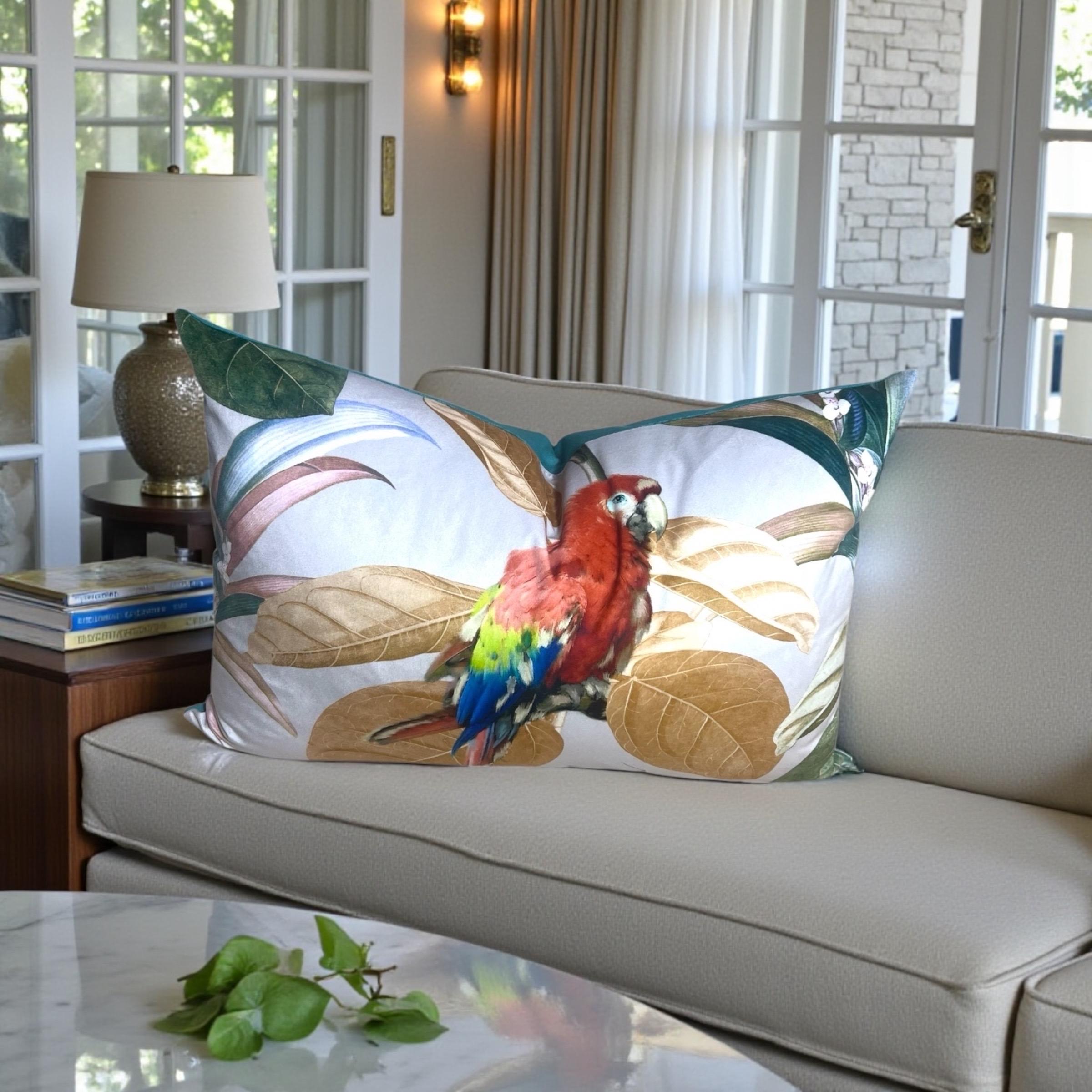 The front features fabric from the LushVelvets collection, showcasing an exceptionally vivid and detailed tropical parrot artwork, surrounded by soft botanical leaves in warm neutral tones. The colors feel alive, painterly, and sophisticated — like a piece of art for your sofa.