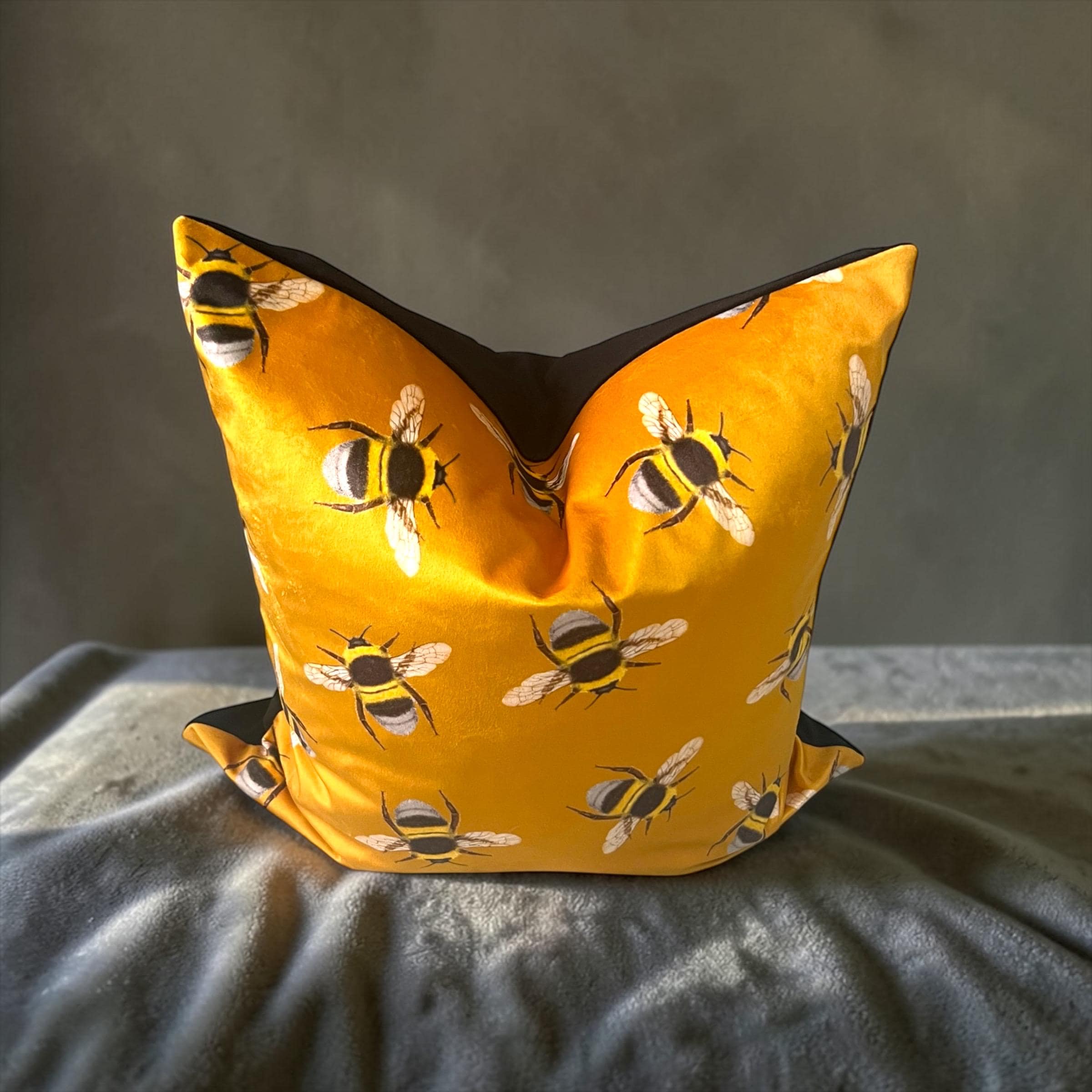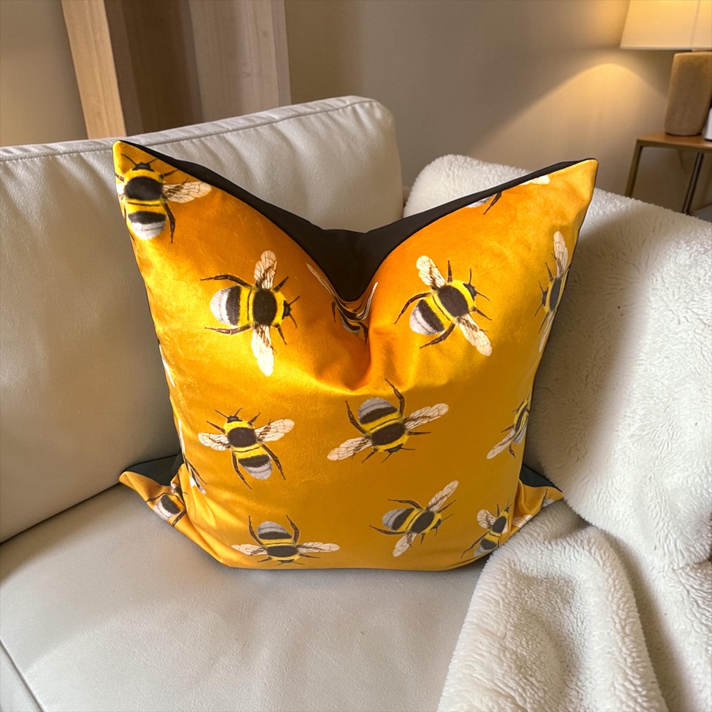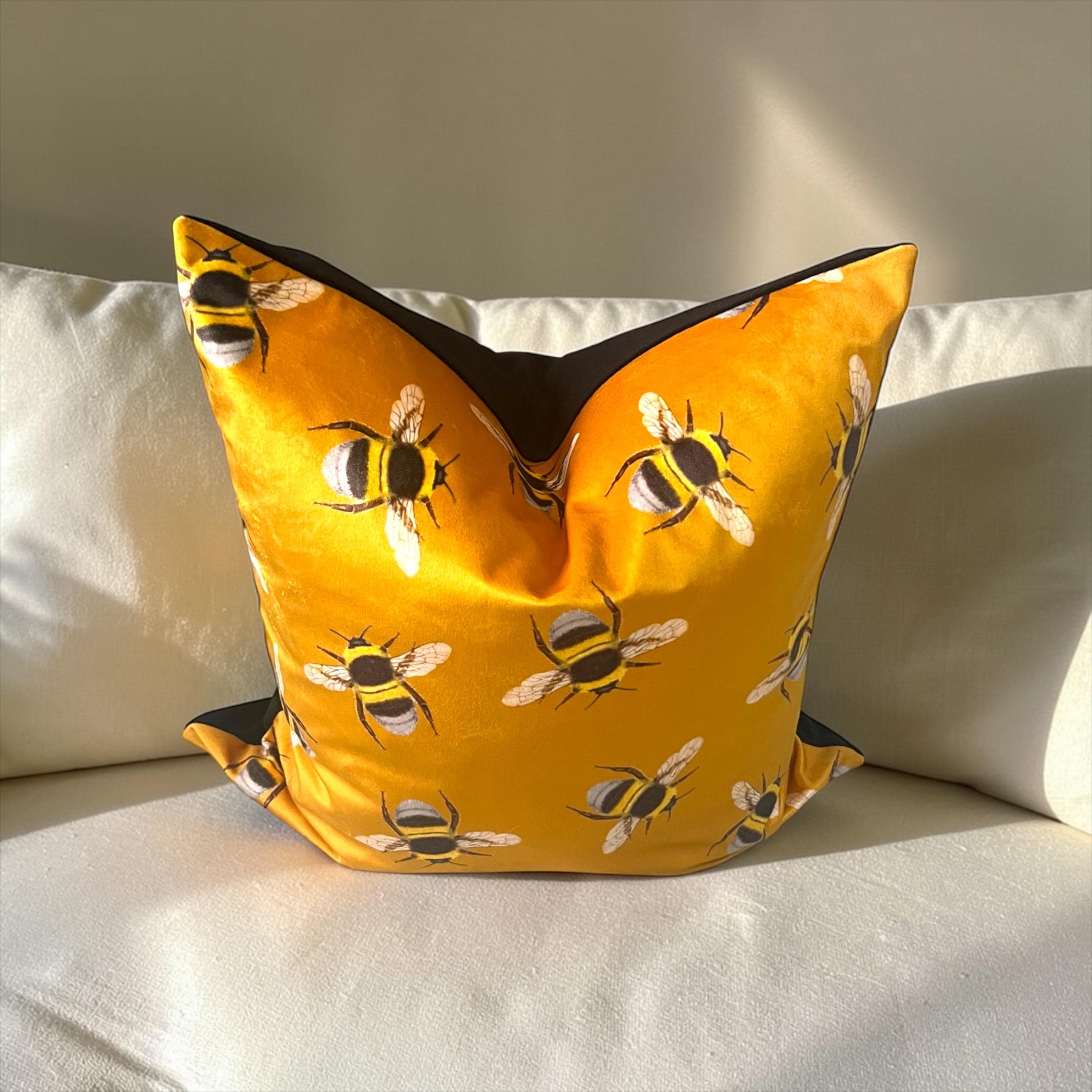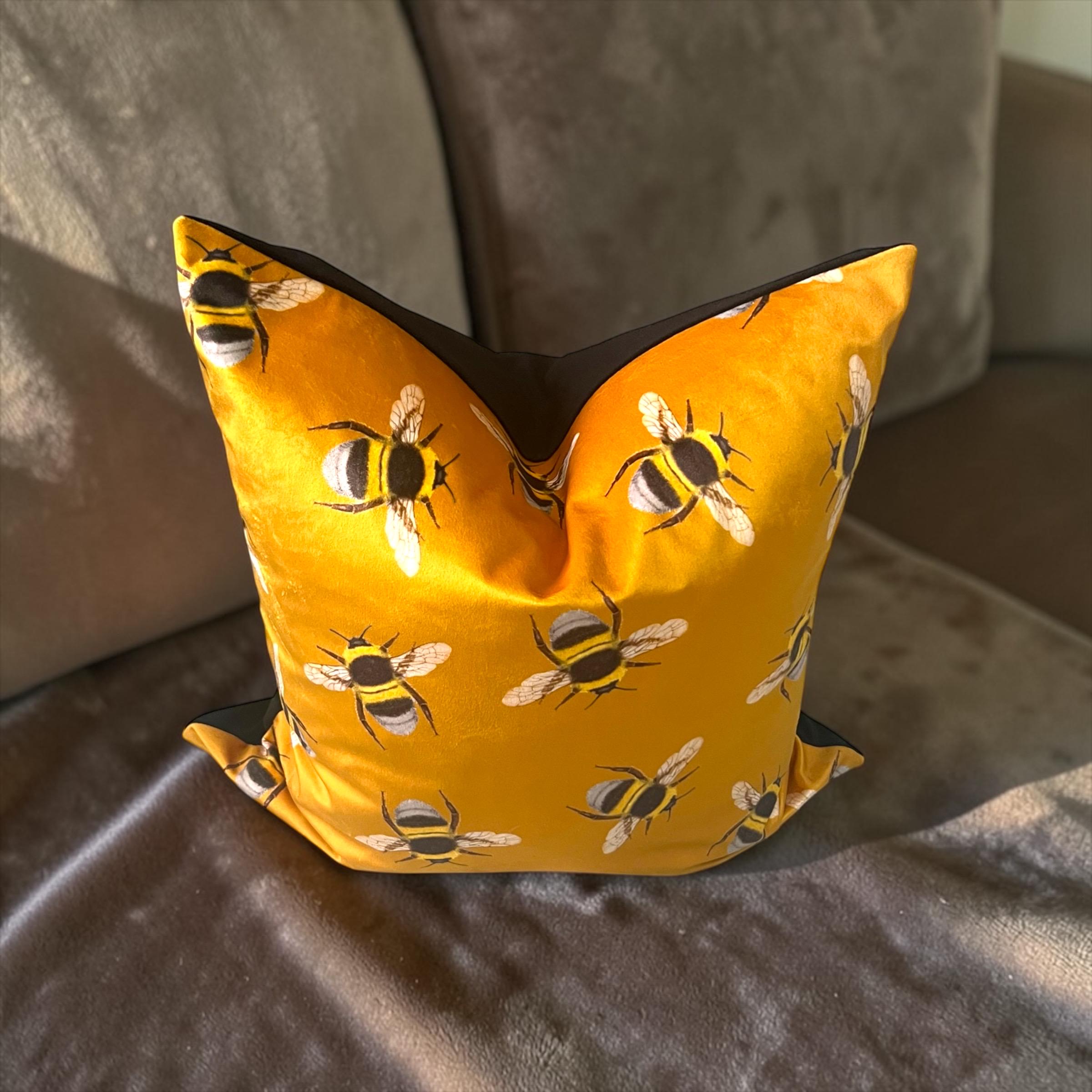 • Exclusive designer Italian velvet in rich golden yellow, featuring a charming bee pattern