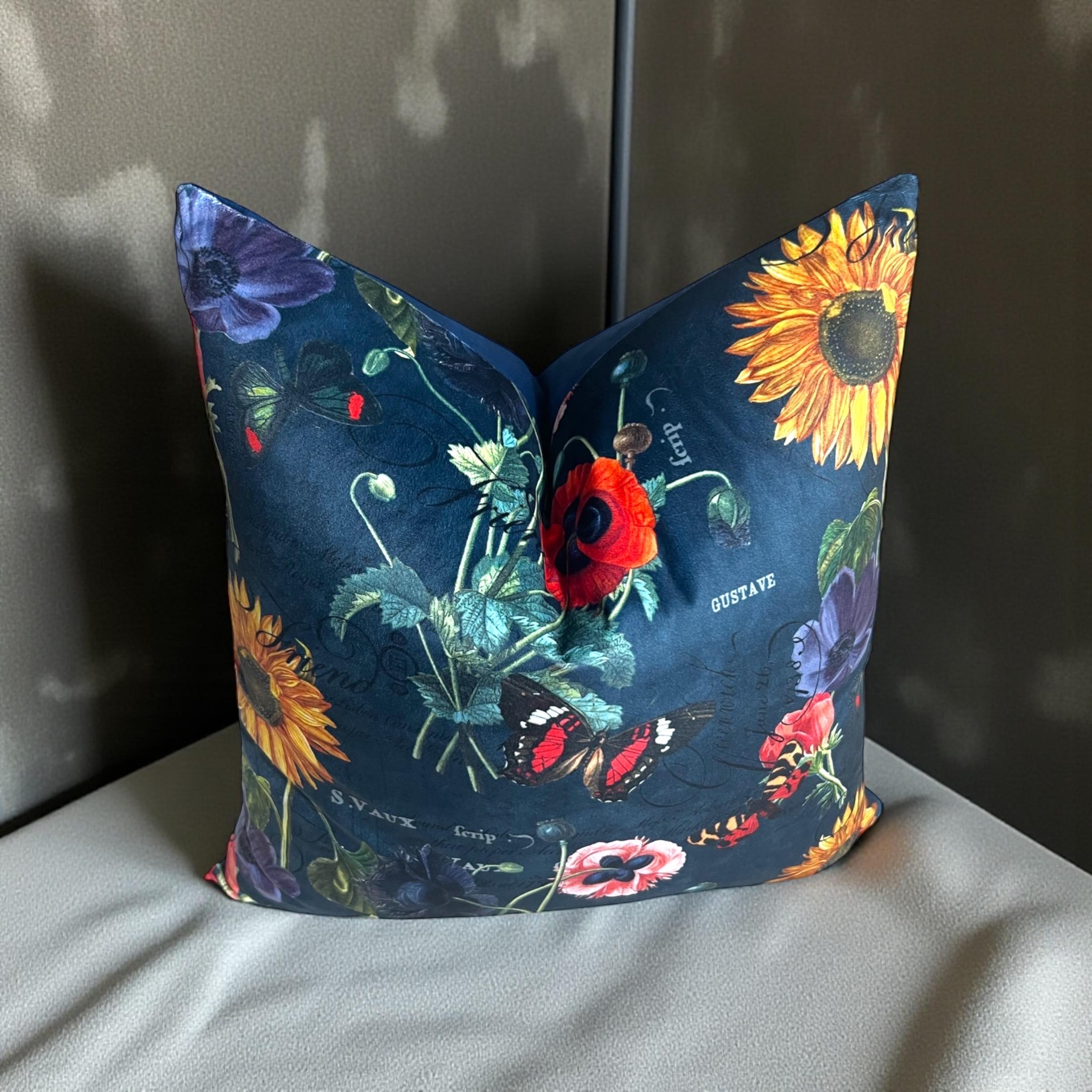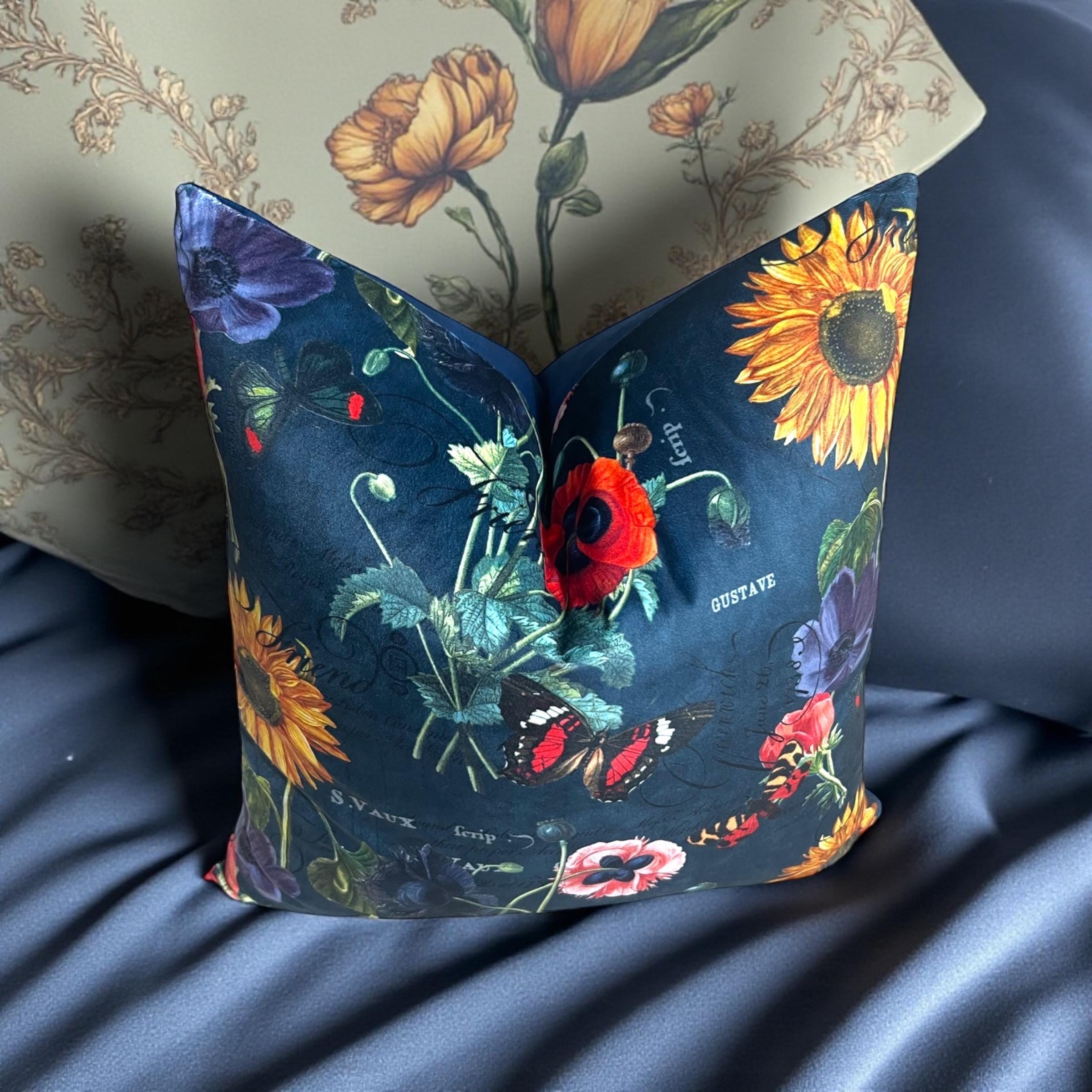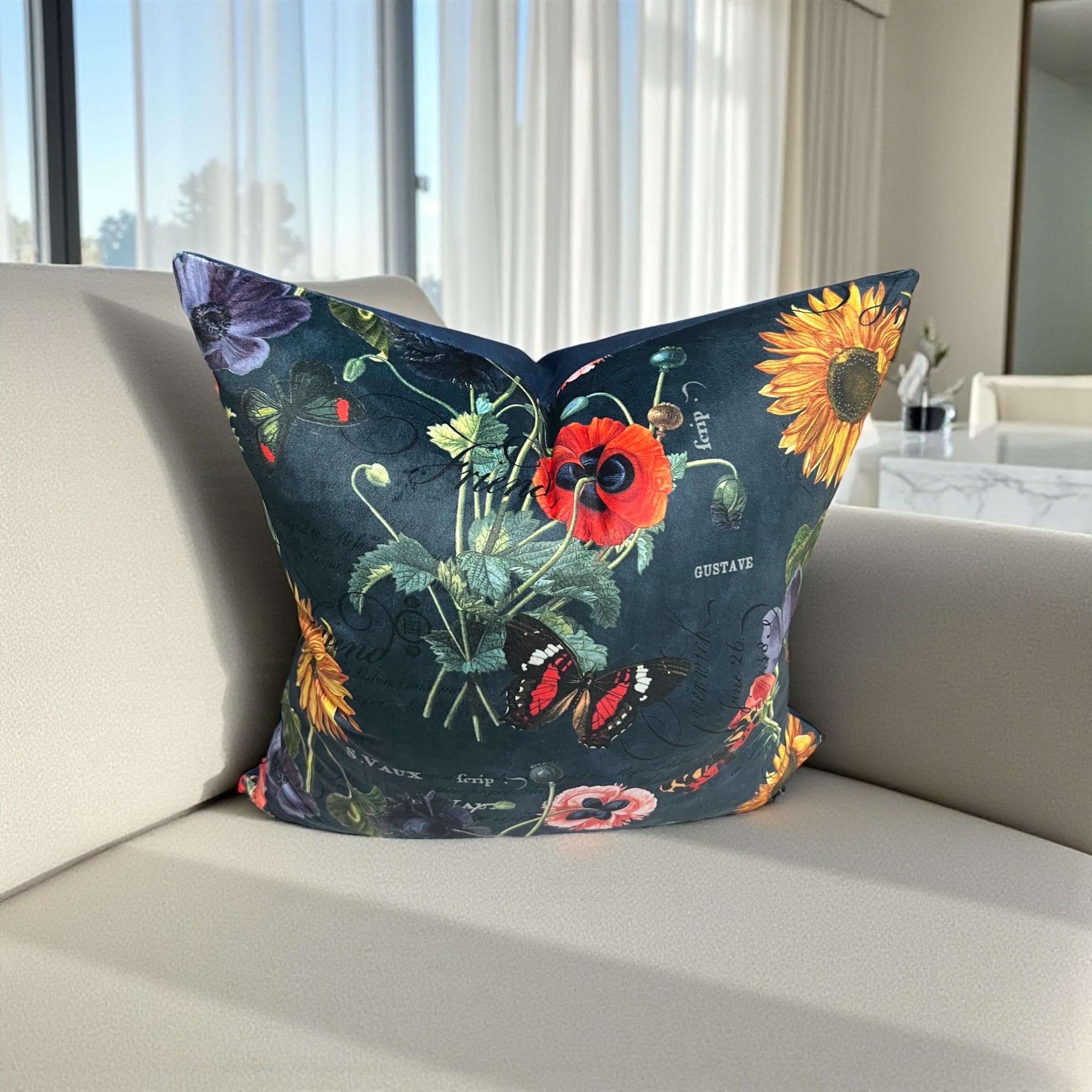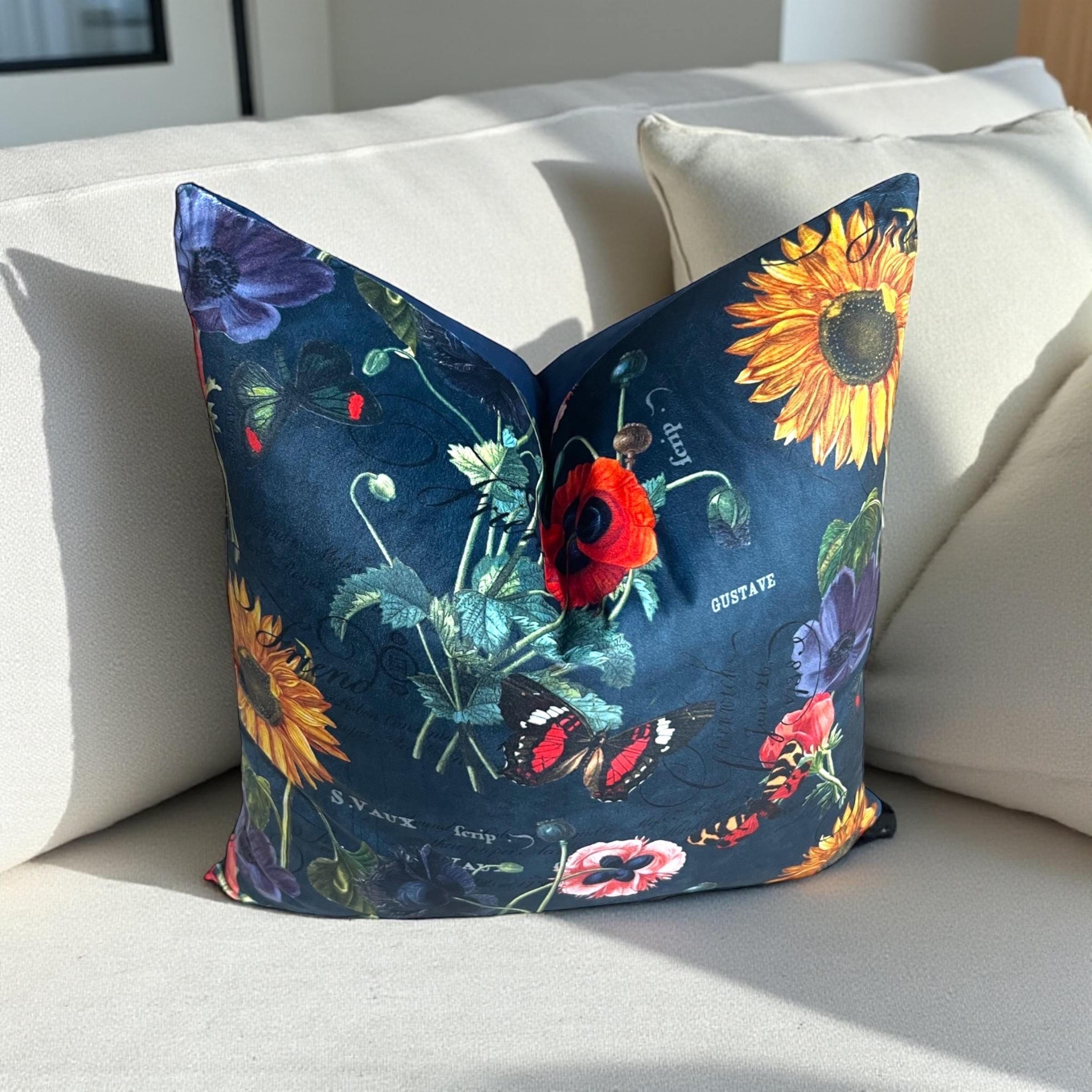 Handmade from premium Italian digital print velvet, this luxury pillow cover features rich botanical artwork on a deep ink blue background. The design showcases dramatic sunflowers, florals and elegant script details, creating a sophisticated statement piece for refined interiors.