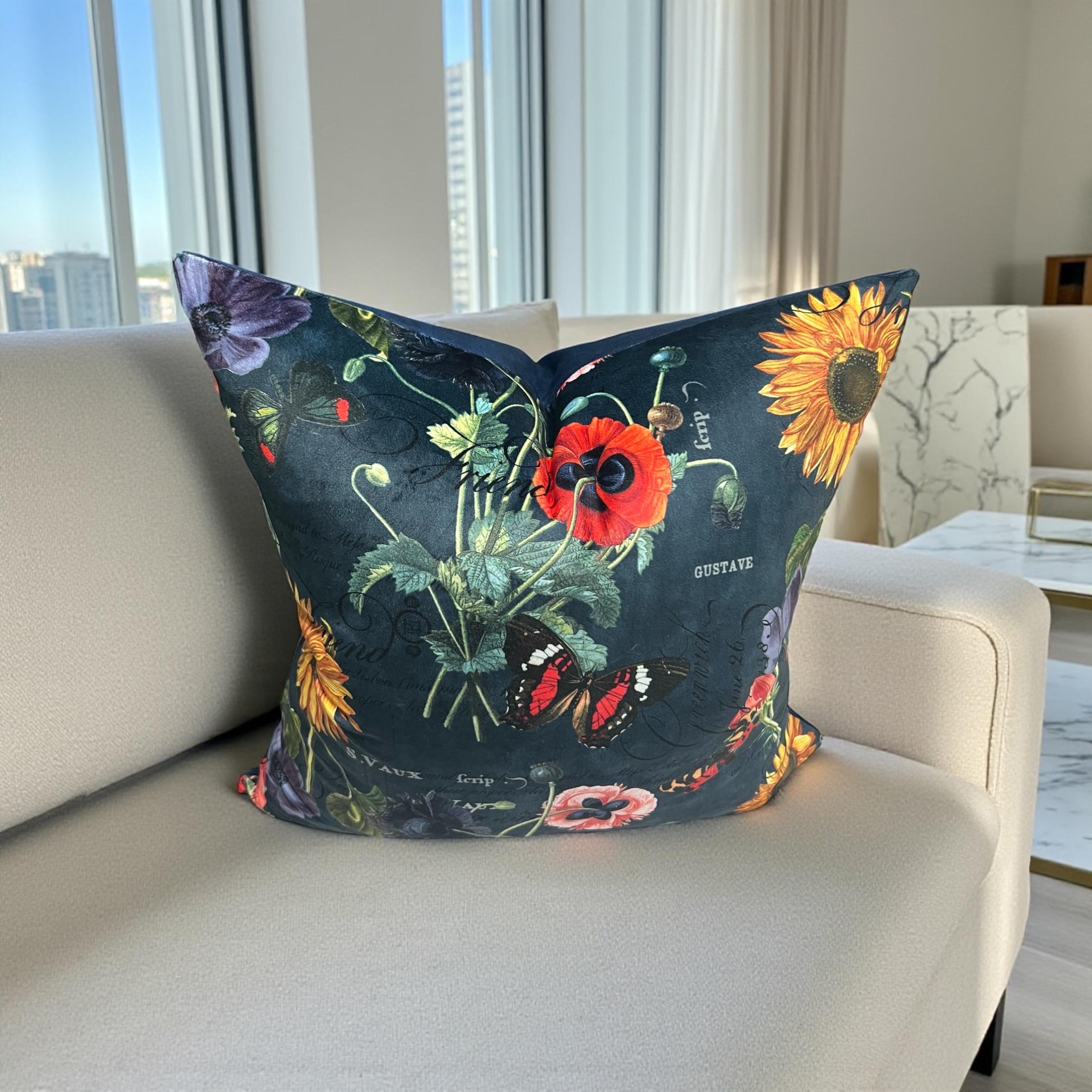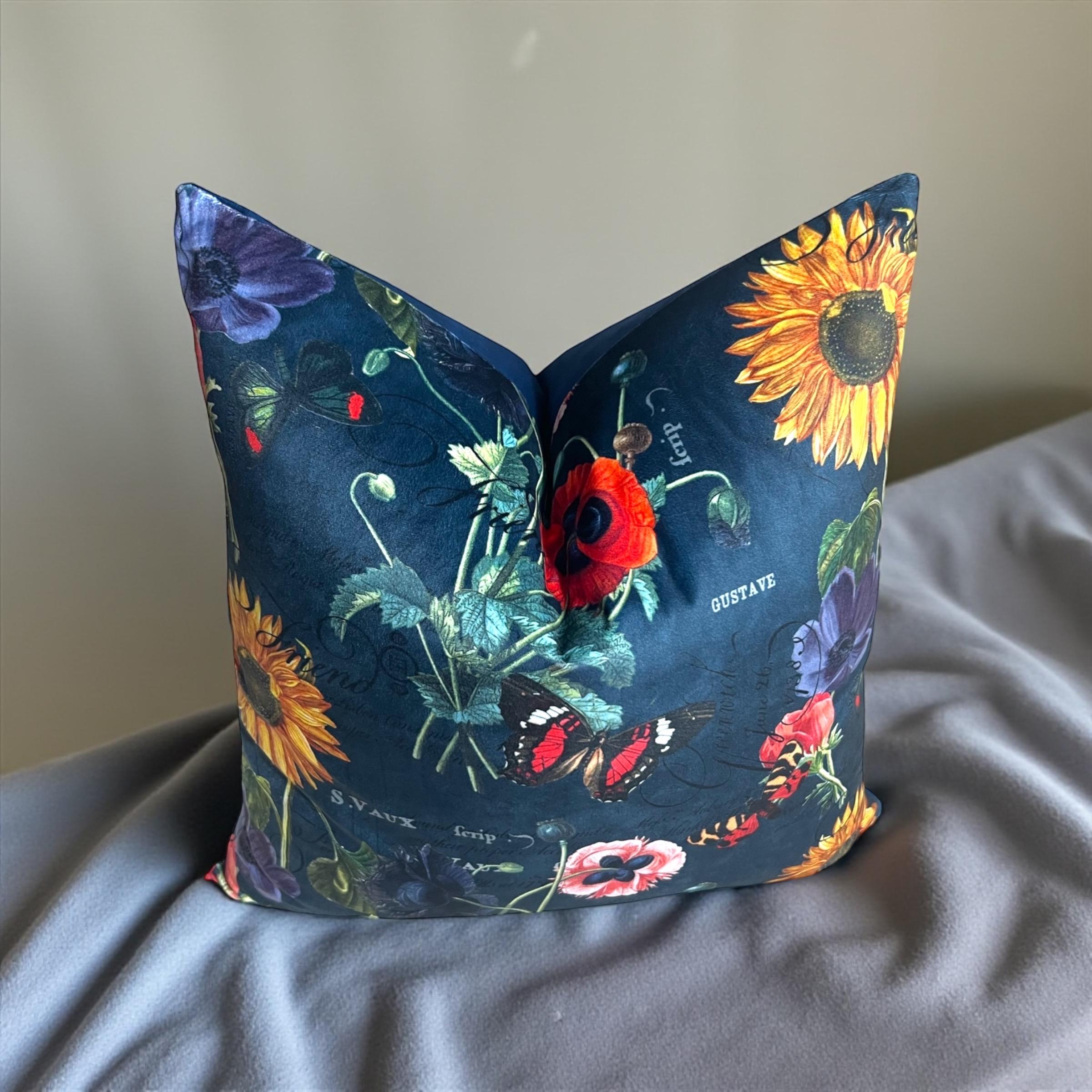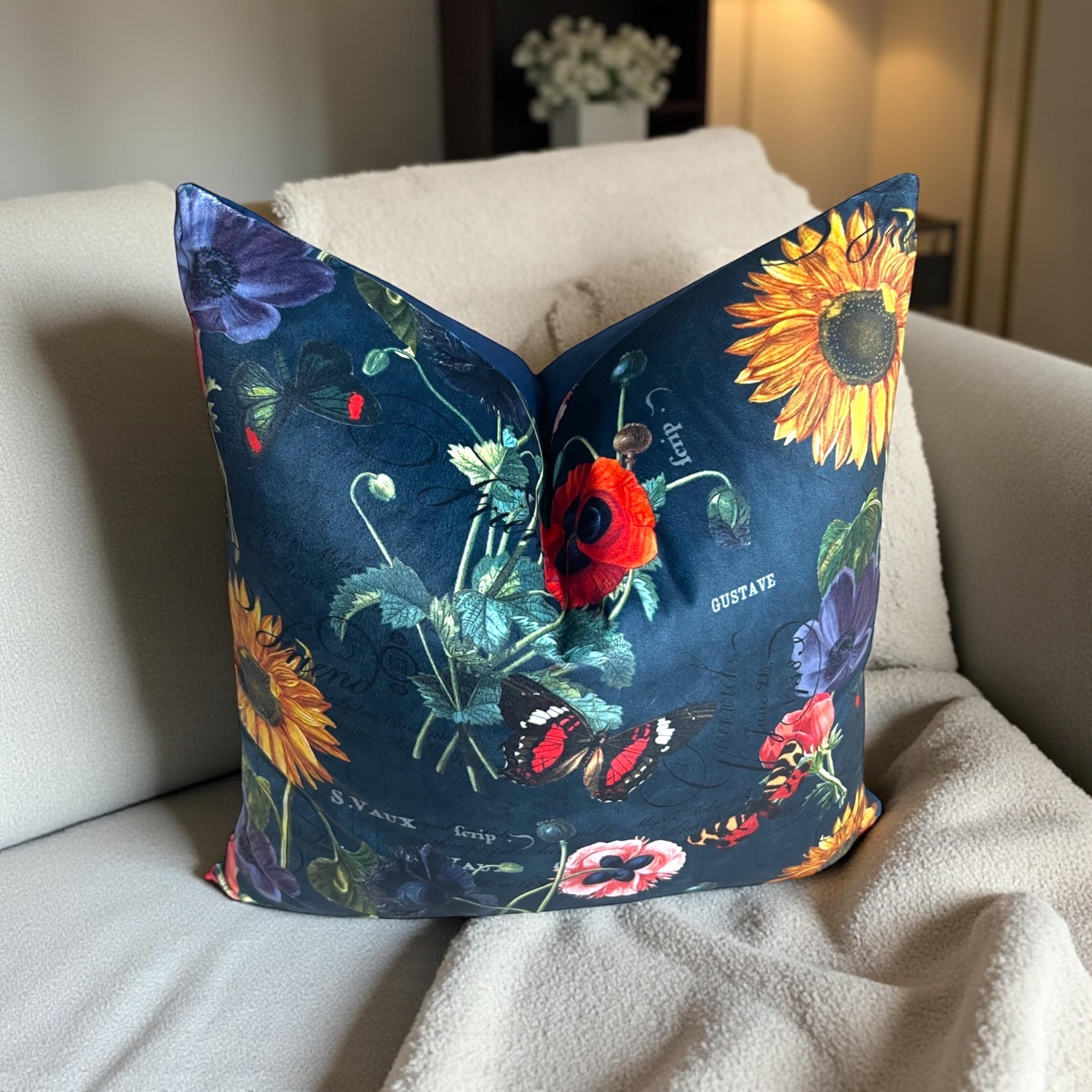 Handmade from premium Italian digital print velvet, this luxury pillow cover features rich botanical artwork on a deep ink blue background. The design showcases dramatic sunflowers, florals and elegant script details, creating a sophisticated statement piece for refined interiors.