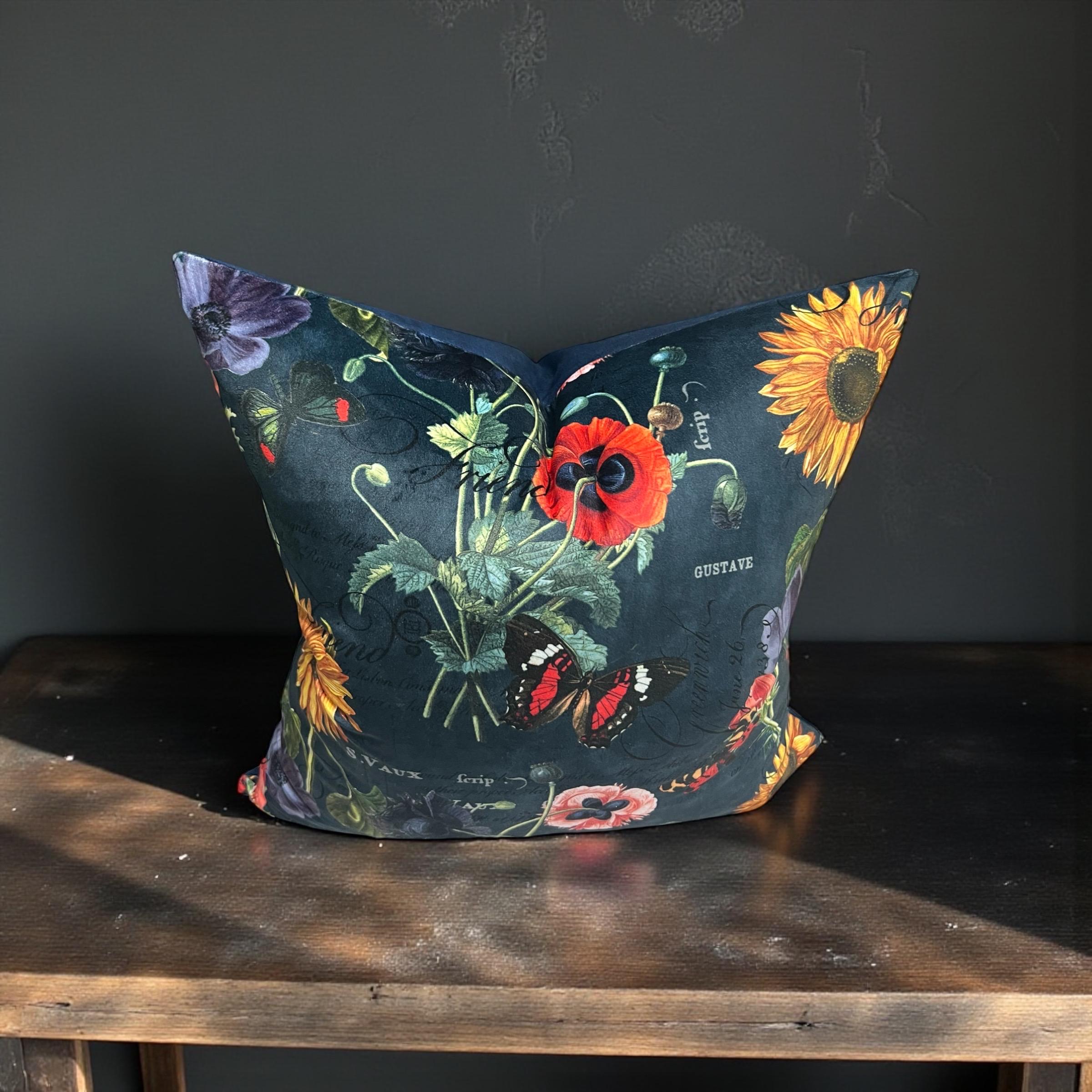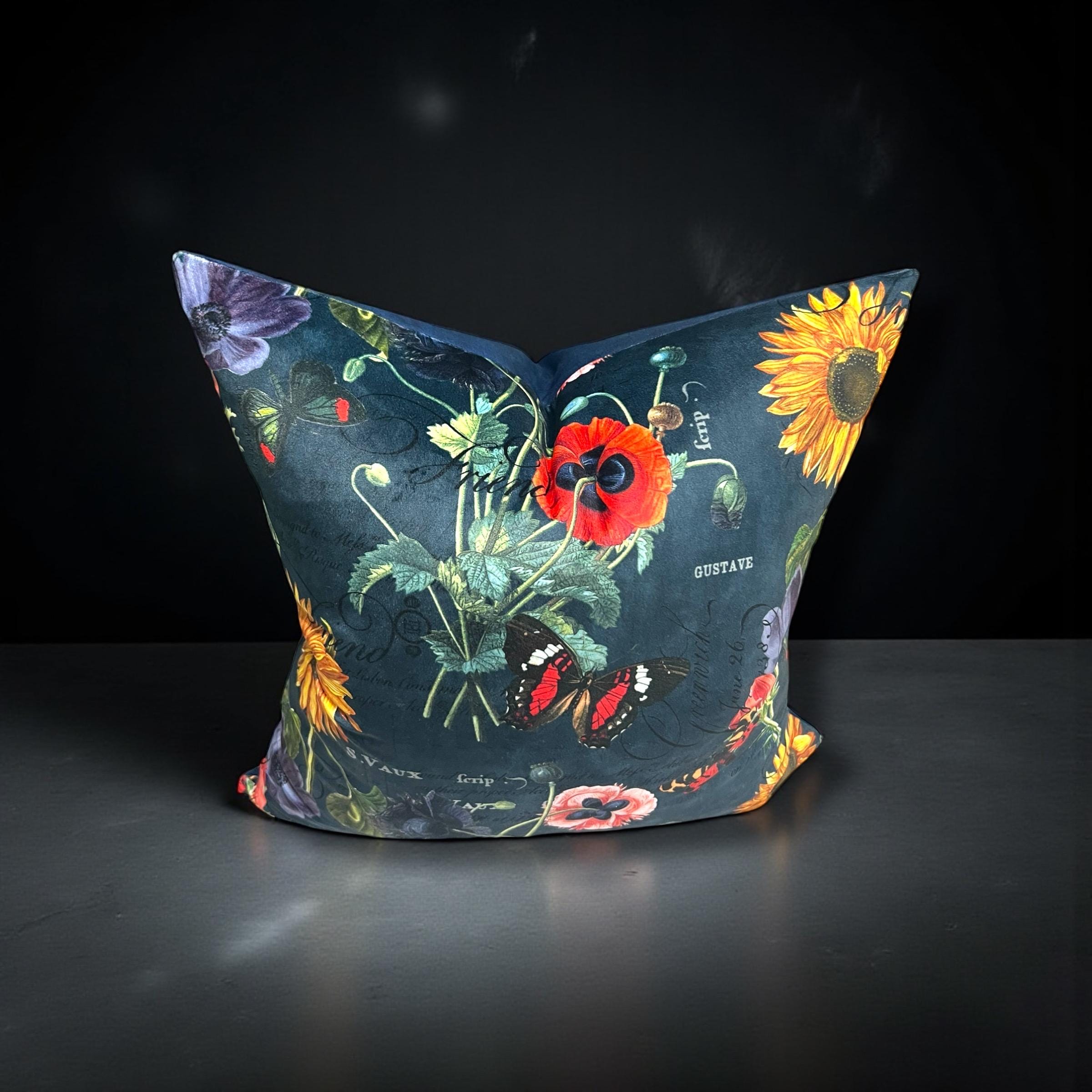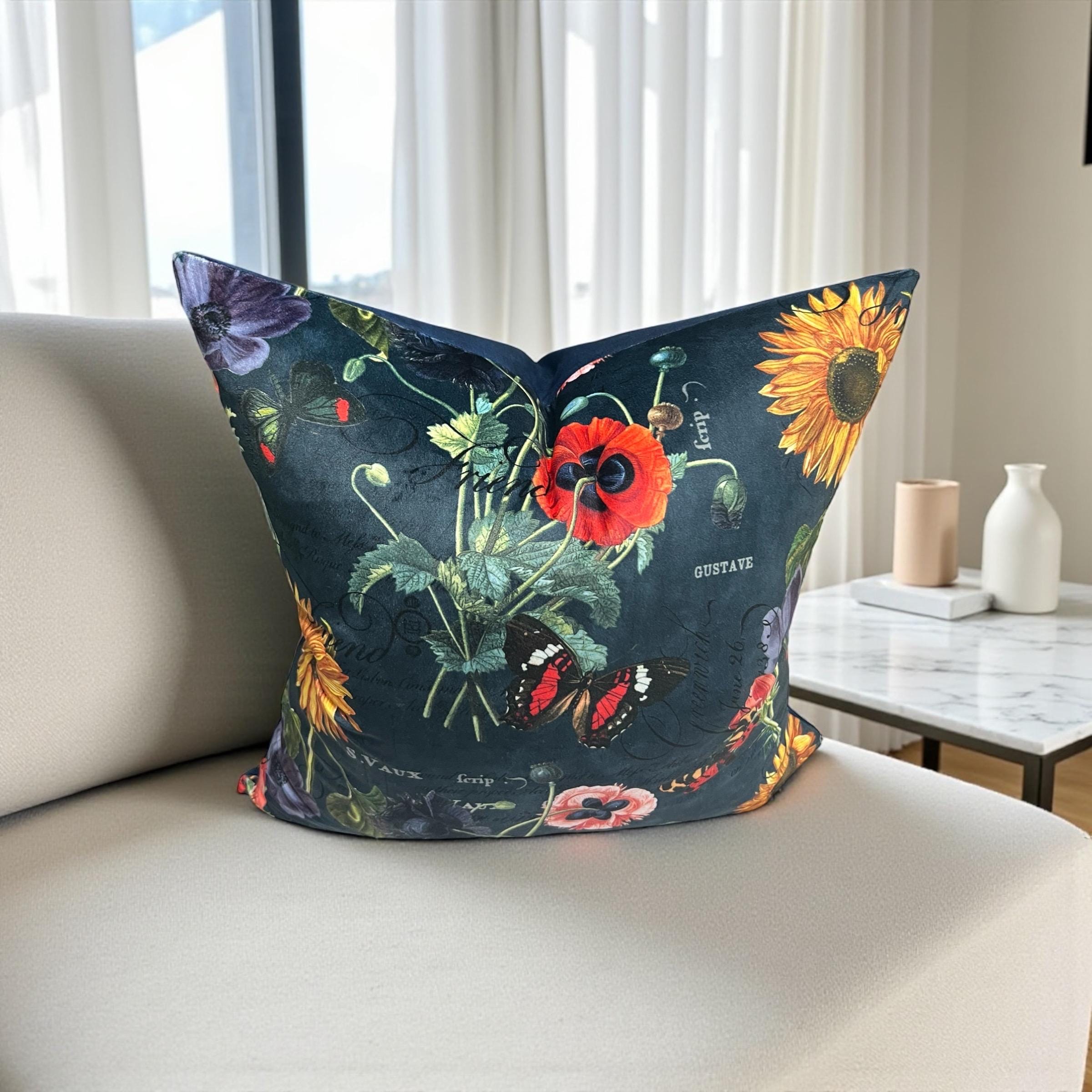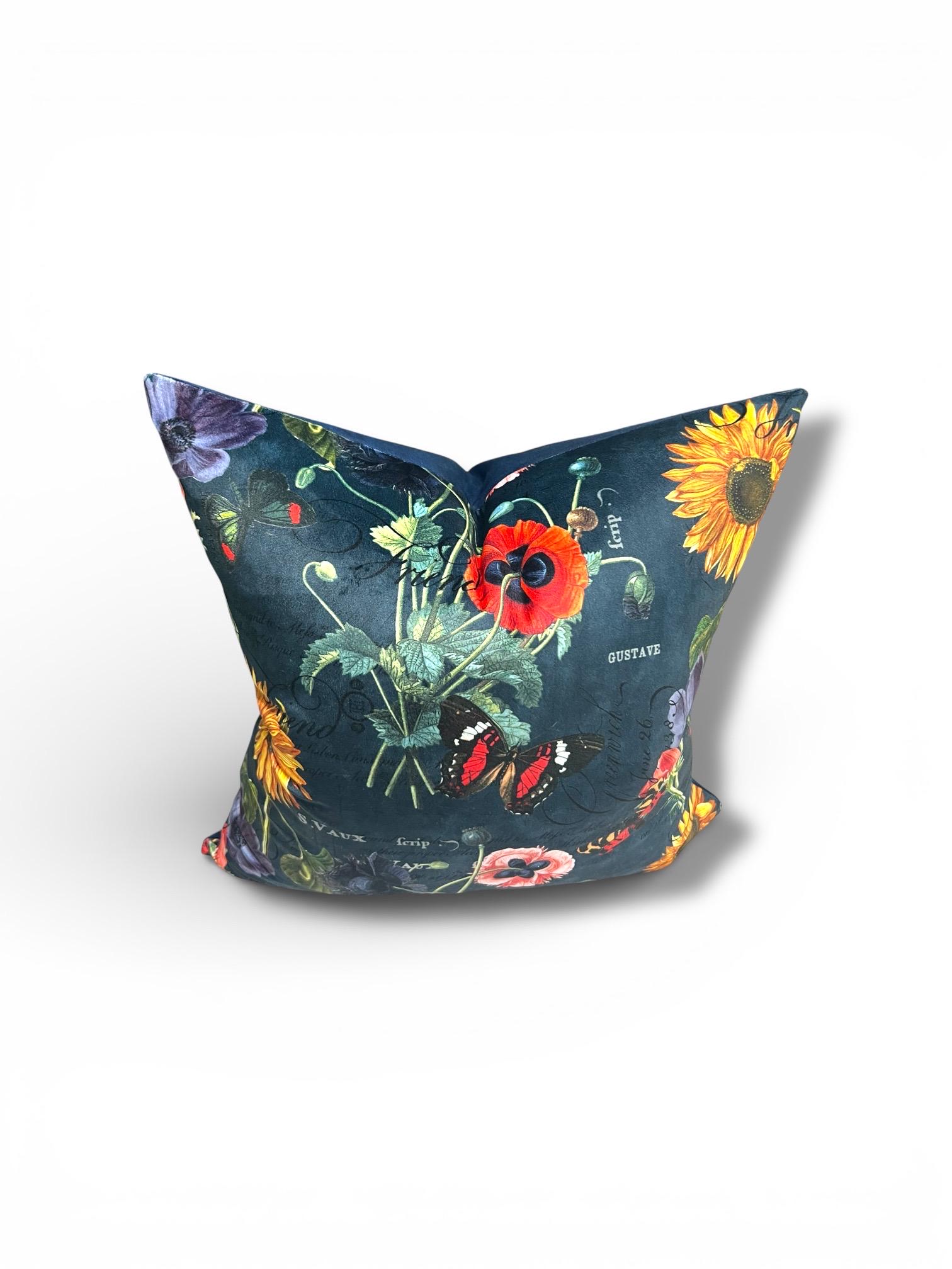Handmade from premium Italian digital print velvet, this luxury pillow cover features rich botanical artwork on a deep ink blue background. The design showcases dramatic sunflowers, florals and elegant script details, creating a sophisticated statement piece for refined interiors.