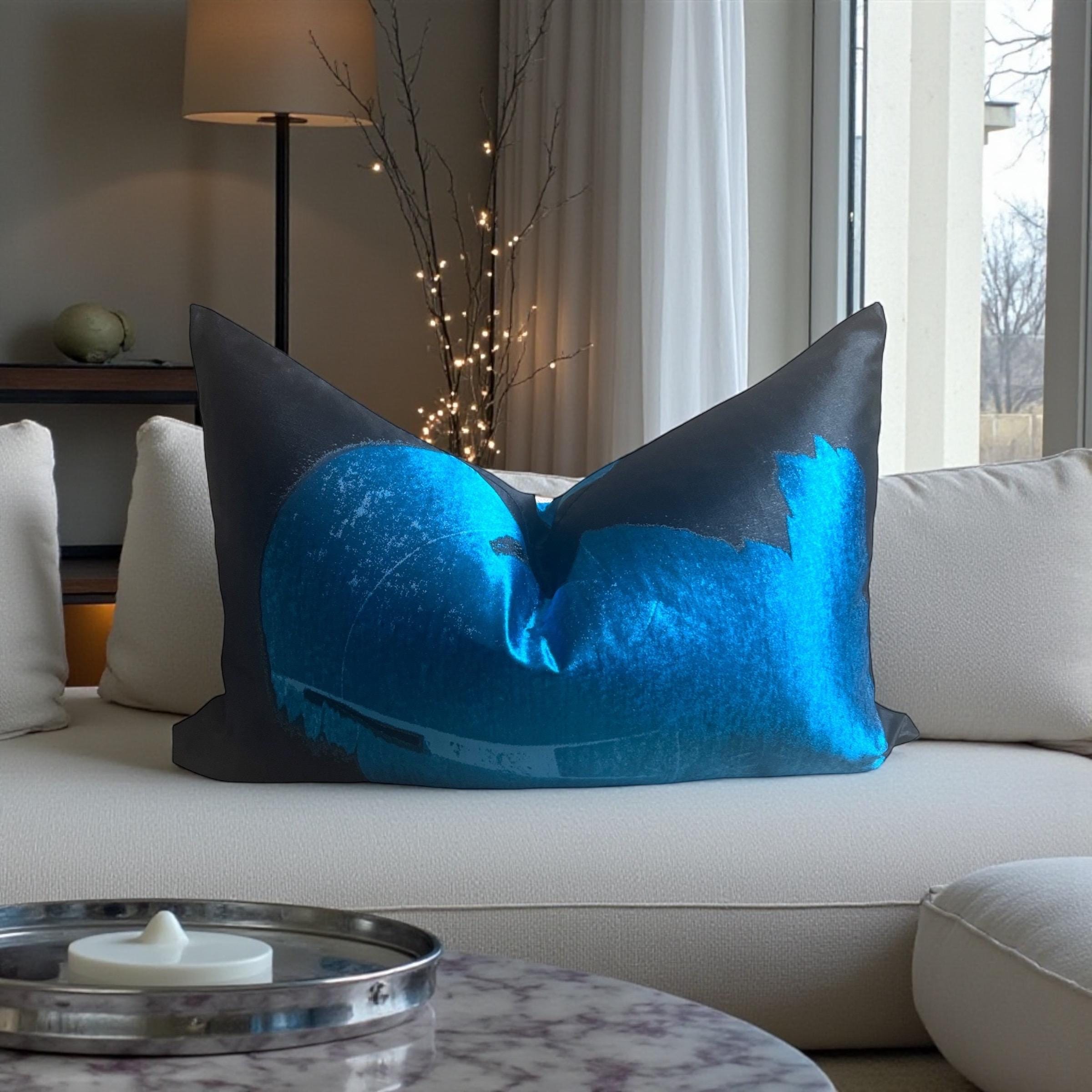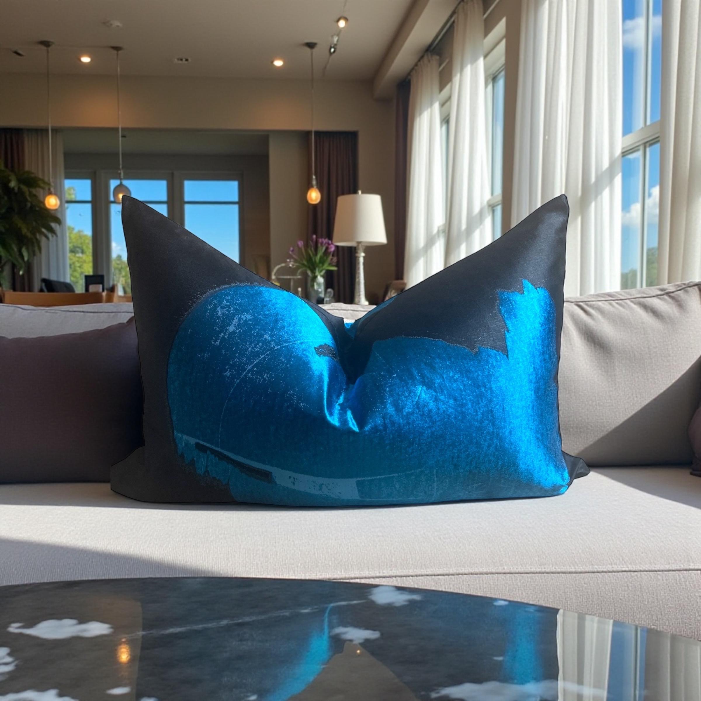 This striking abstract design in deep black and luminous vibrant blue creates a dramatic yet refined statement. The natural sheen of premium silk enhances every brushstroke and color transition, giving the pillow a living, almost sculptural presence that changes beautifully with the light.