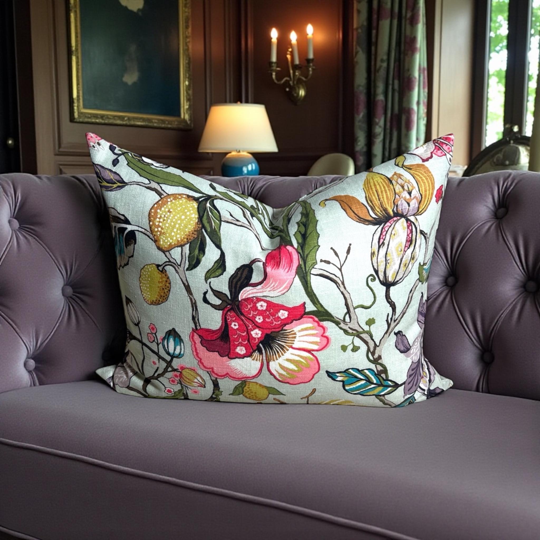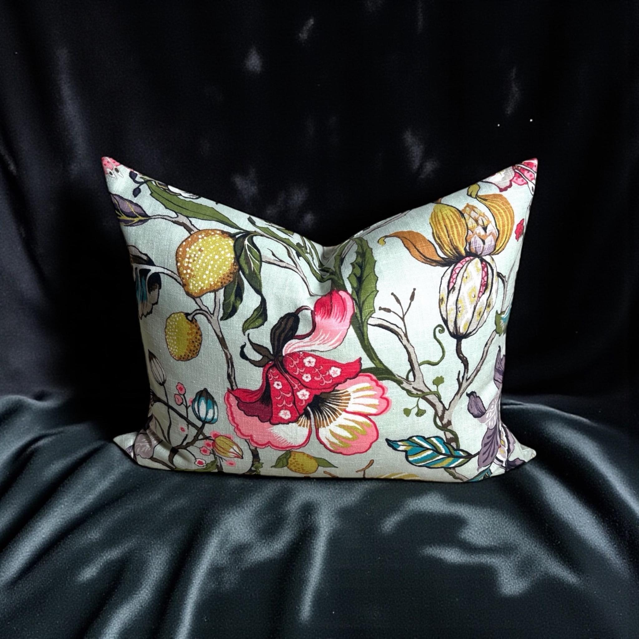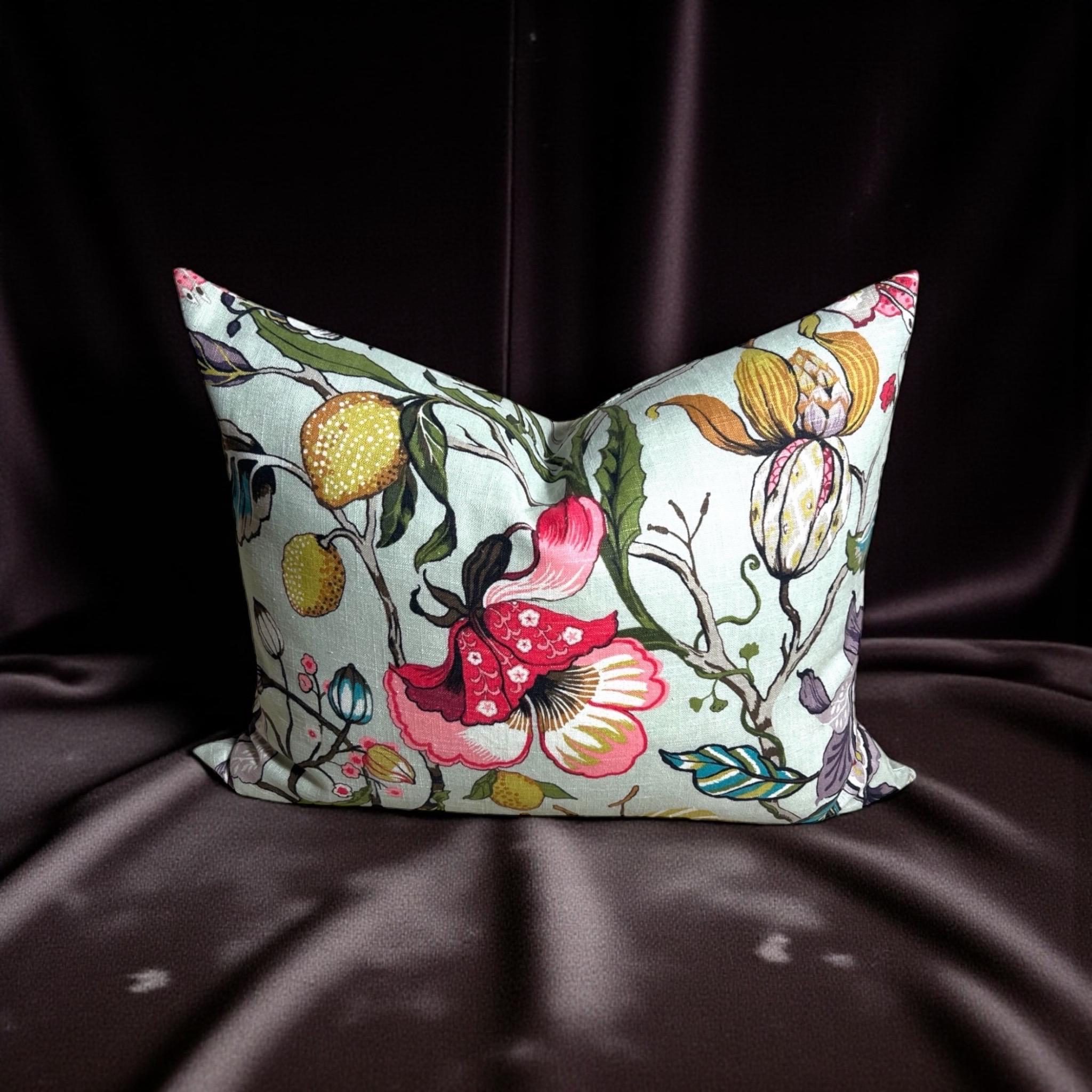 Add a touch of elegance and vibrant color to your home with this handmade linen pillow cover, crafted from the stunning Fabricut Euphorbia designer fabric. Featuring a rich green and multicolor floral pattern, this 20 x 26 inch rectangular decorative cushion cover is perfect for styling a sofa, bed, or armchair with a refined, high-end look.