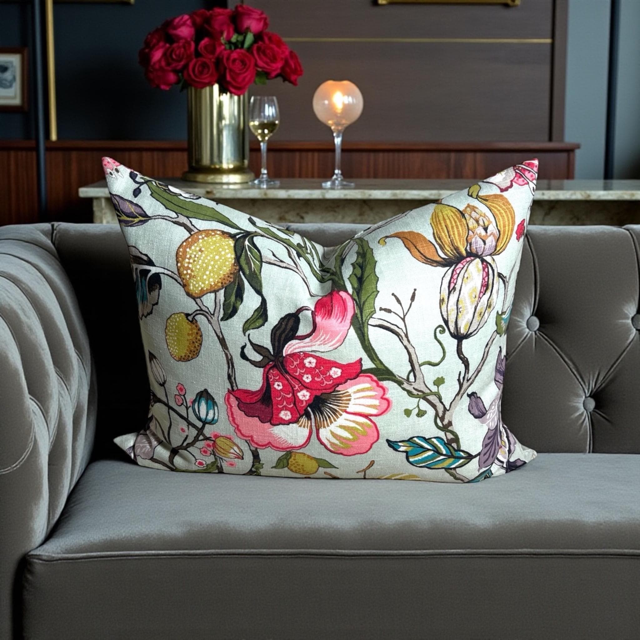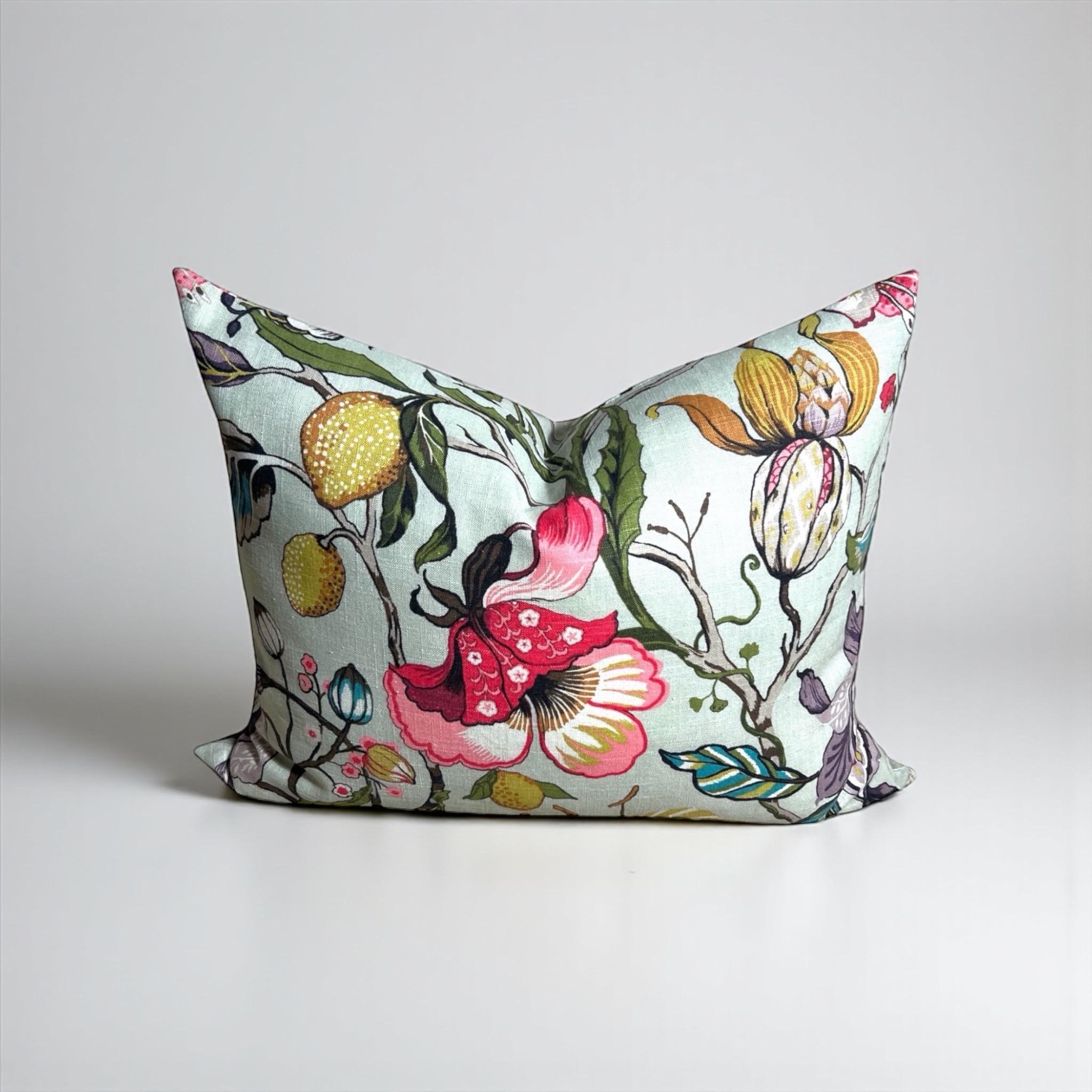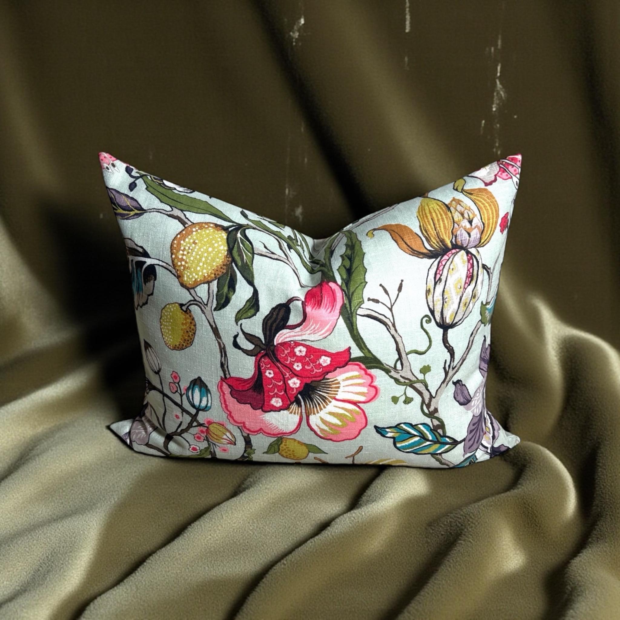 Add a touch of elegance and vibrant color to your home with this handmade linen pillow cover, crafted from the stunning Fabricut Euphorbia designer fabric. Featuring a rich green and multicolor floral pattern, this 20 x 26 inch rectangular decorative cushion cover is perfect for styling a sofa, bed, or armchair with a refined, high-end look.