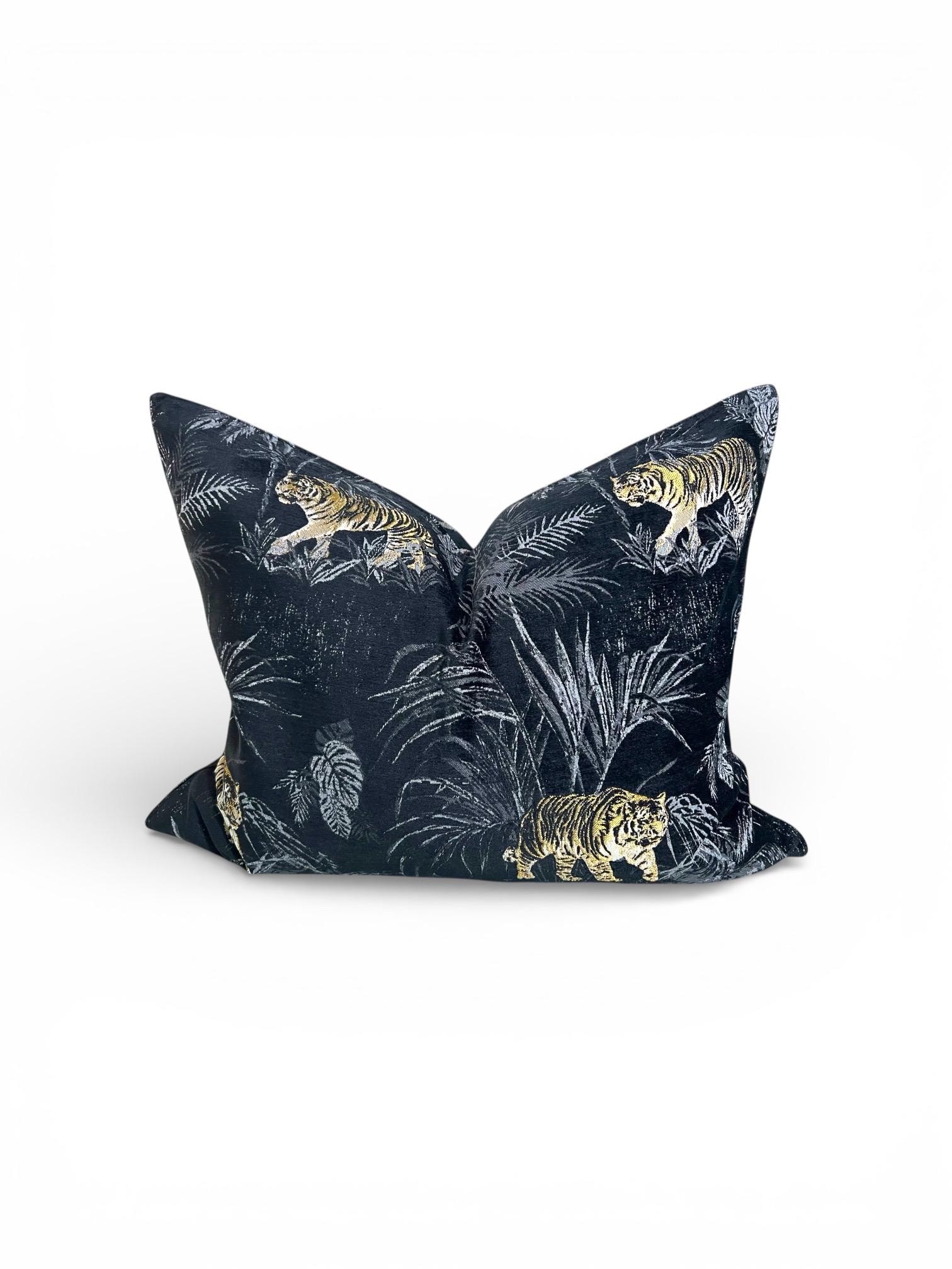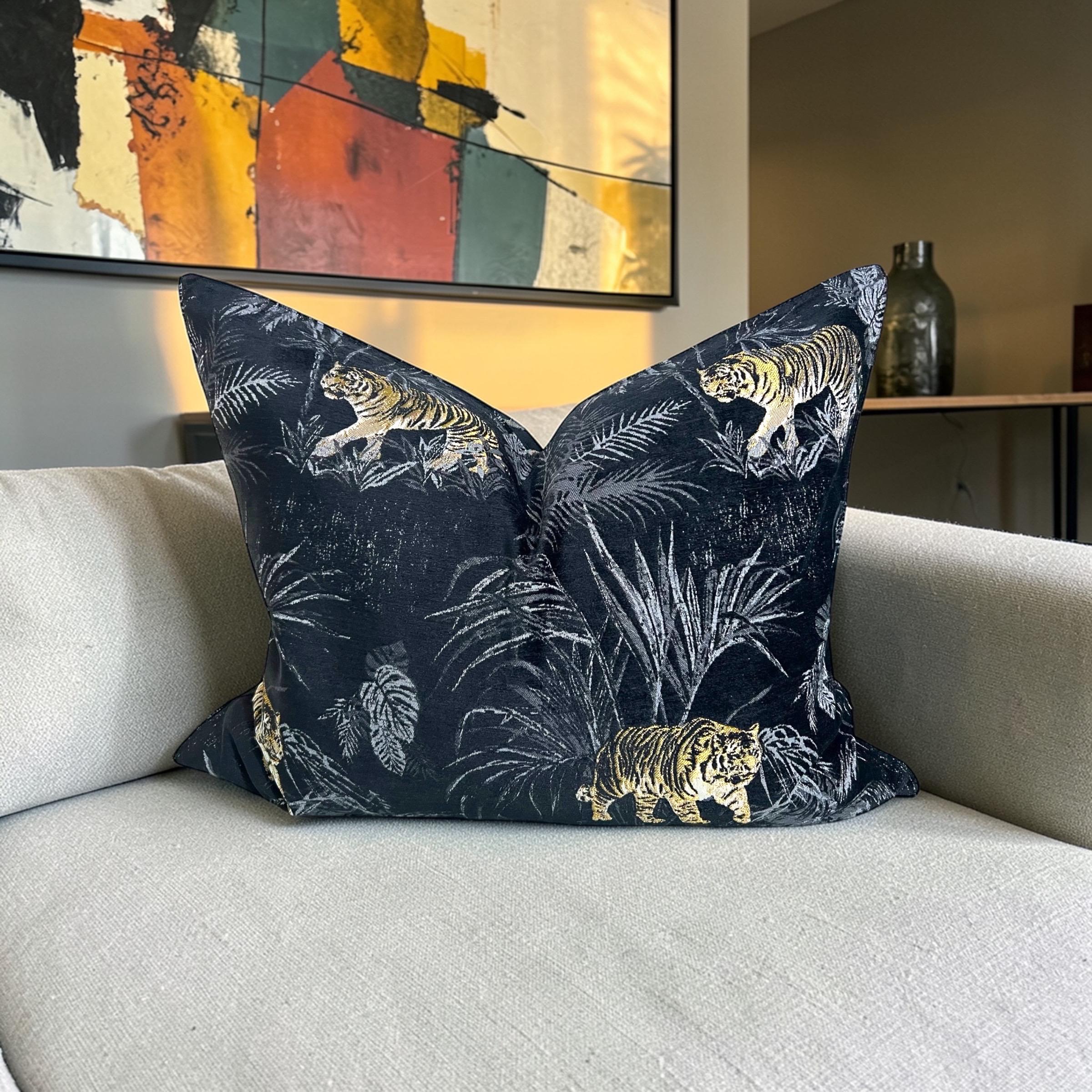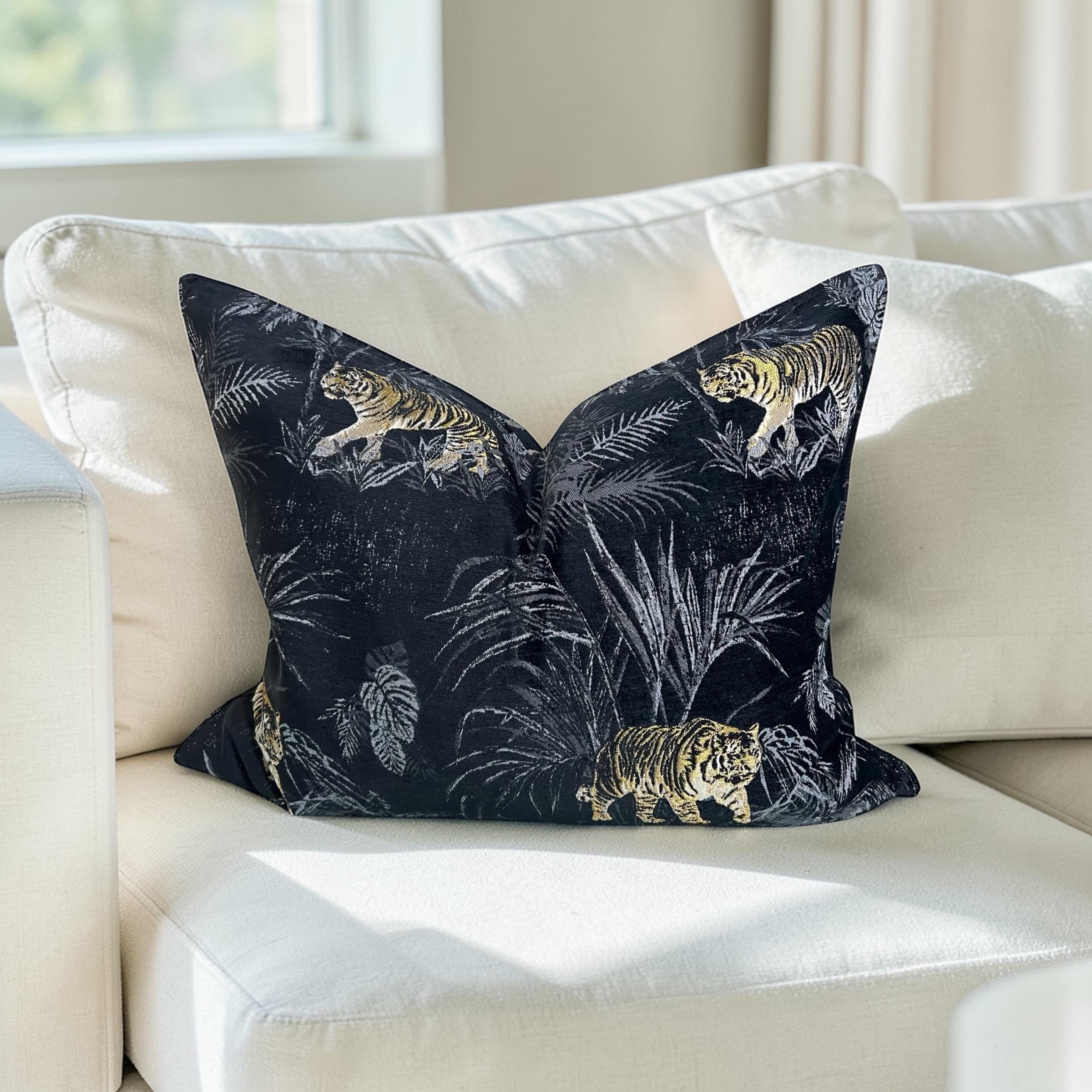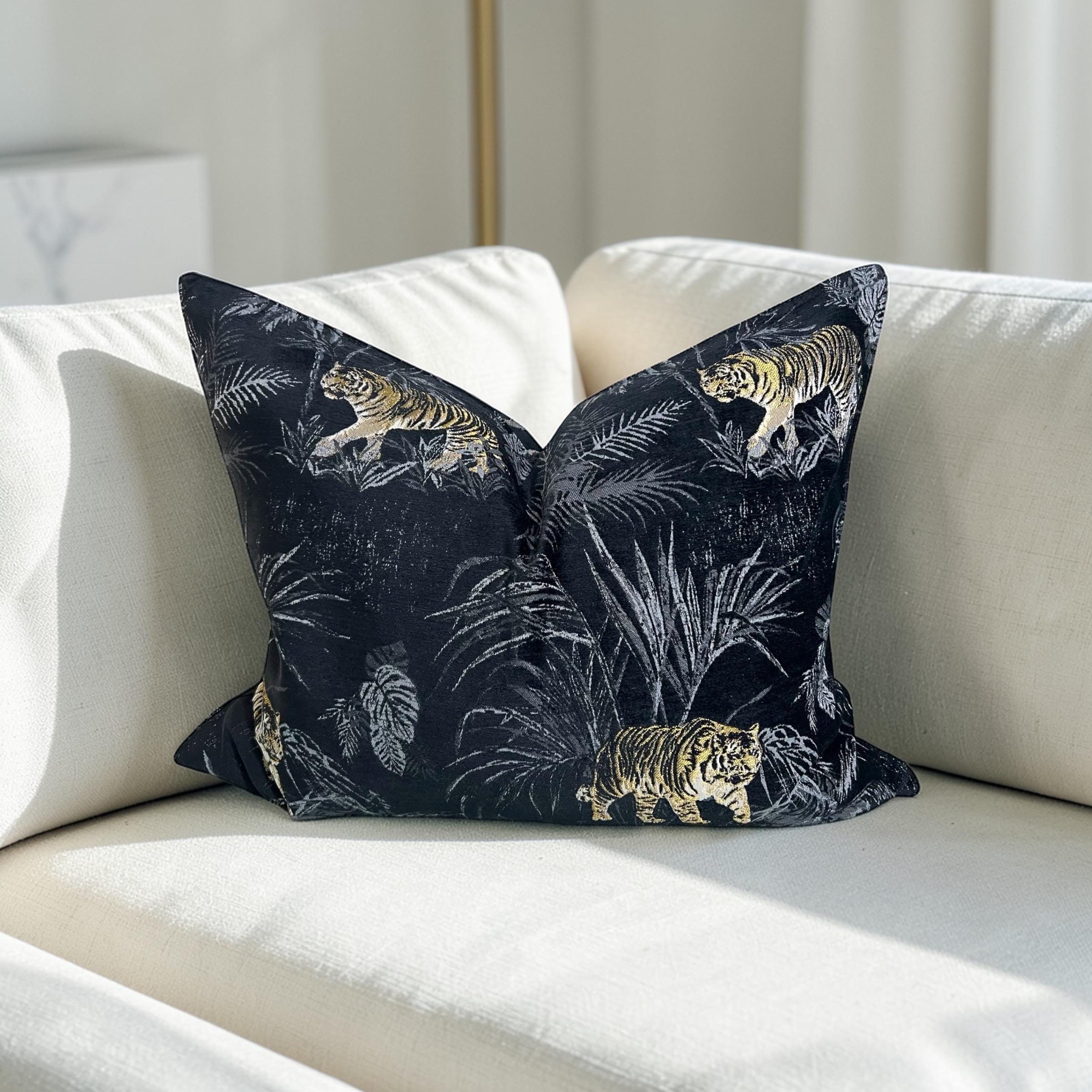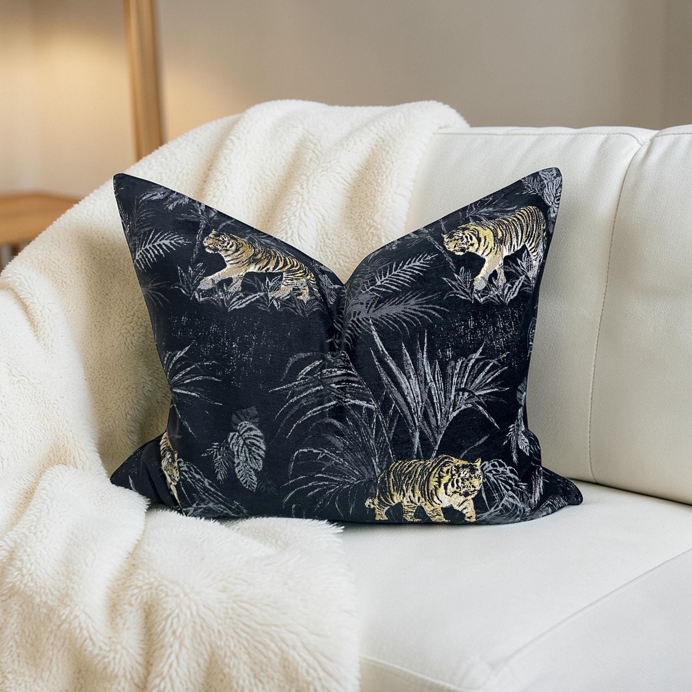Add VirginiaDesigns gold and Black to your decor with this stunning velvet Bengal Tigers pillow cover. Made with Porter & Stone Sarangeti collection premium black chenille velvet which Tiger fabric features a solid black velvet background with golden lurex threads embroidered tigers, creating a beautiful and luxurious glow for the pillow.