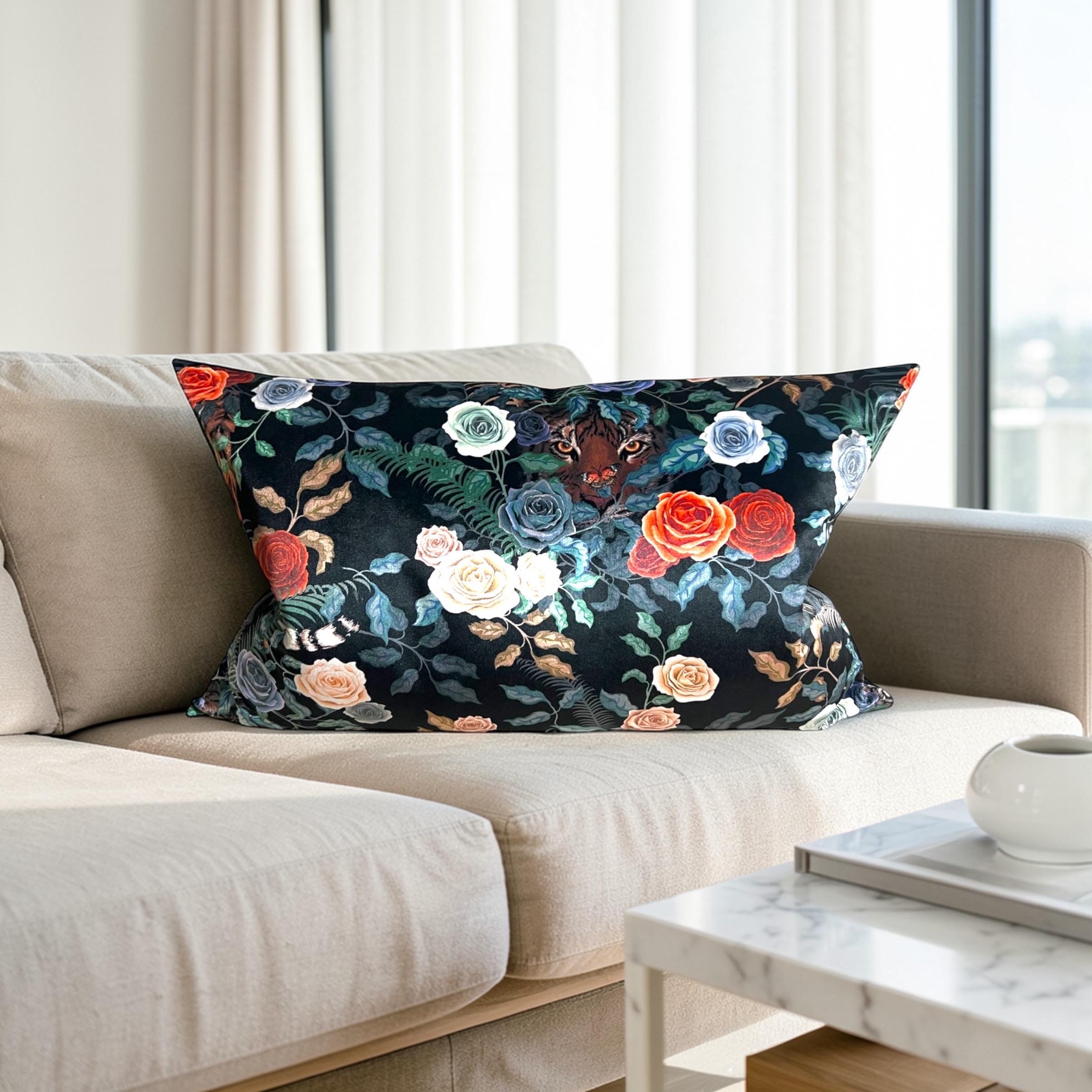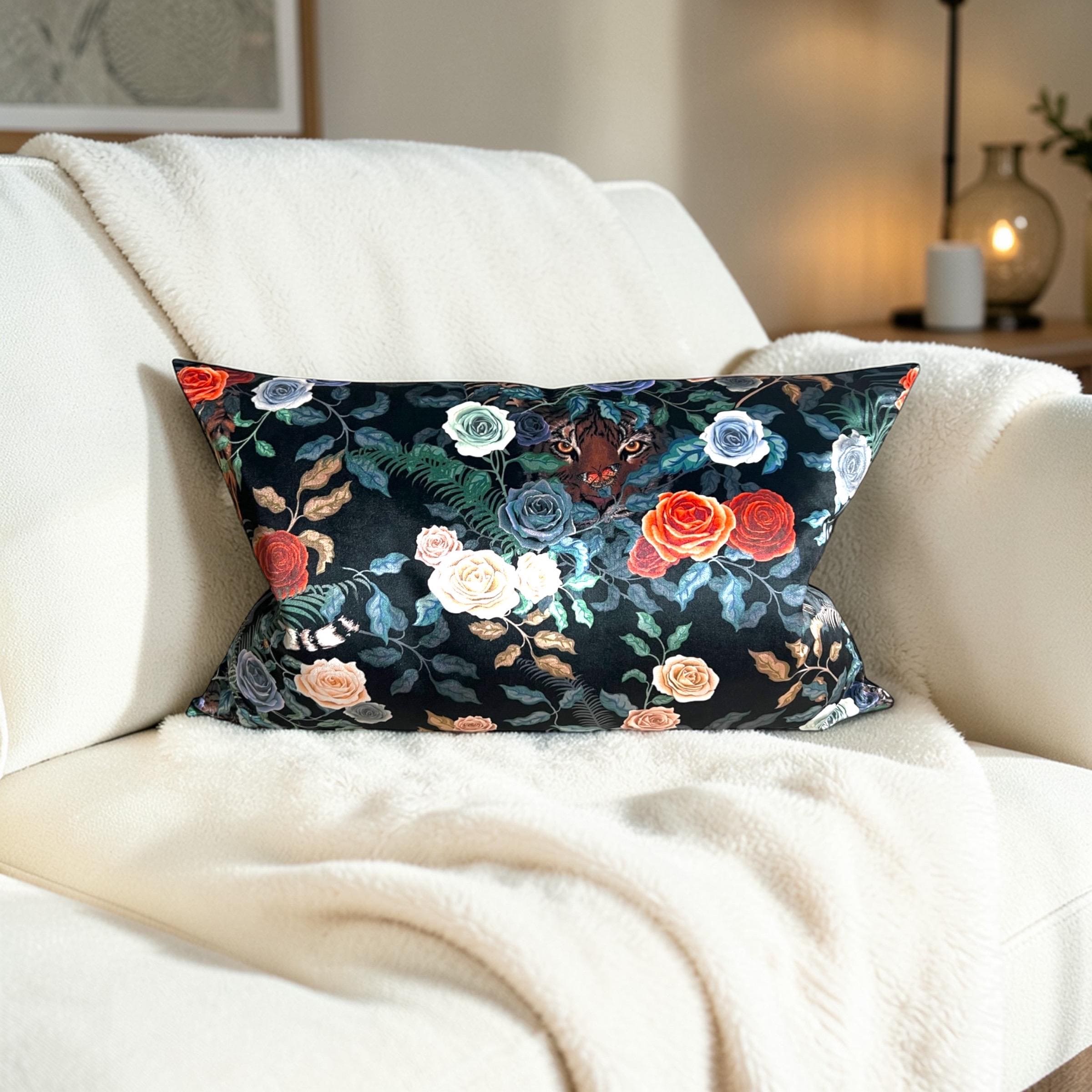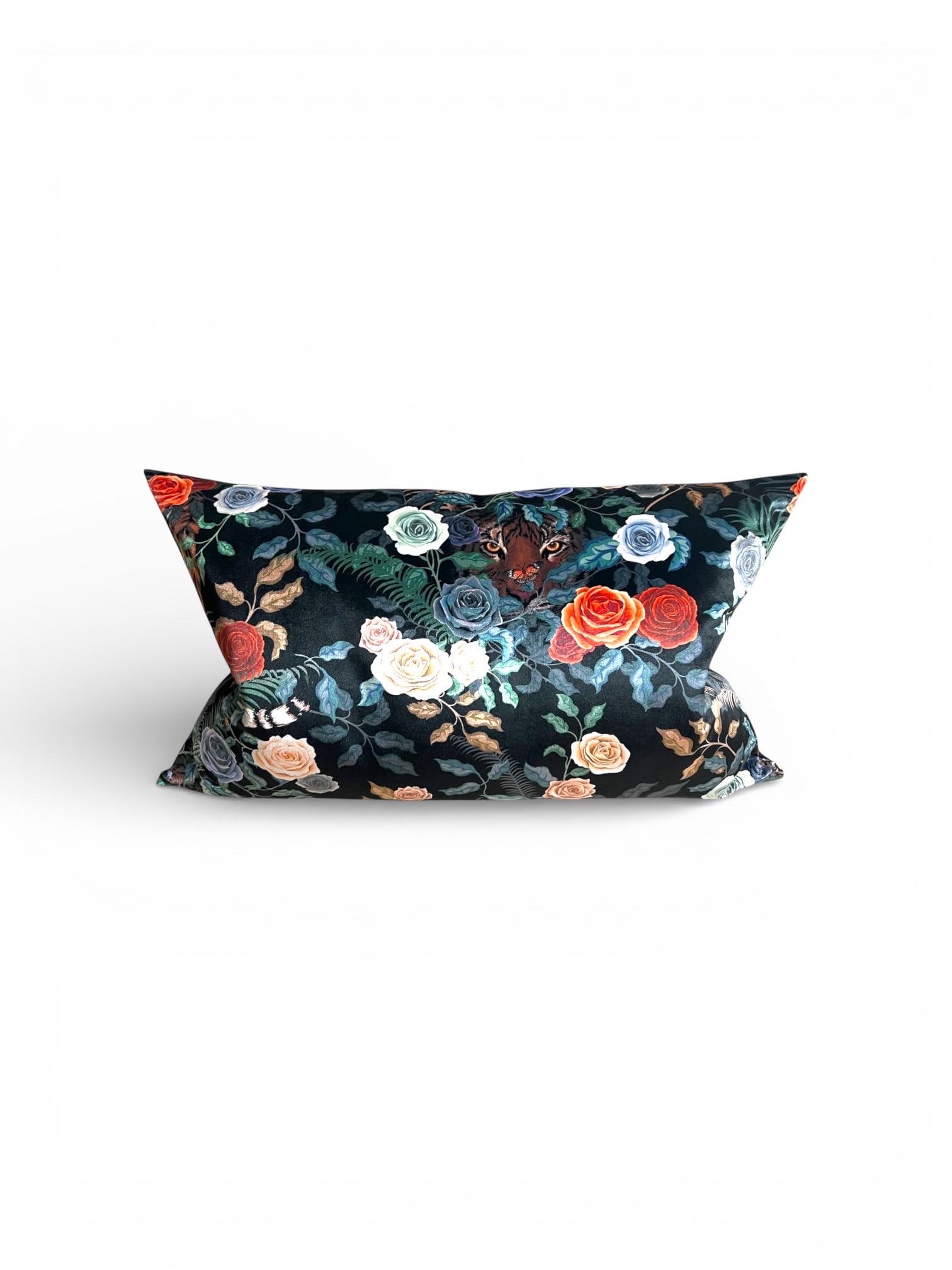 Elevate your home decor with this stunning my handmade decorative pillow, crafted from the exclusive ‘Bengal Rose Garden in Fierce’ fabric designed by British artist Becca Who. This unique, dark floral pillow showcases vibrant roses and lush foliage, accented by a hidden tiger, bringing an exotic and luxurious touch to your space.