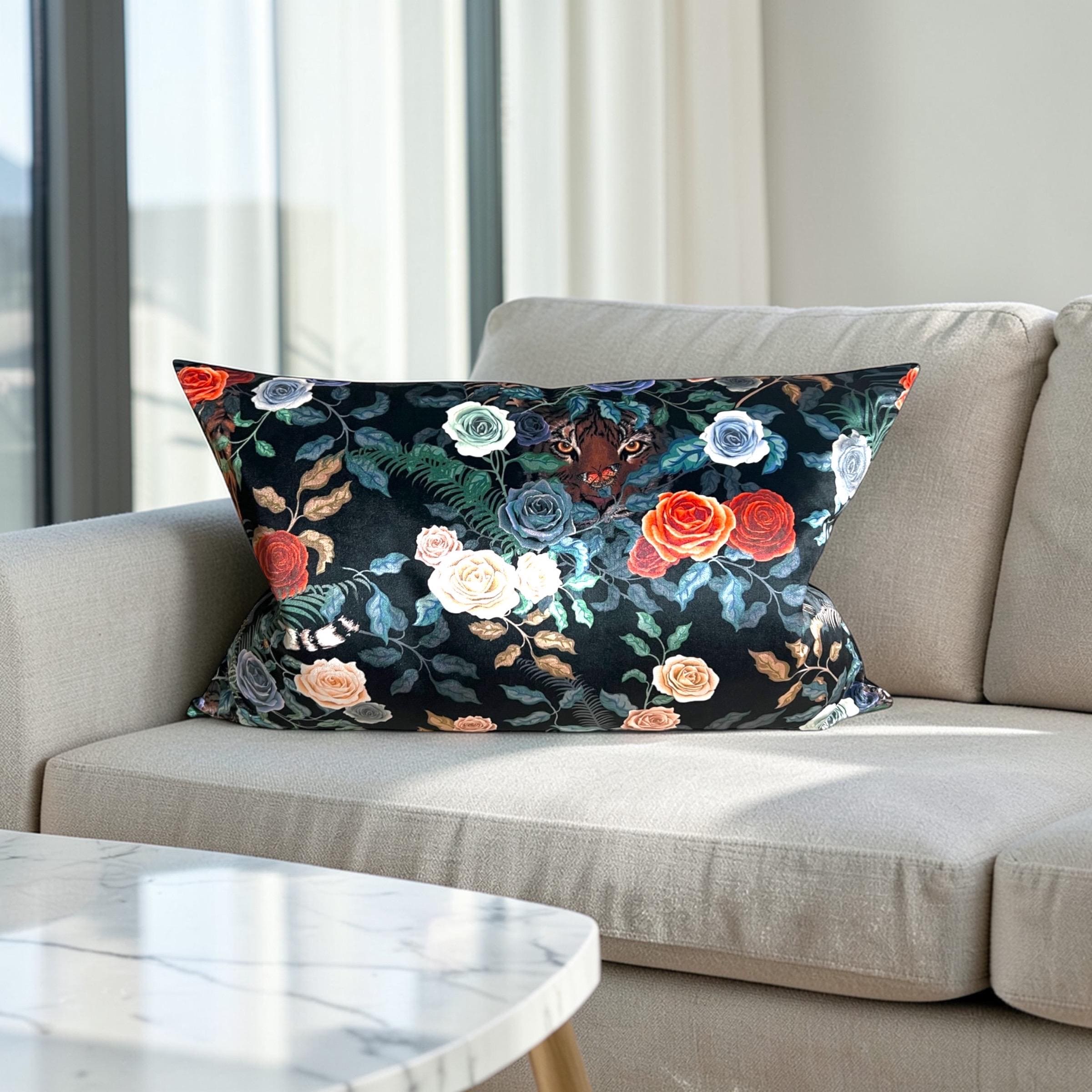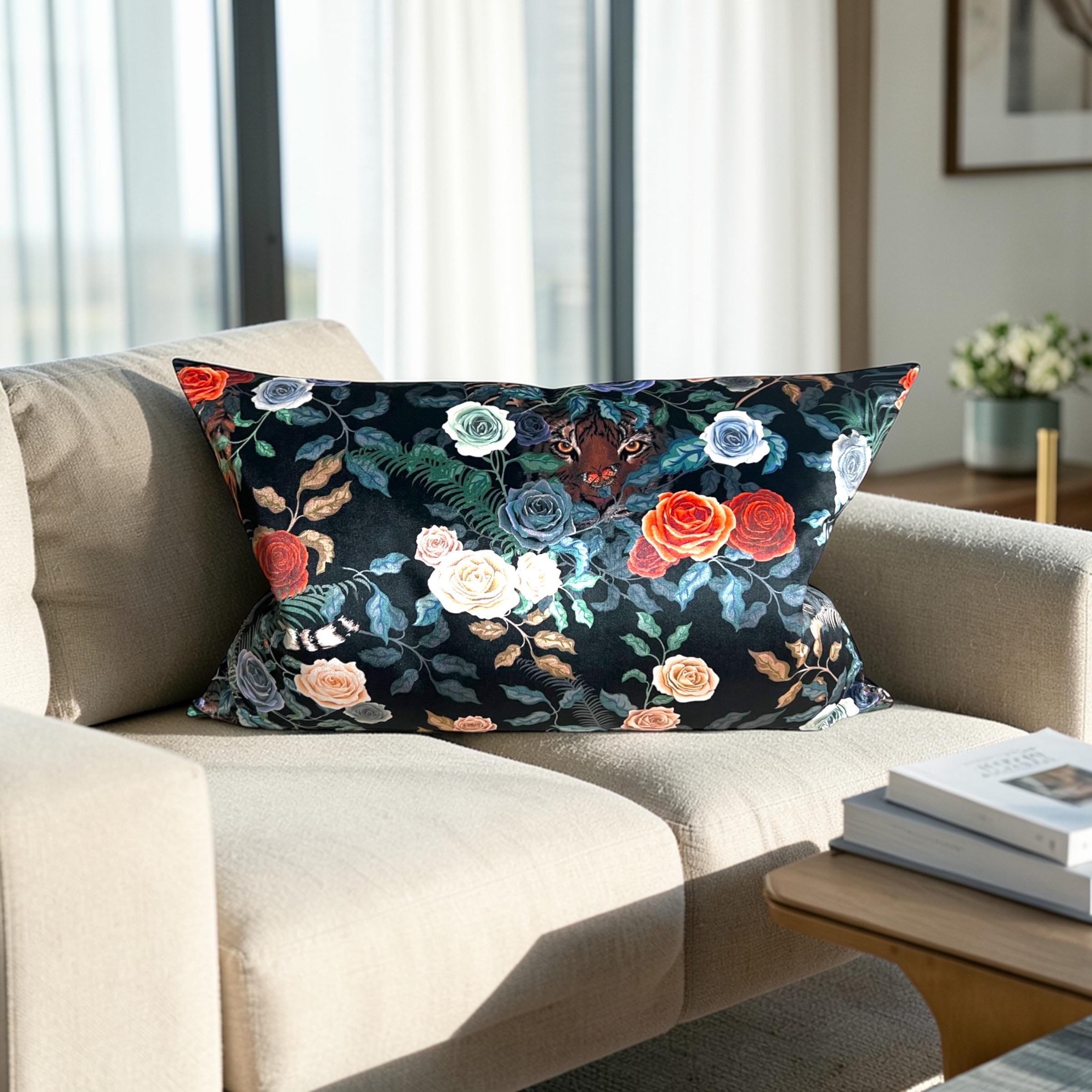 Luxury Handmade Bengal Tiger Velvet Lumbar Pillow Cover: Floral Jungle Decor
