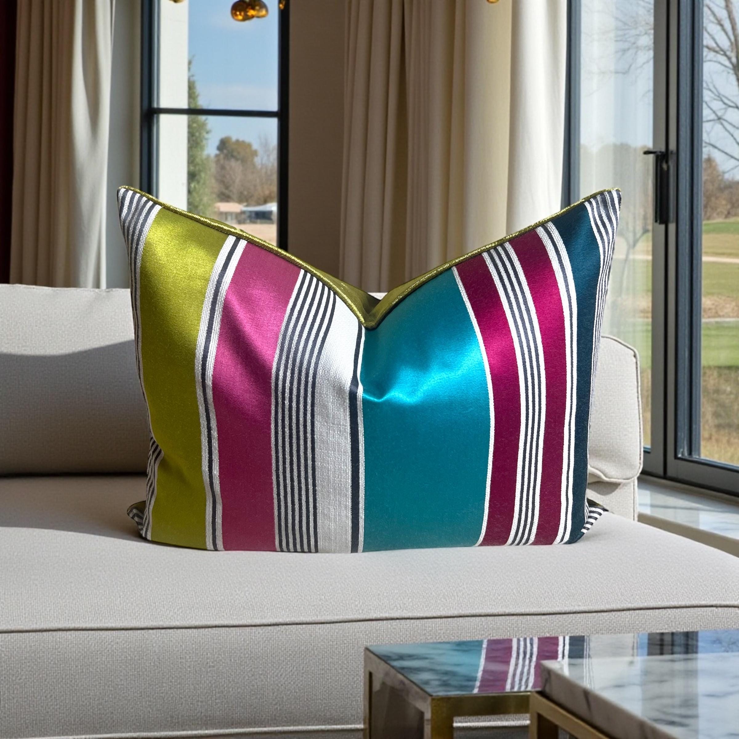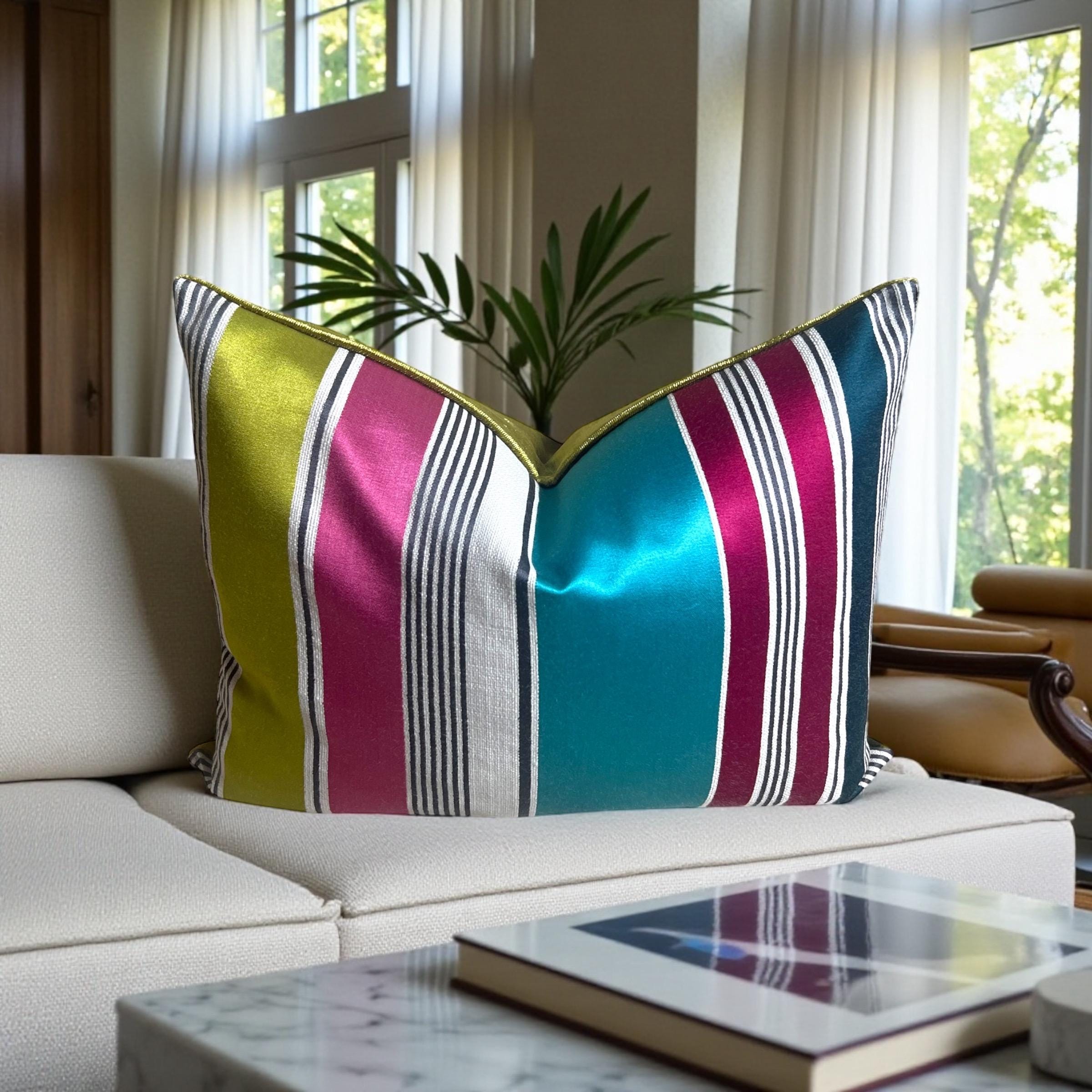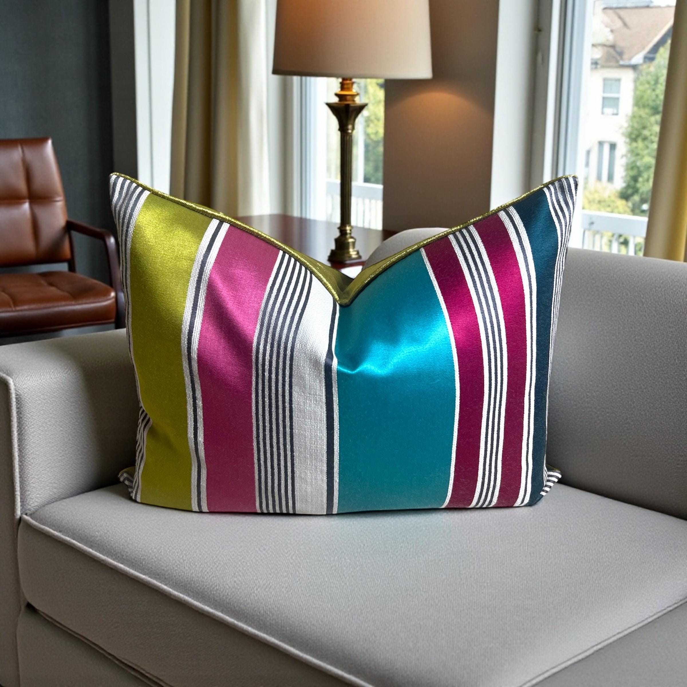 Luxury Striped Cotton Silk Pillow Cover 15x19 | Designer Accent Cushion | Velvet Back | Handmade