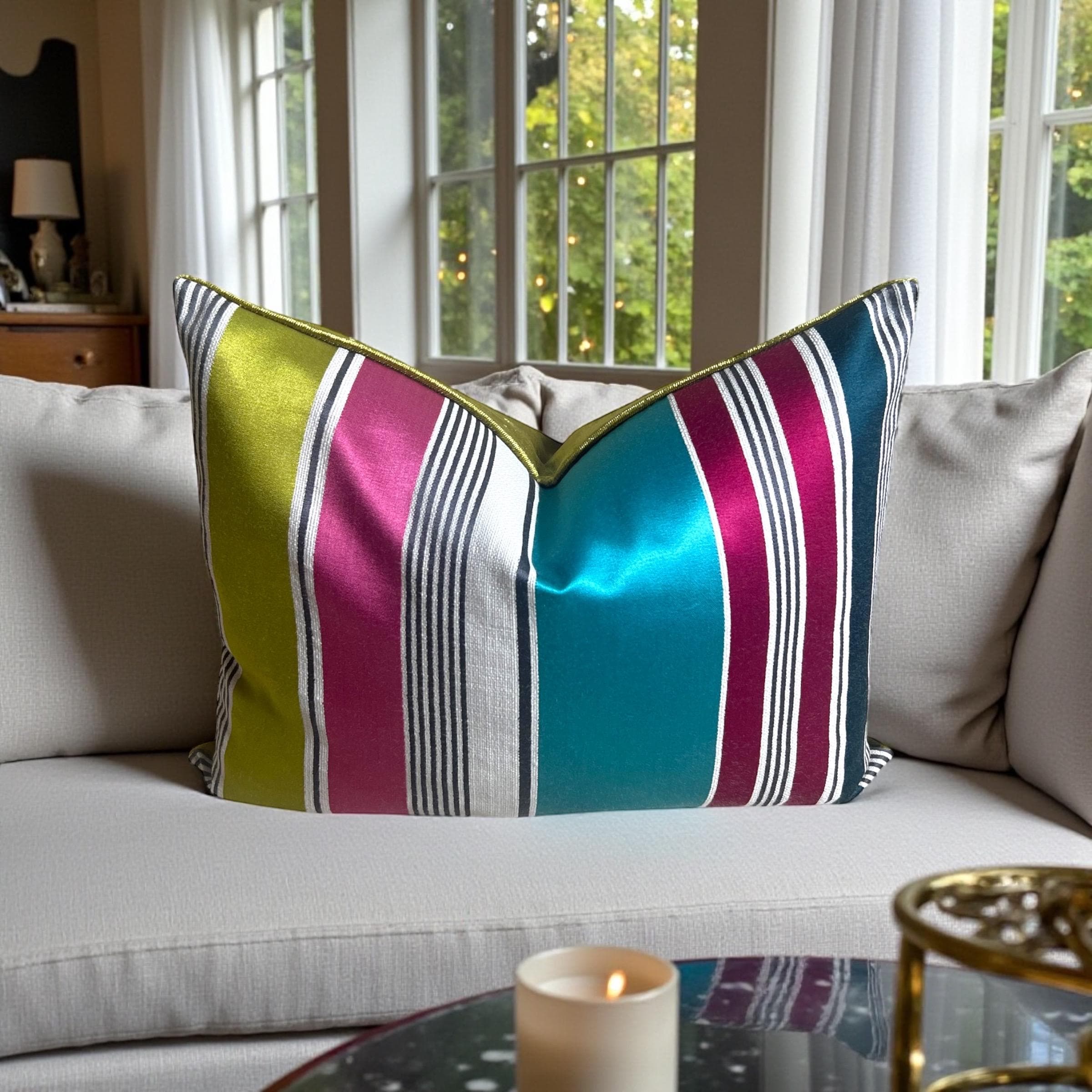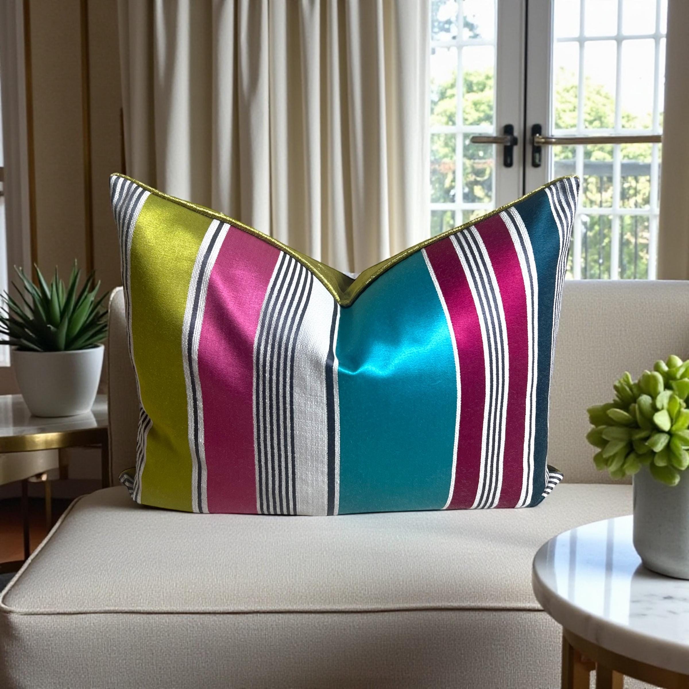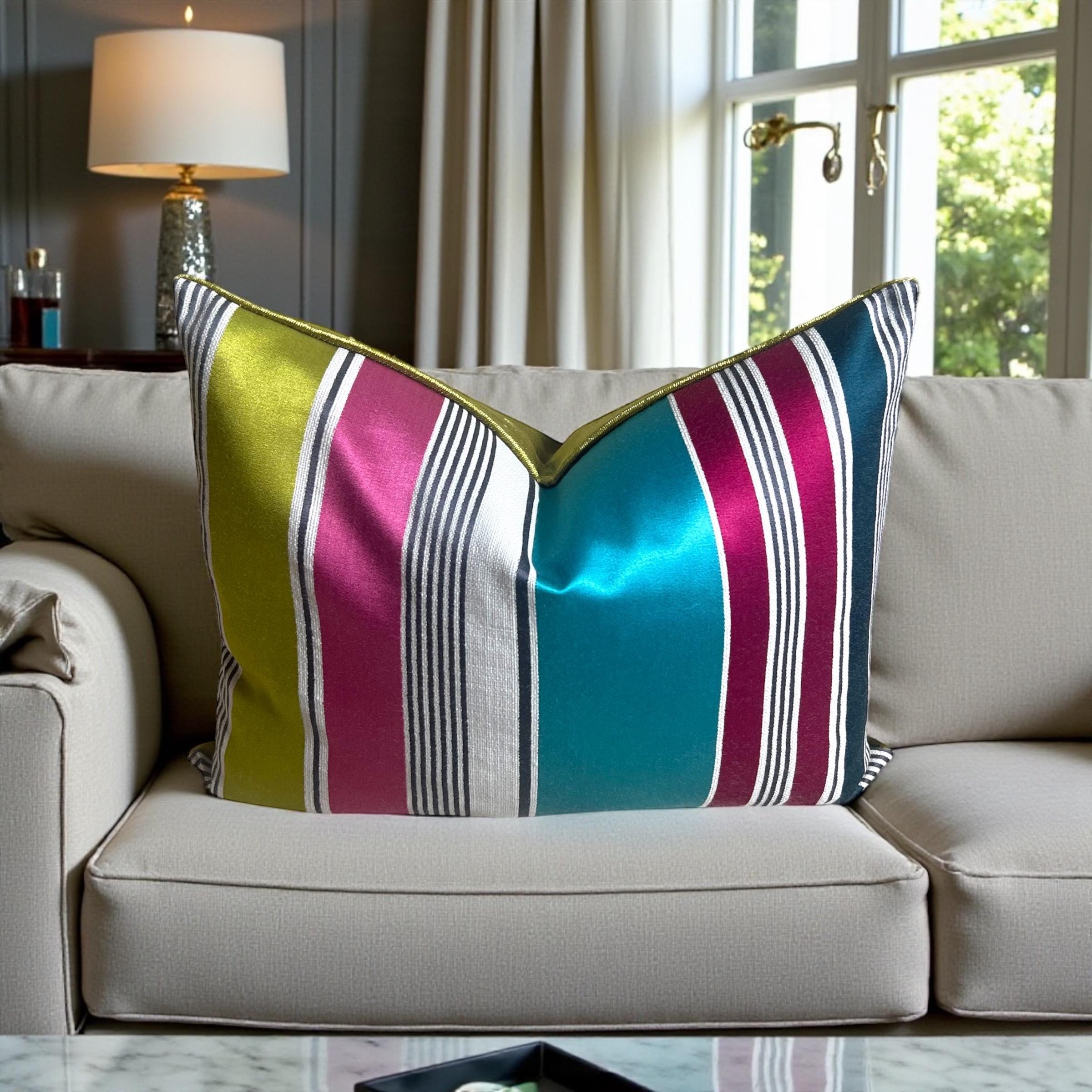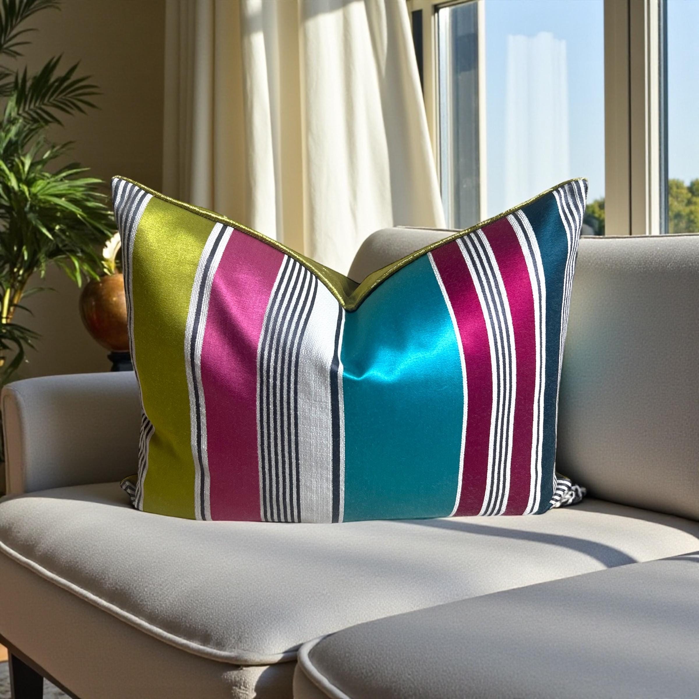 Luxury Striped Cotton Silk Pillow Cover 15x19 | Designer Accent Cushion | Velvet Back | Handmade