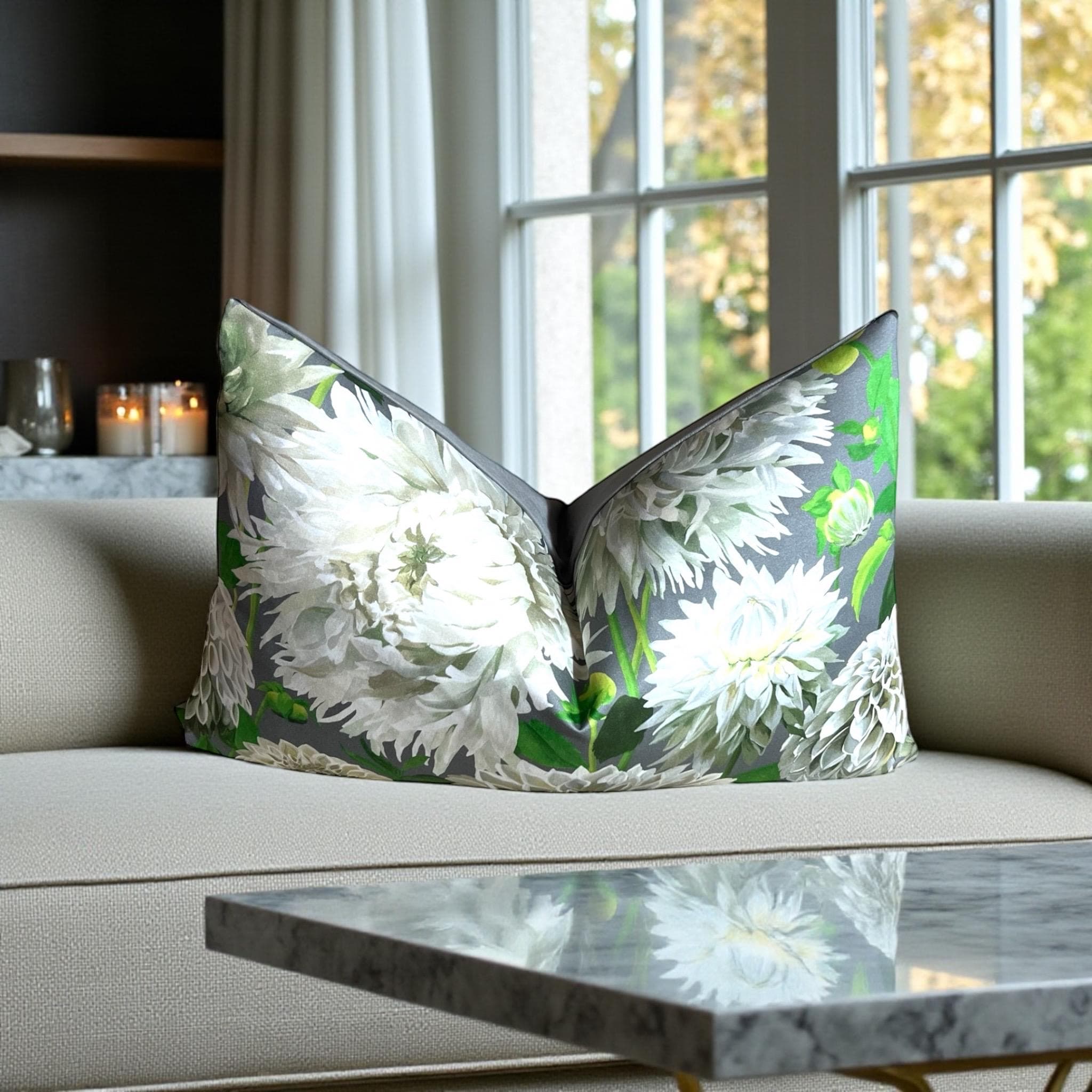 Elevate your interior with this exquisite handmade lumbar pillow cover, crafted from the iconic Harlequin Dahlia HQN2121081 designer fabric and paired with sumptuous Clarke & Clarke Alvar light grey velvet on the reverse.