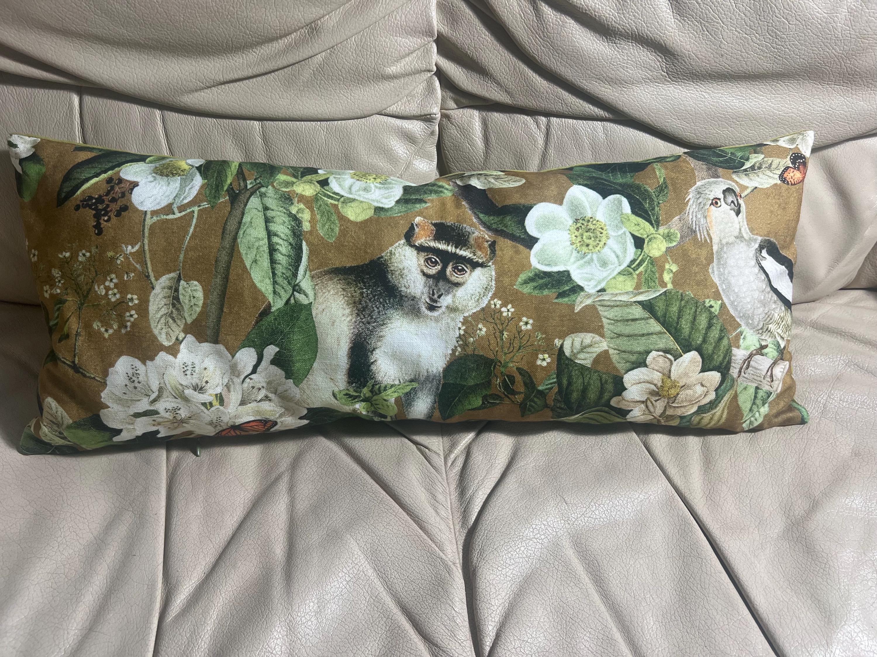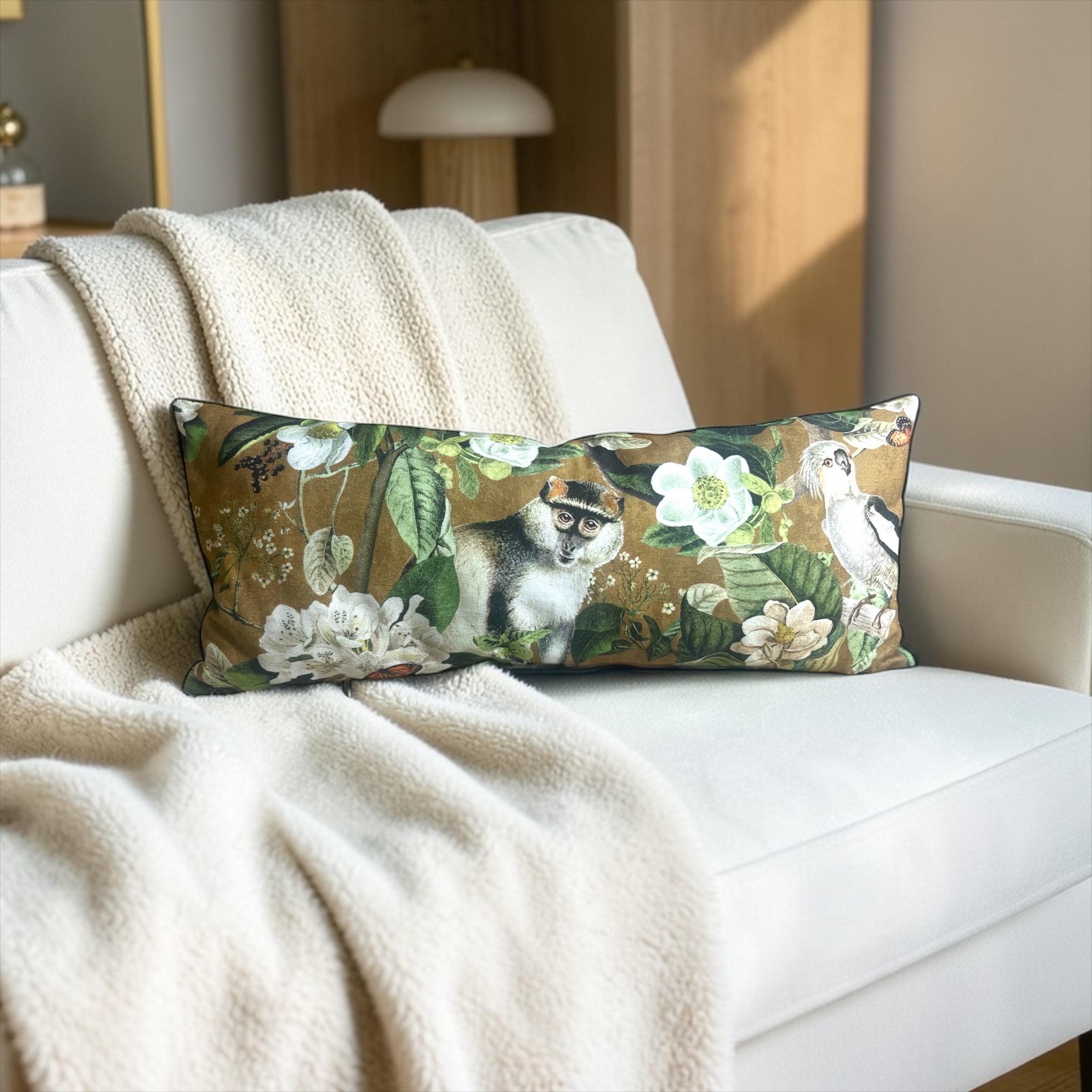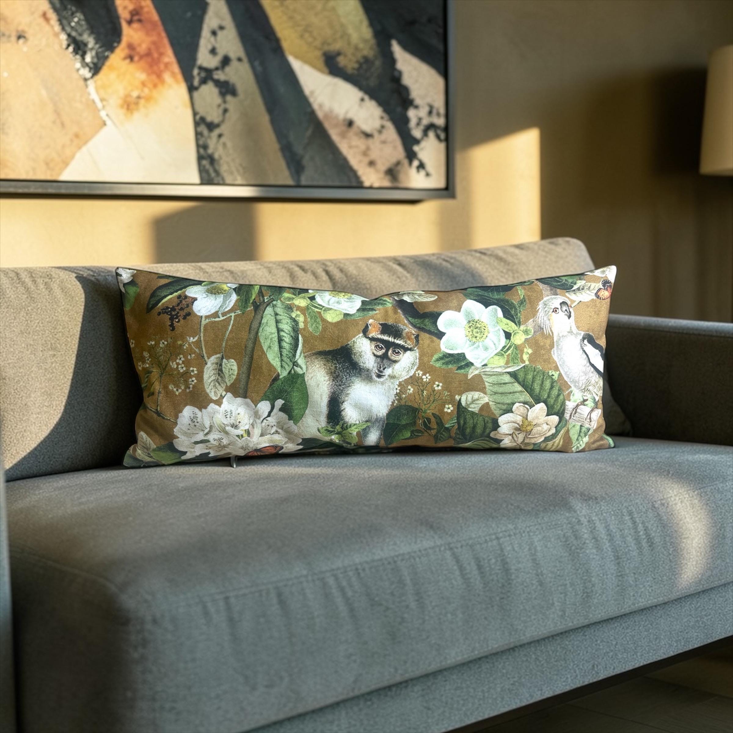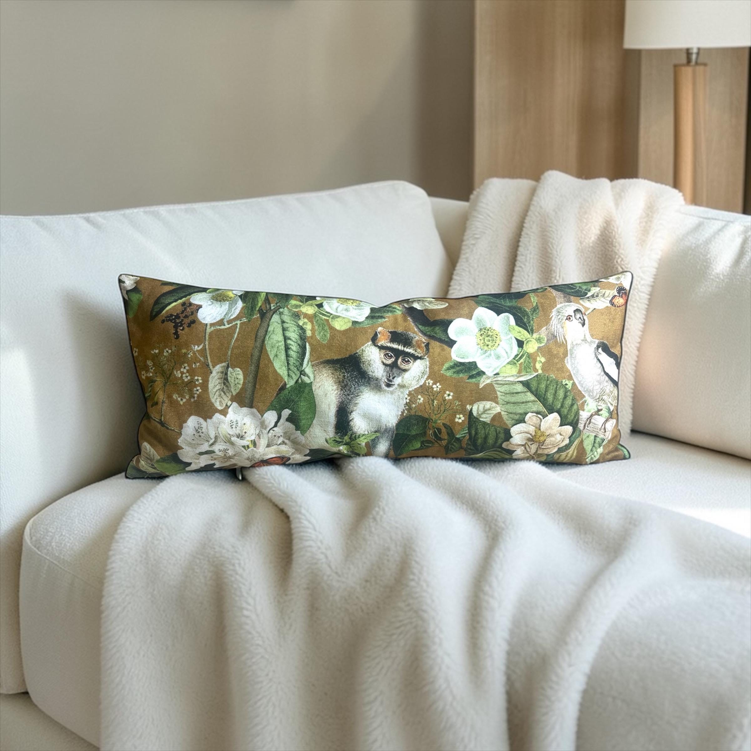 Luxury Lemur Jungle Velvet Lumbar Pillow Cover: Exotic Botanical Decor
