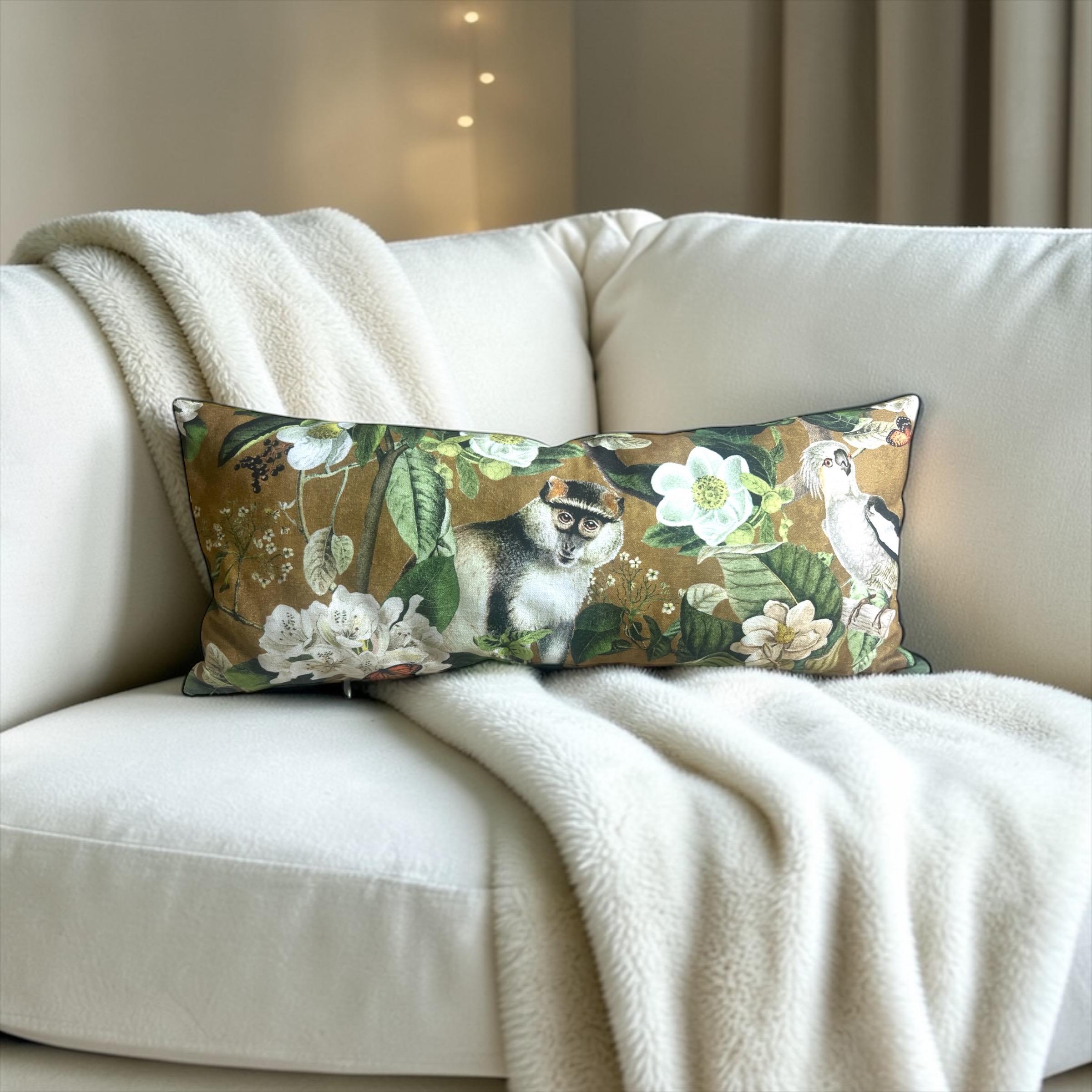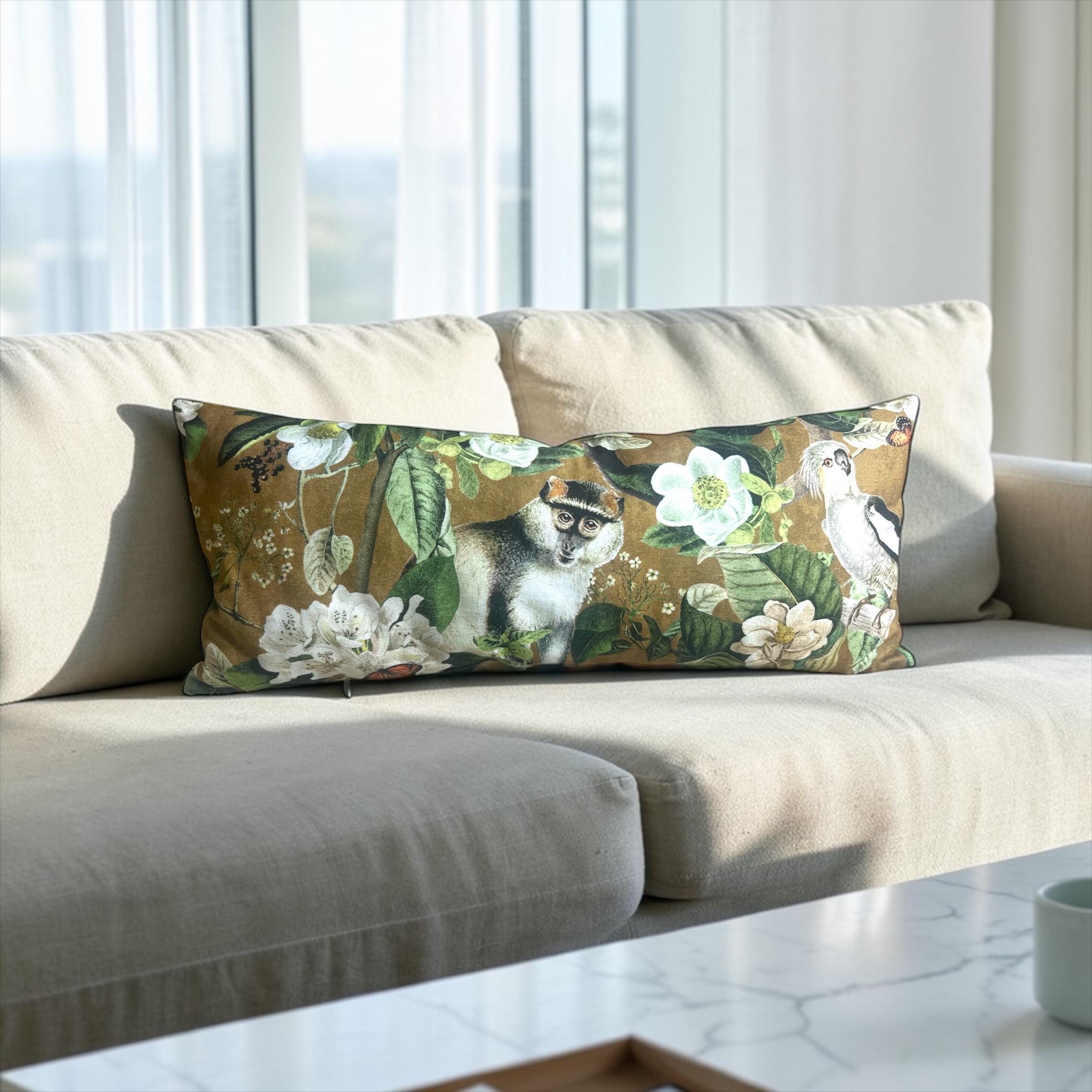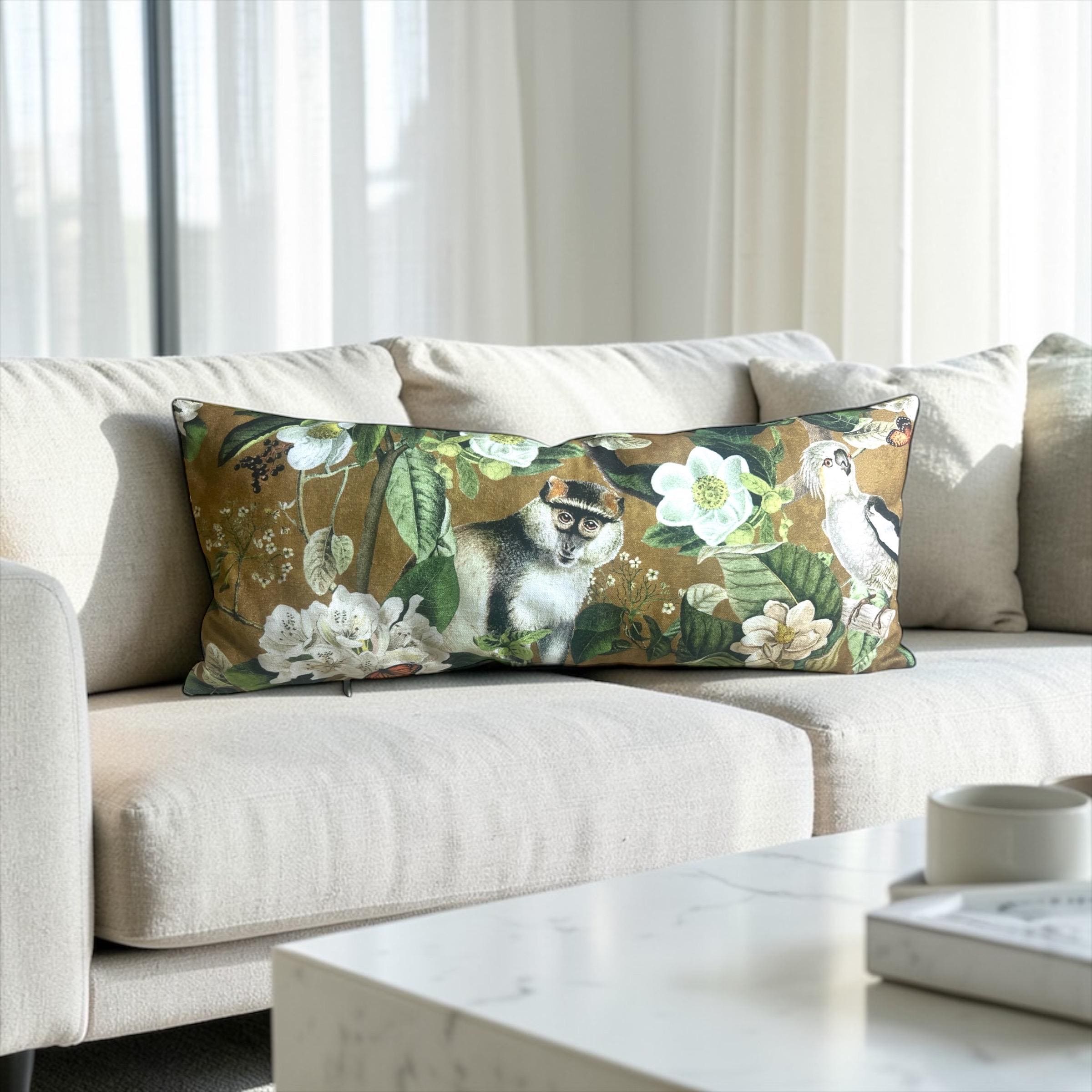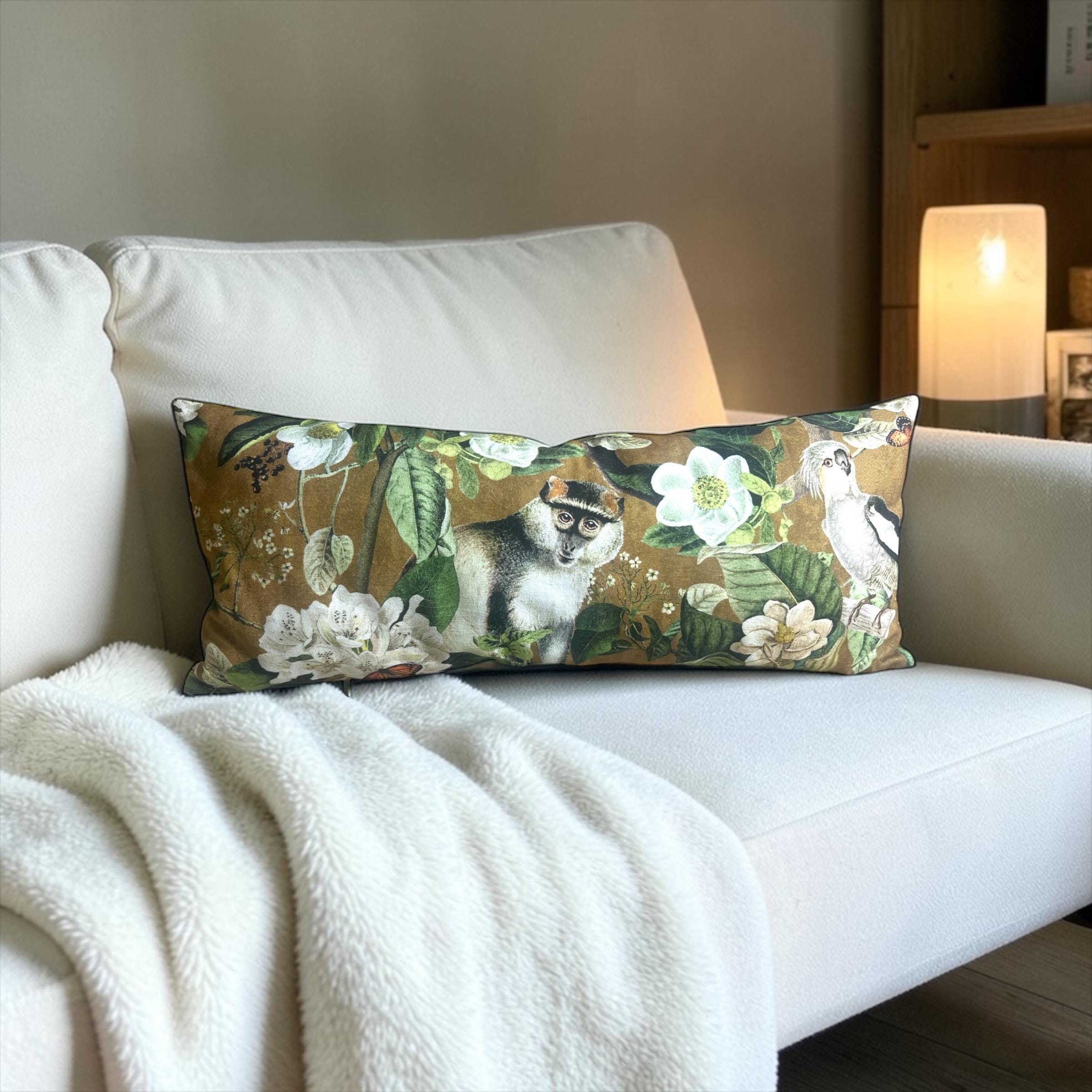 Luxury Lemur Jungle Velvet Lumbar Pillow Cover: Exotic Botanical Decor