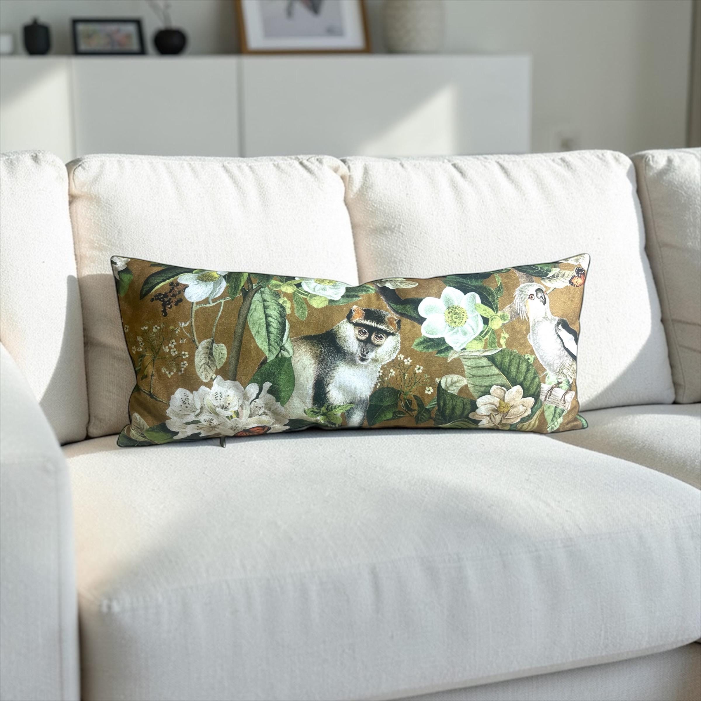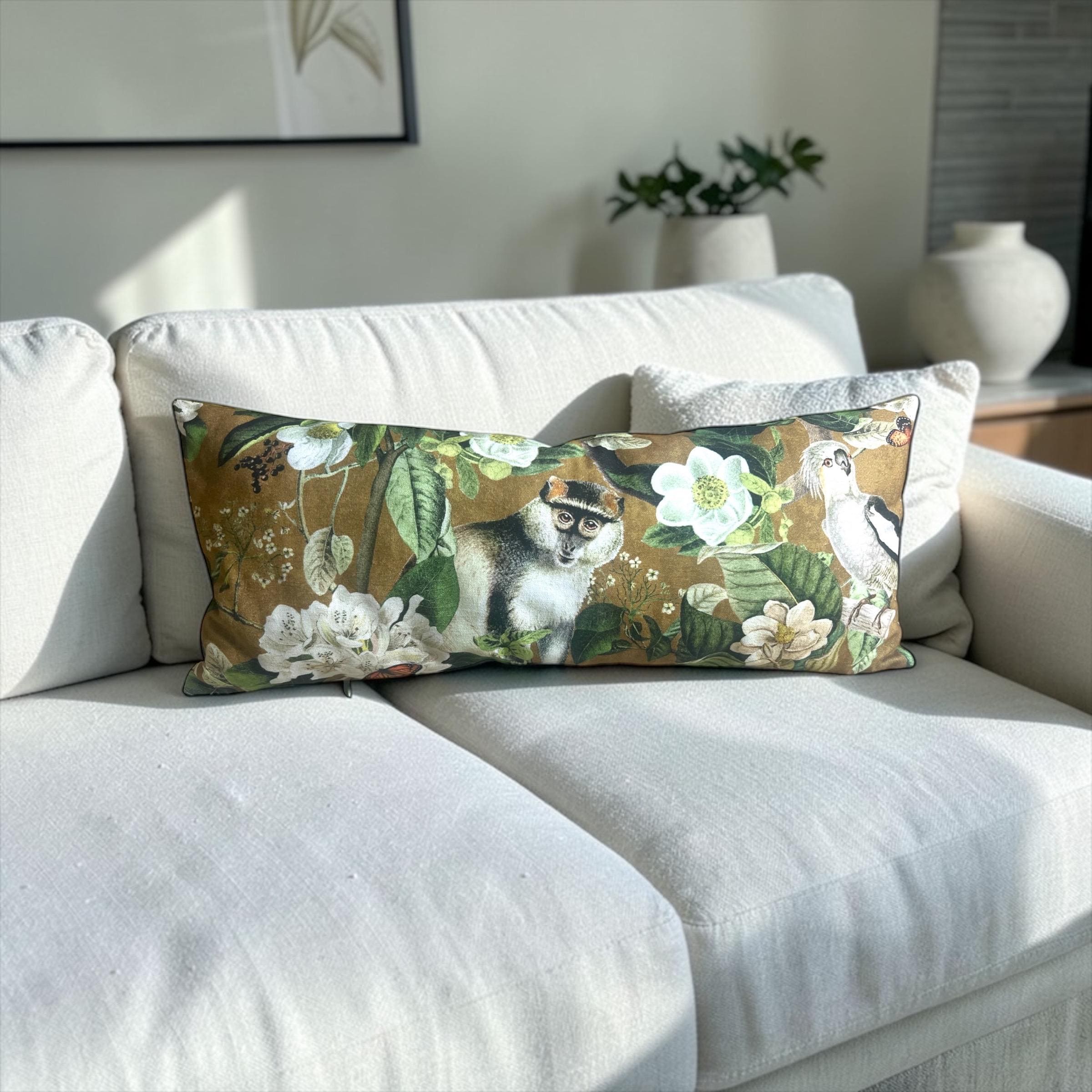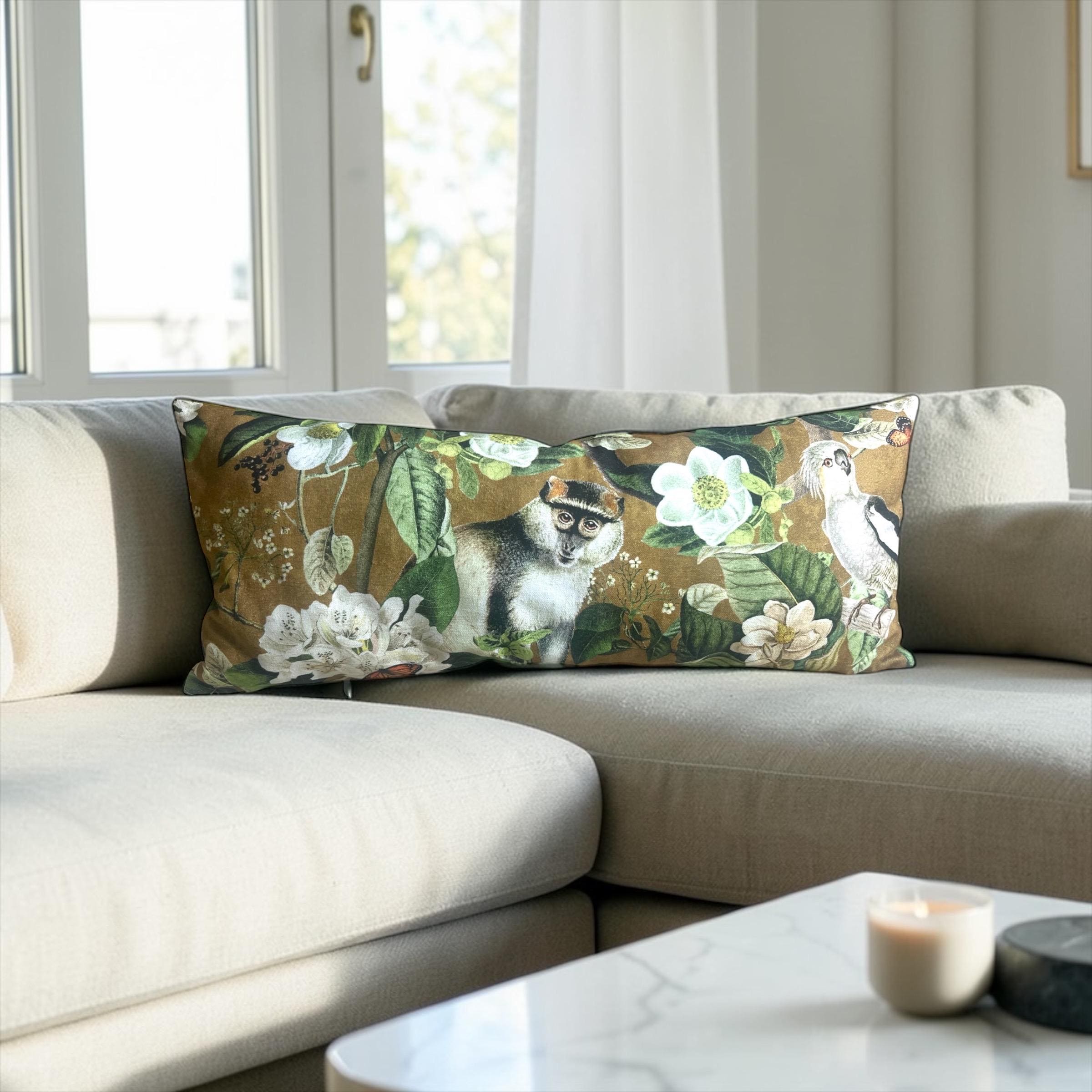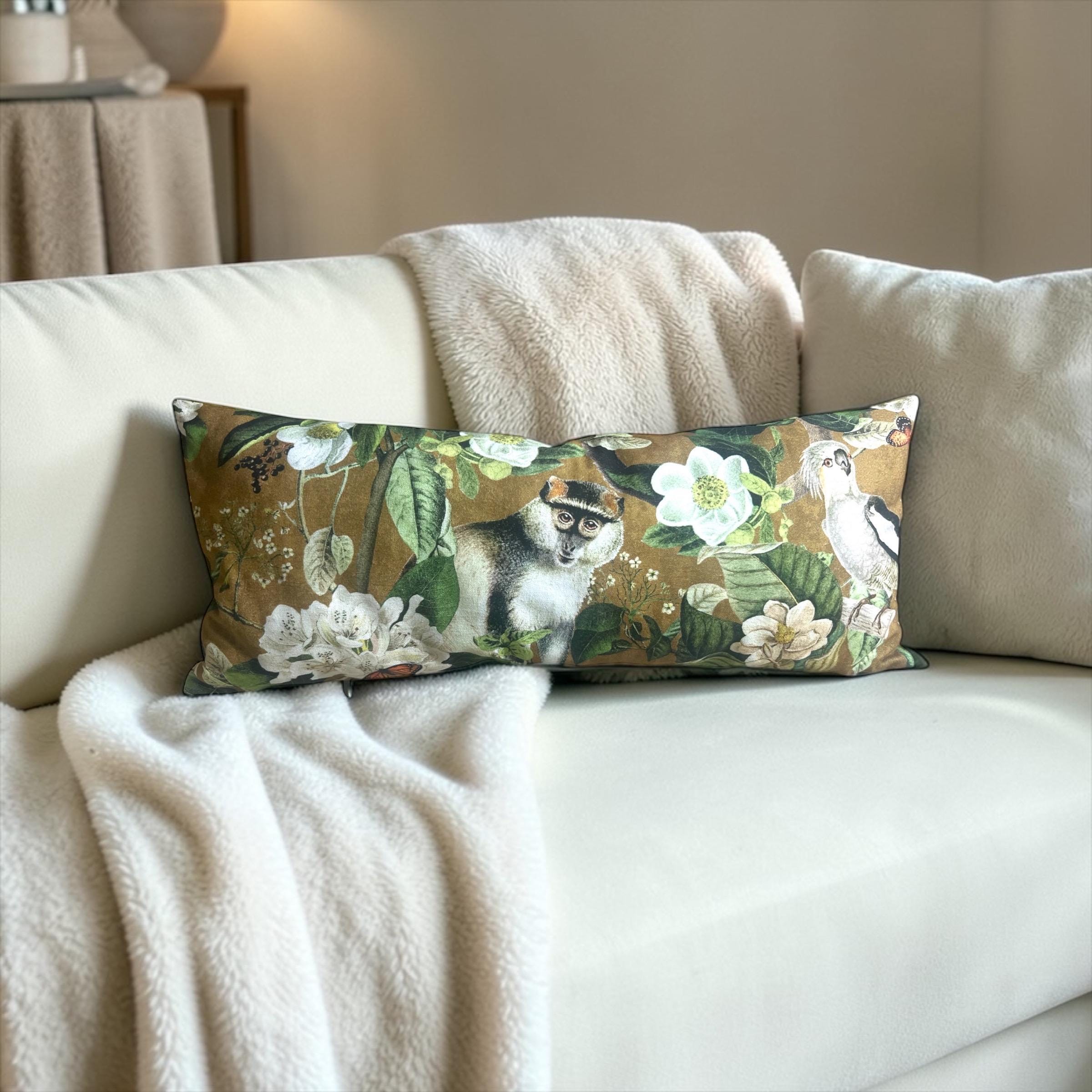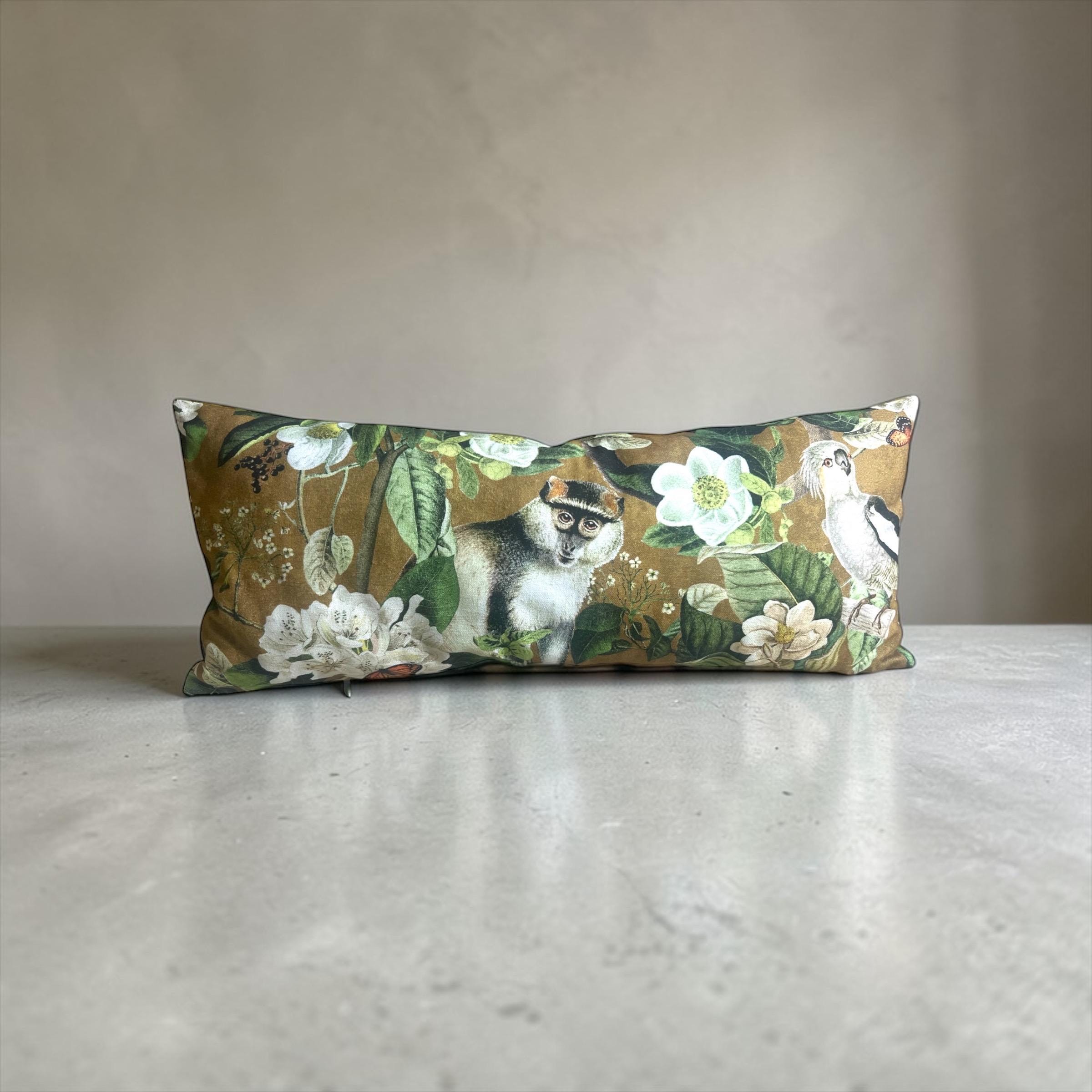 Luxury Lemur Jungle Velvet Lumbar Pillow Cover: Exotic Botanical Decor