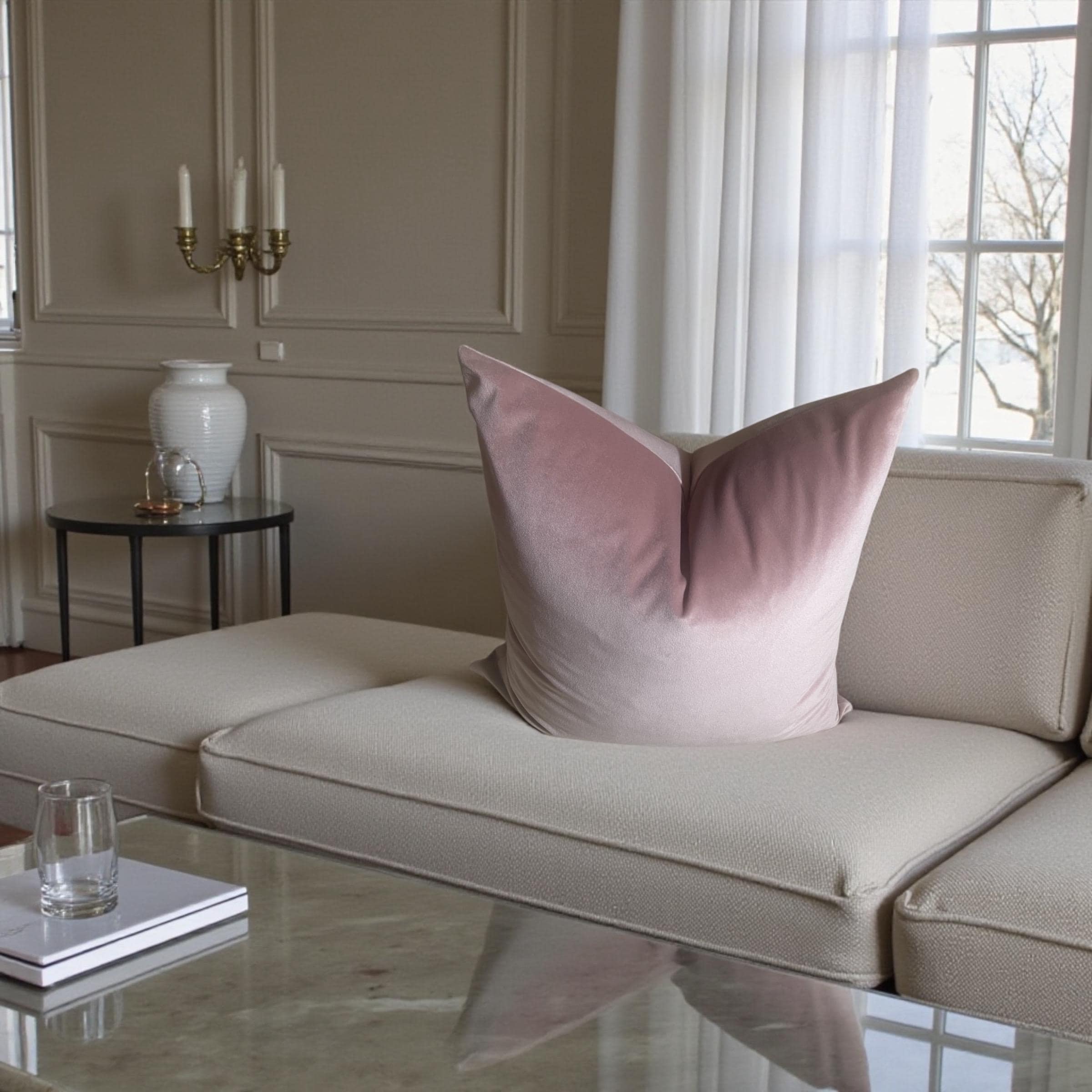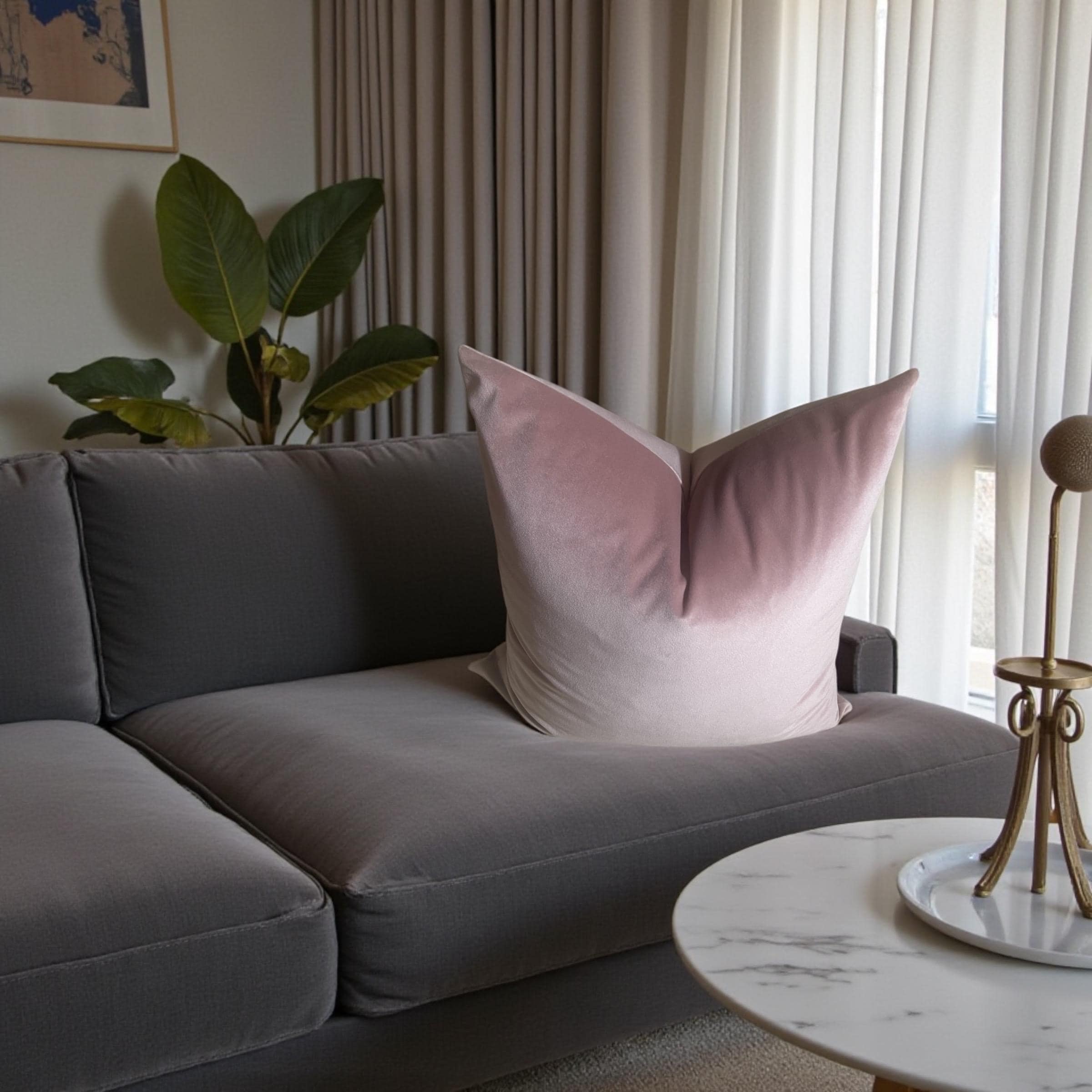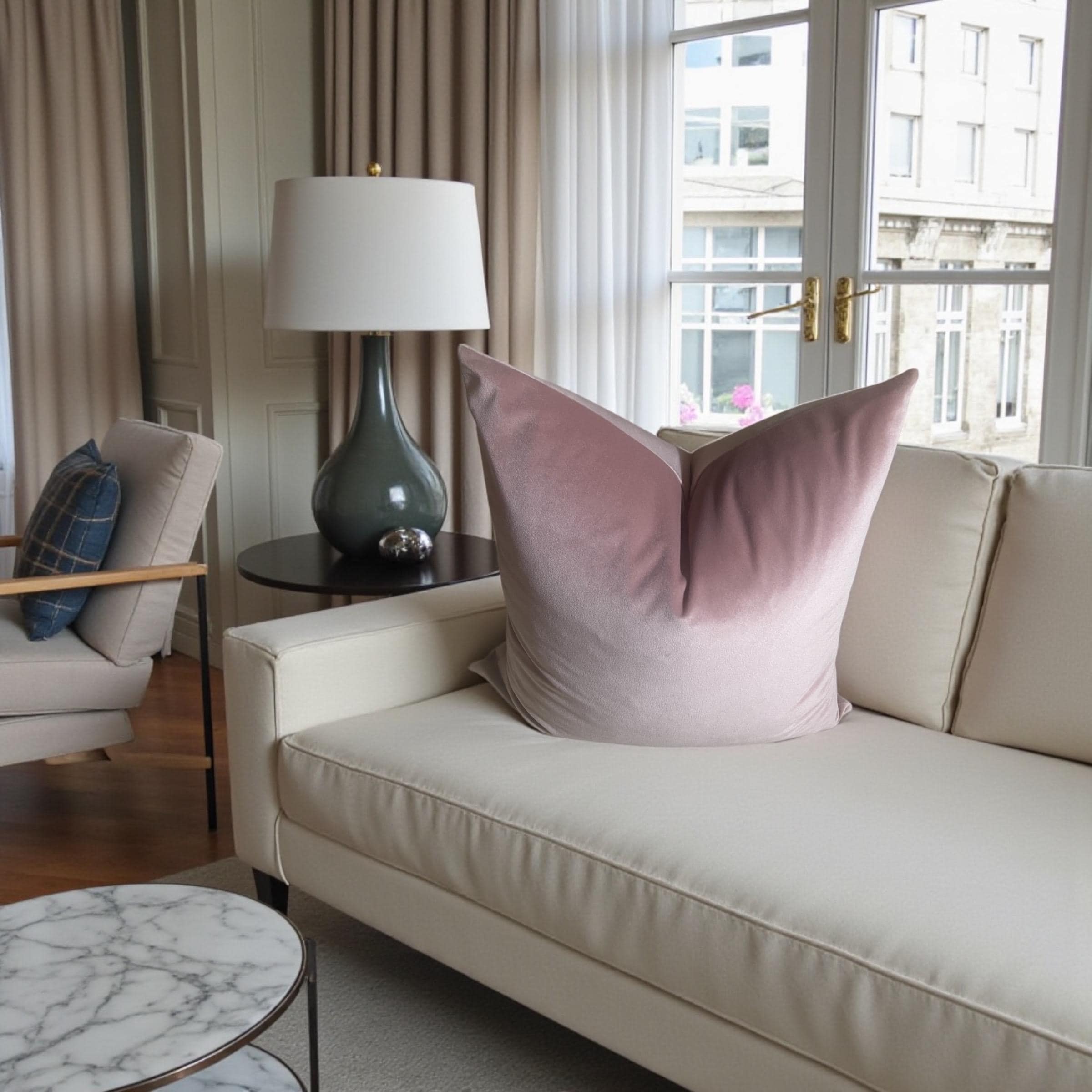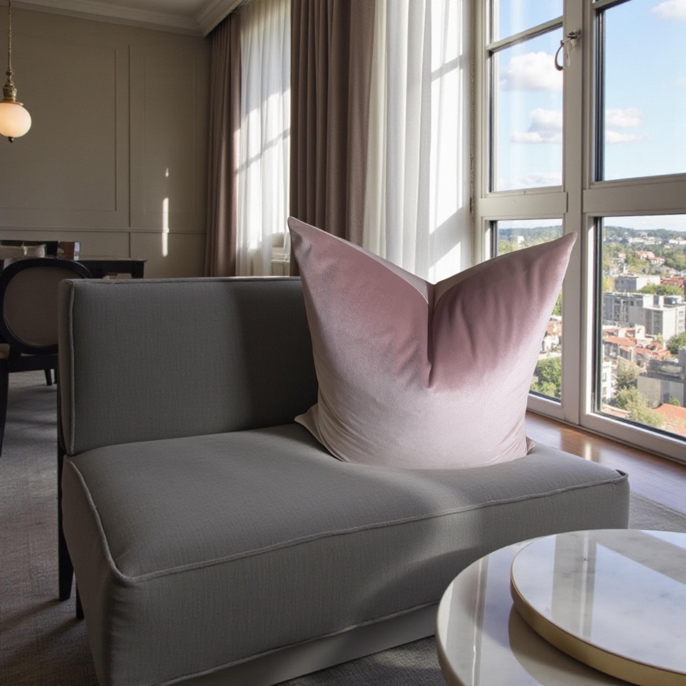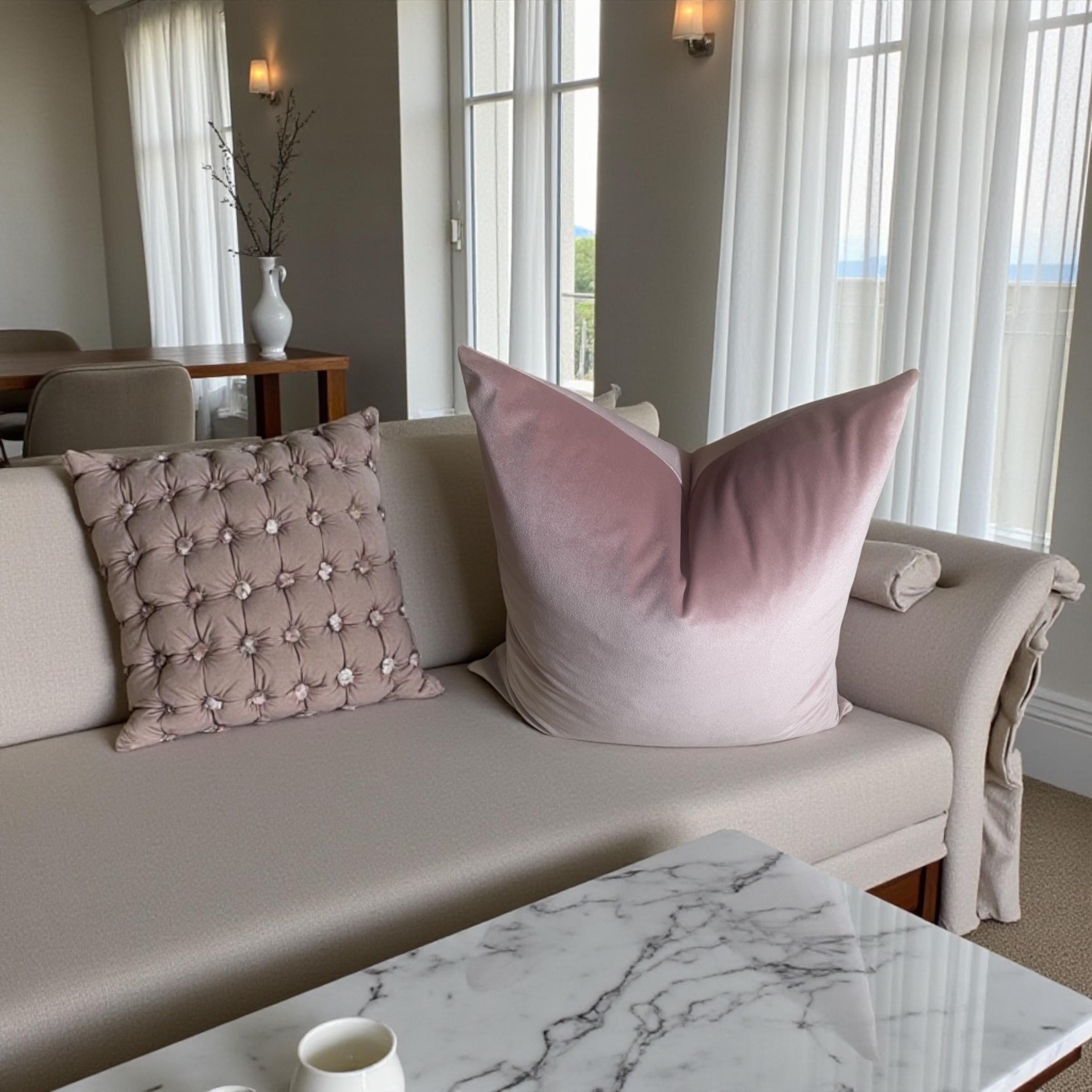 As shown in the listing photos, this blush pillow beautifully complements the floral velvet cushion from my shop. The shared backing fabric—Alvar Quartz velvet—ties them together effortlessly.