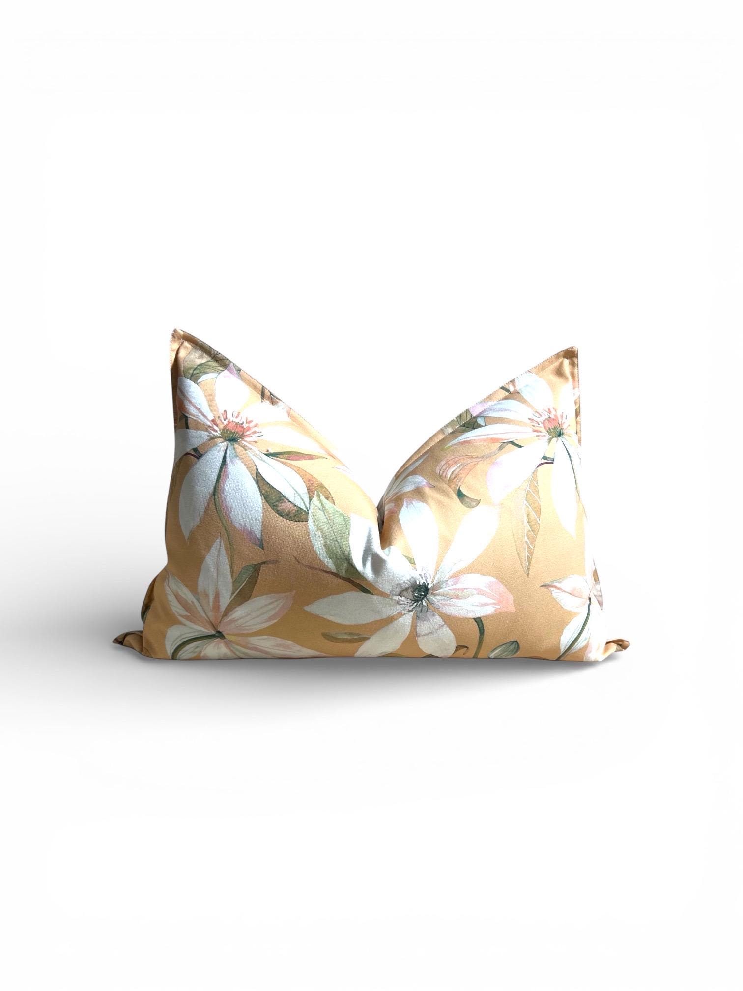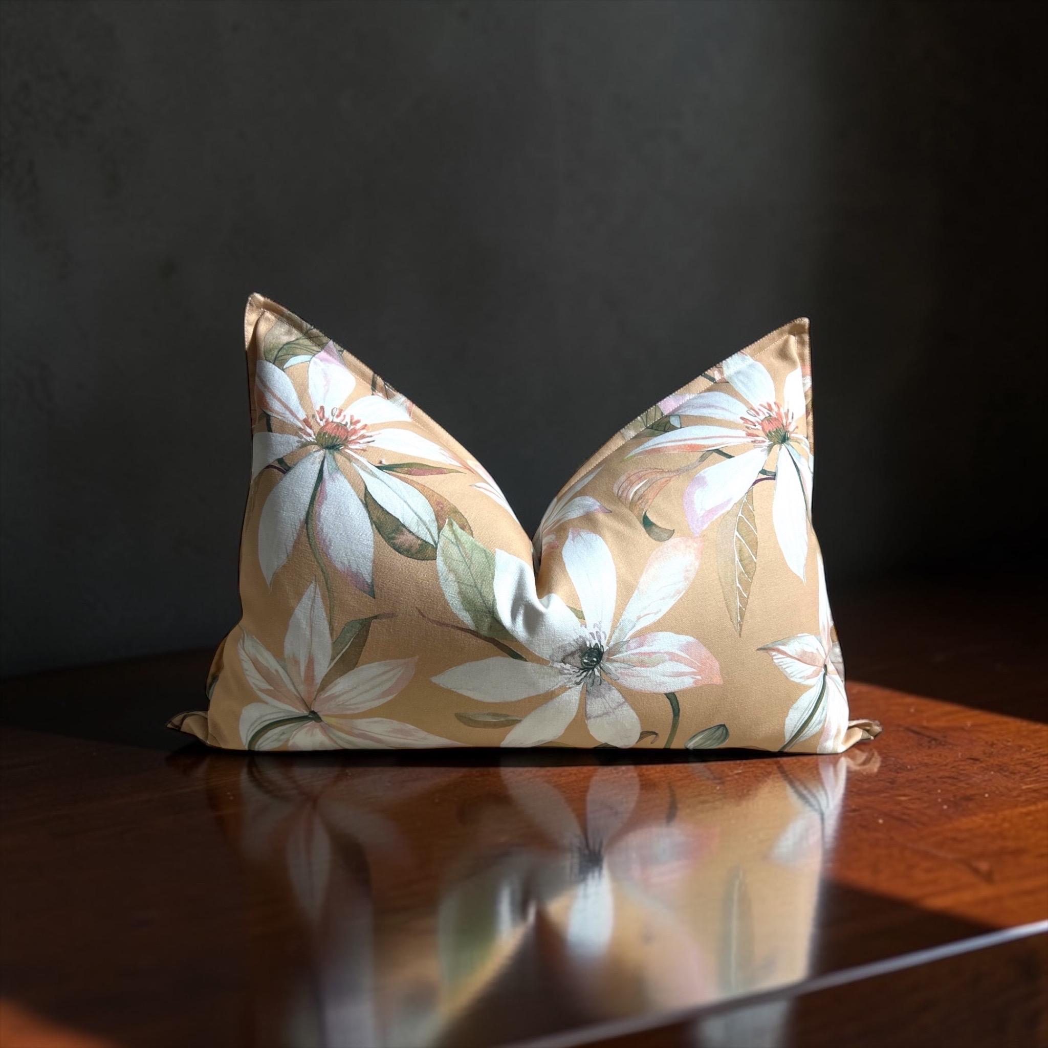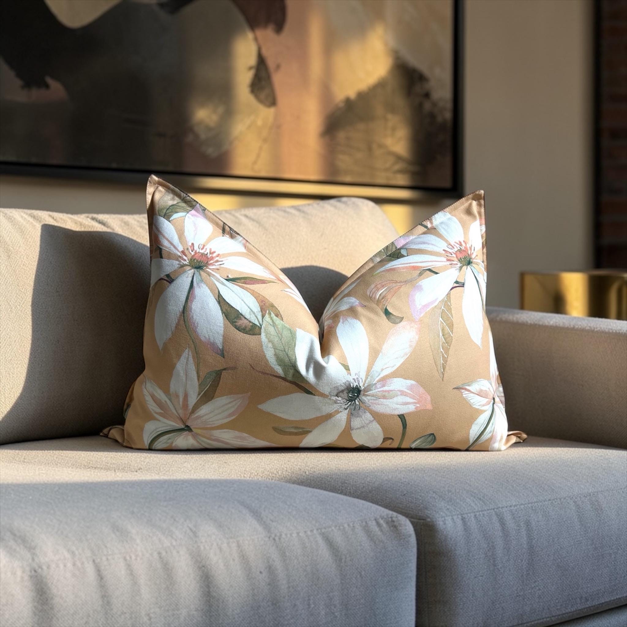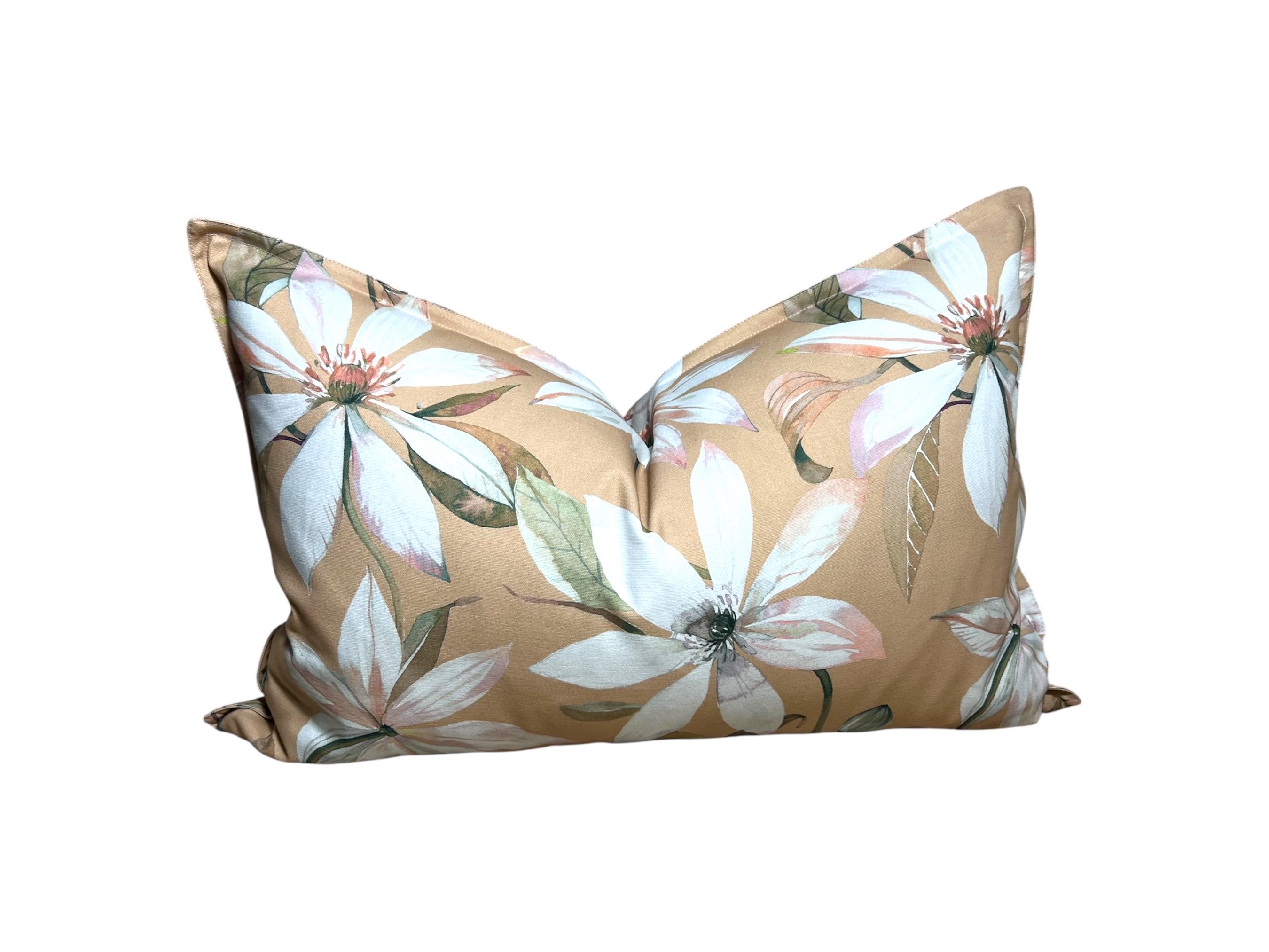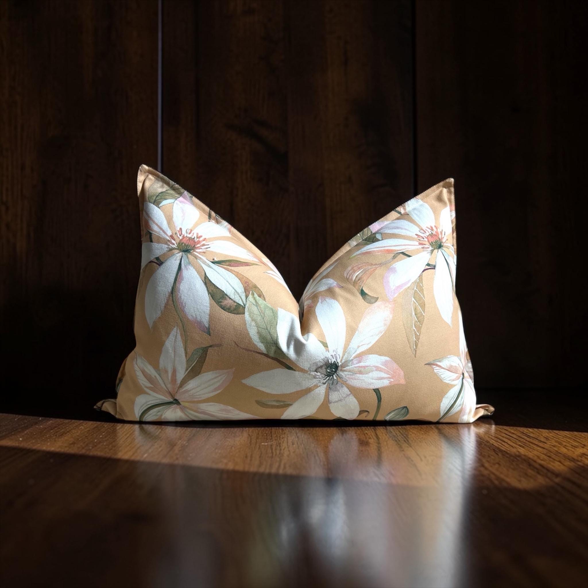 The delicate beige and white floral design makes this lumbar cushion a refined accent for both modern and classic interiors.