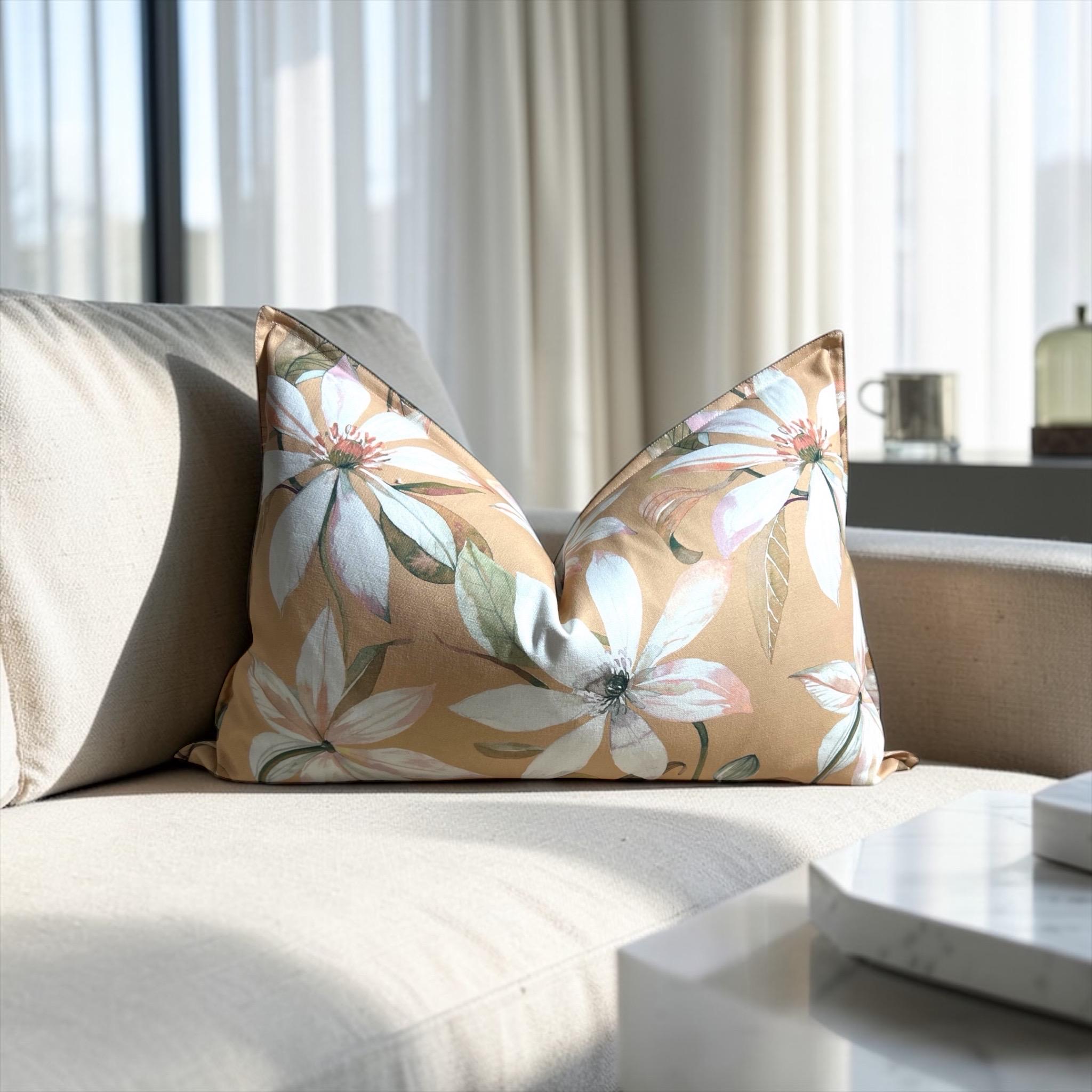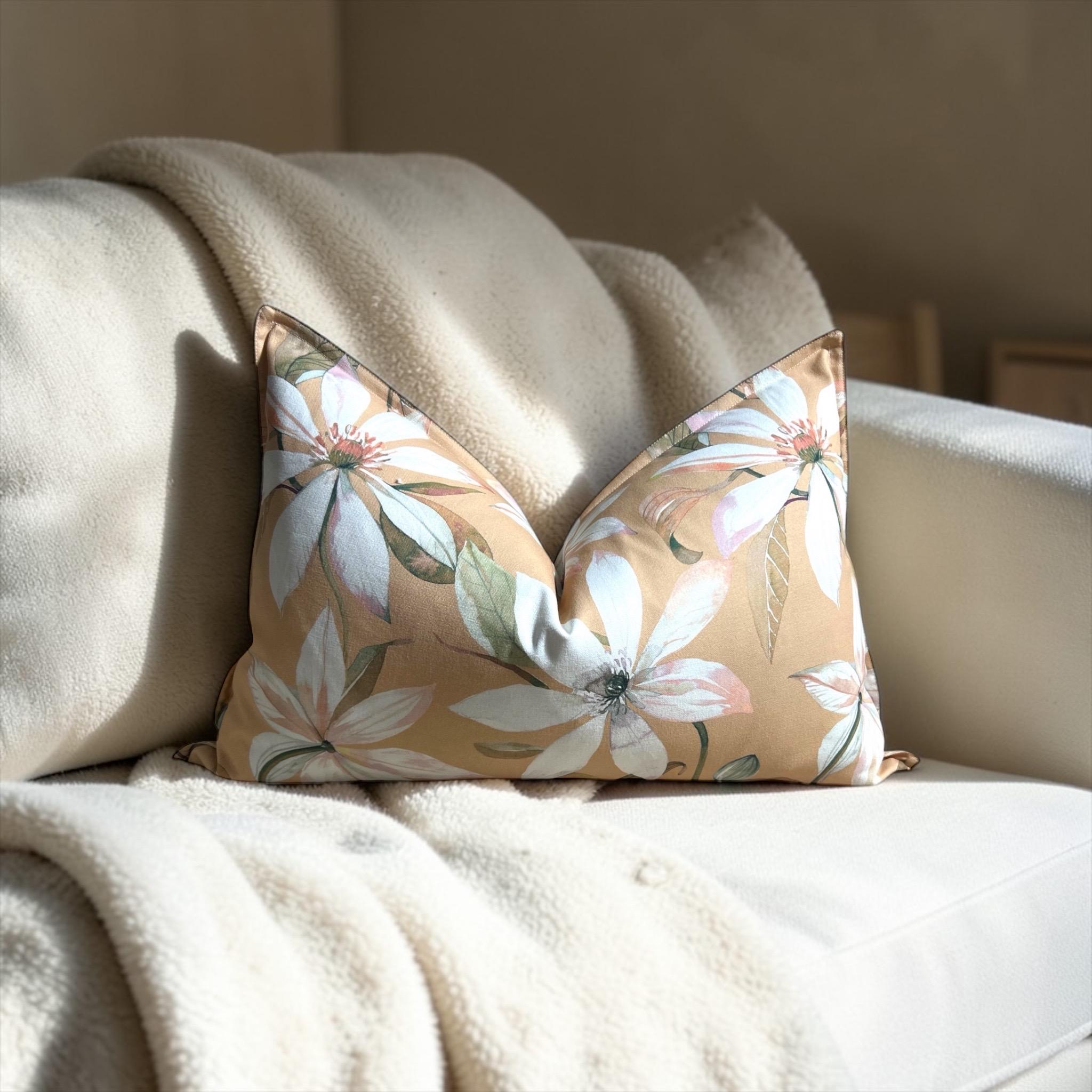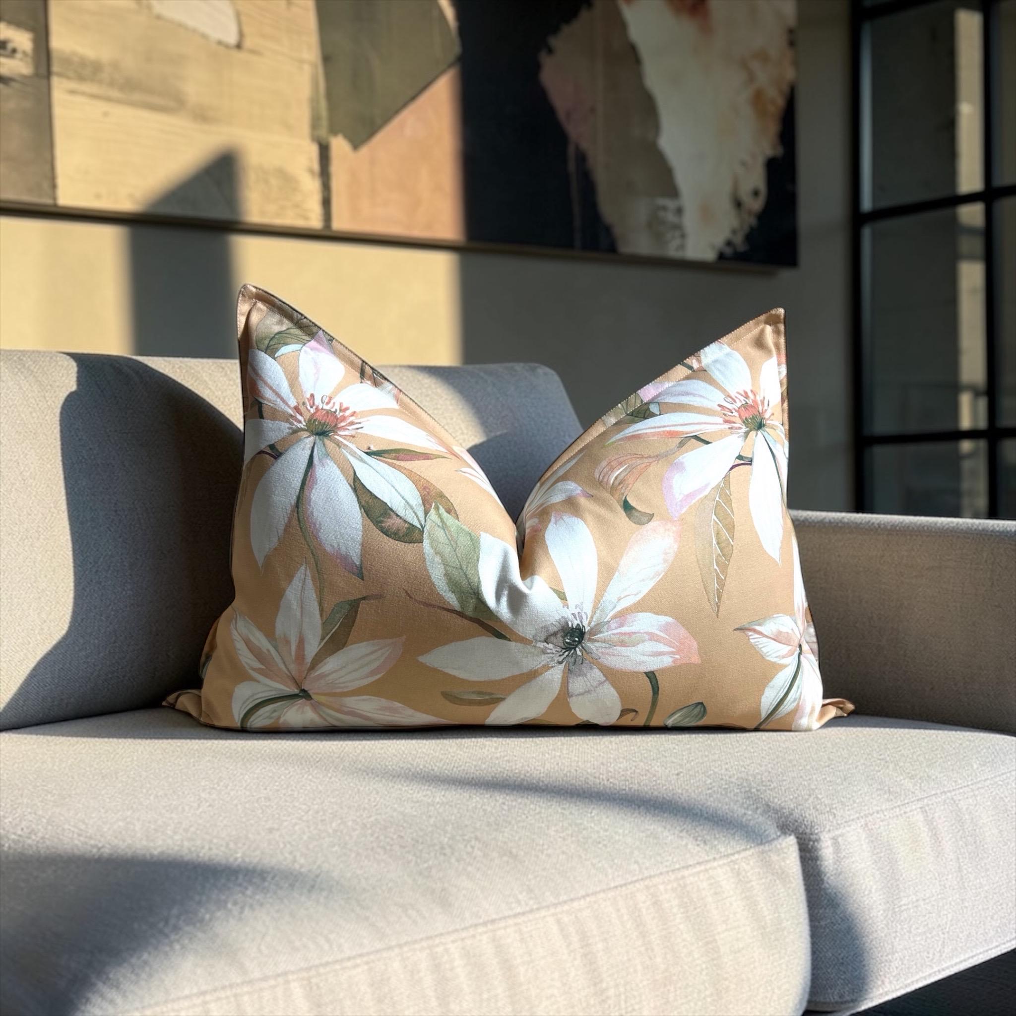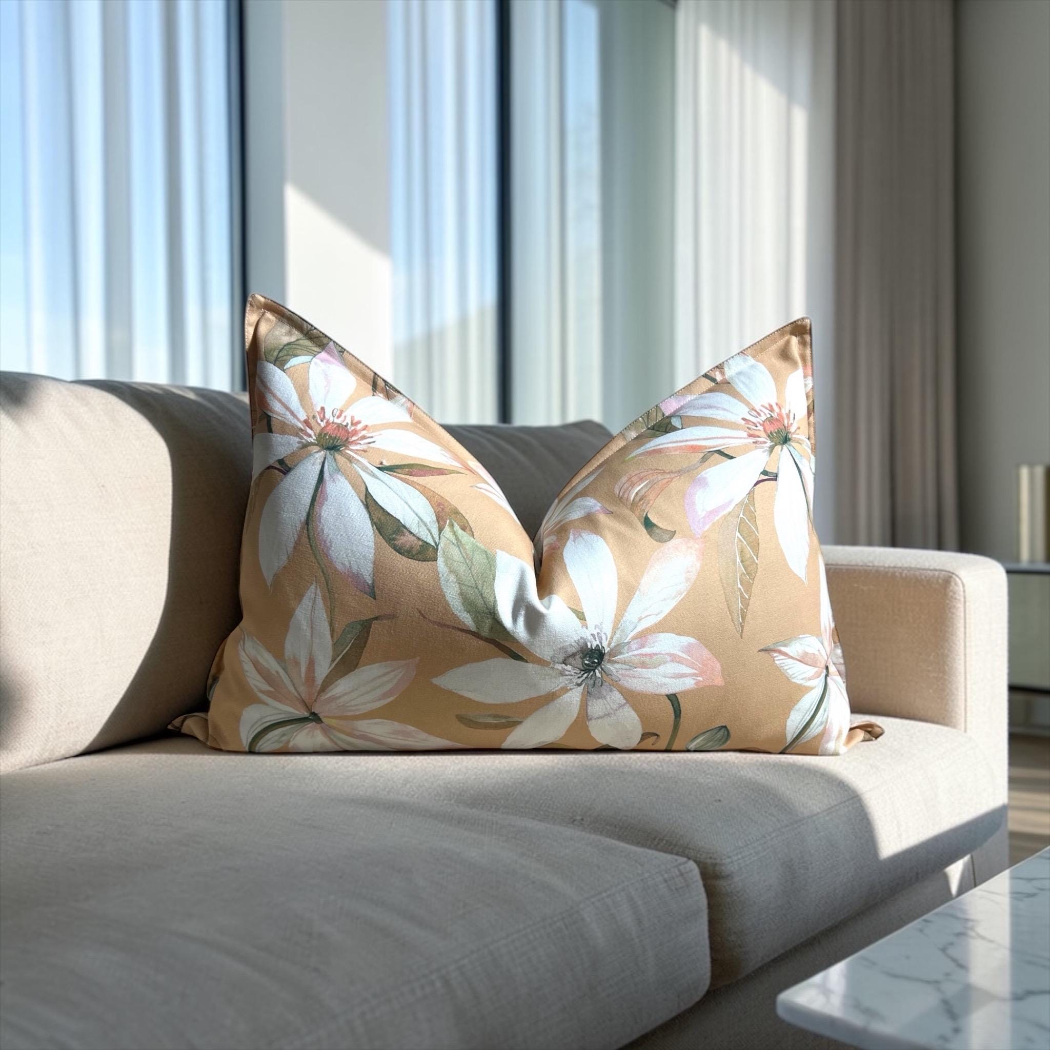 The delicate beige and white floral design makes this lumbar cushion a refined accent for both modern and classic interiors.