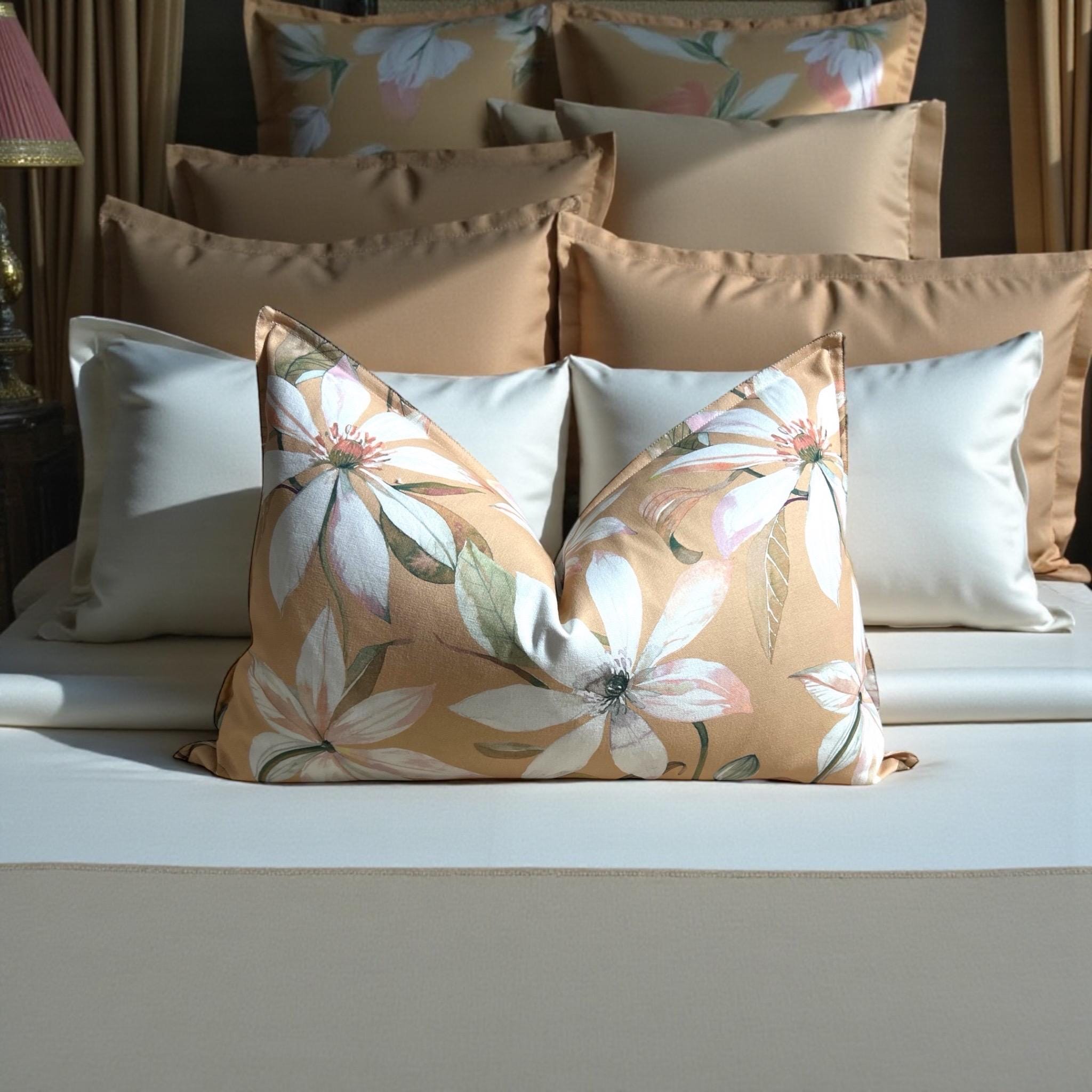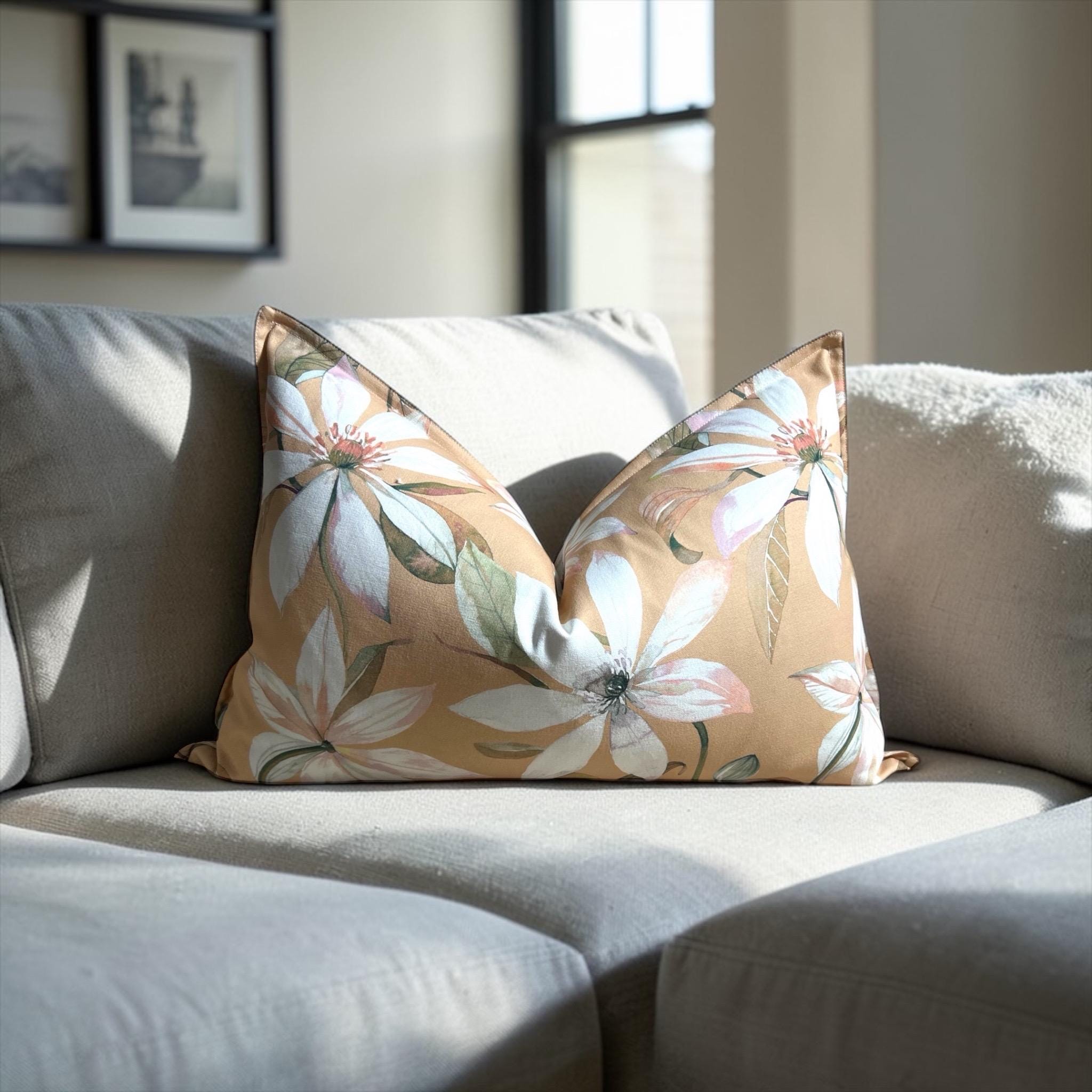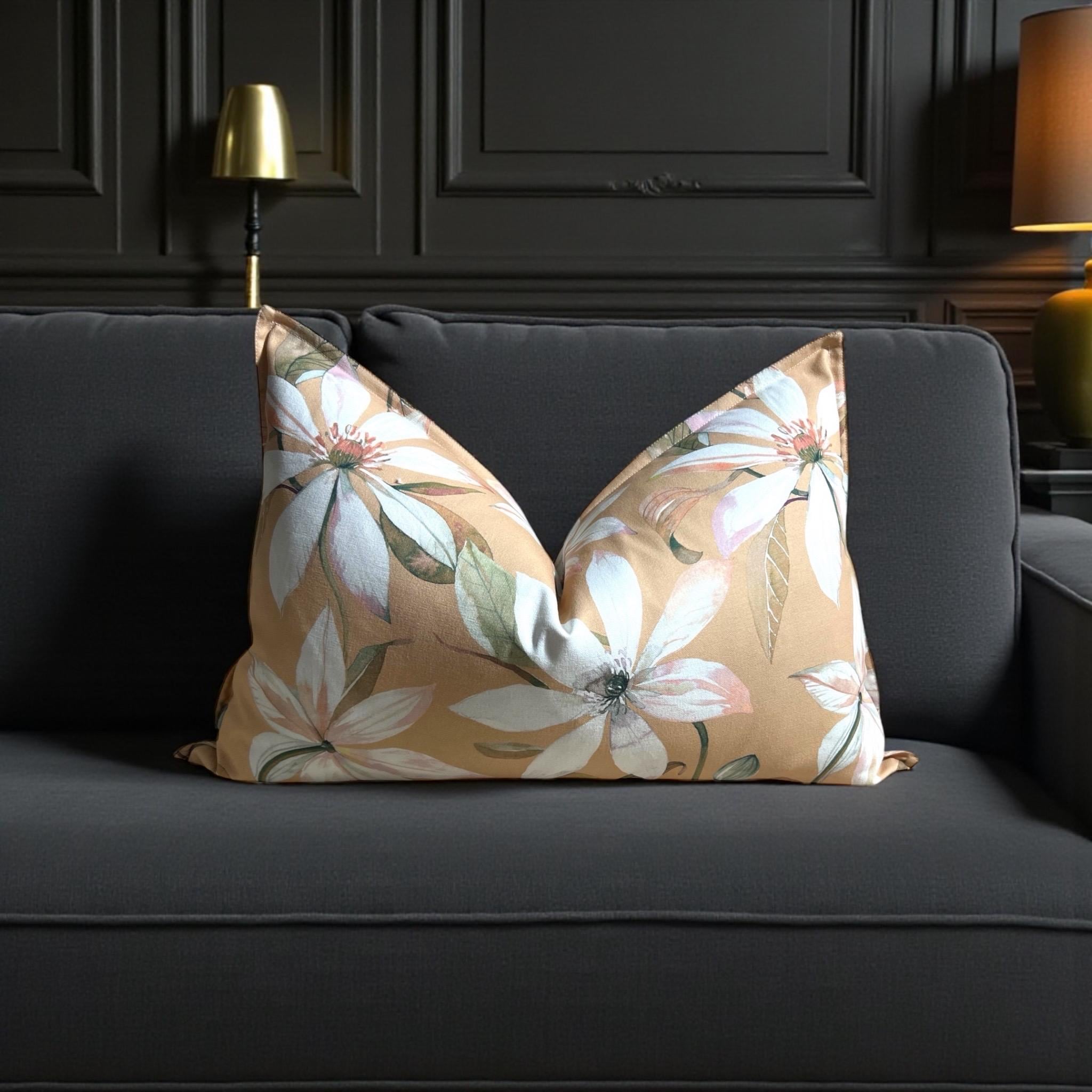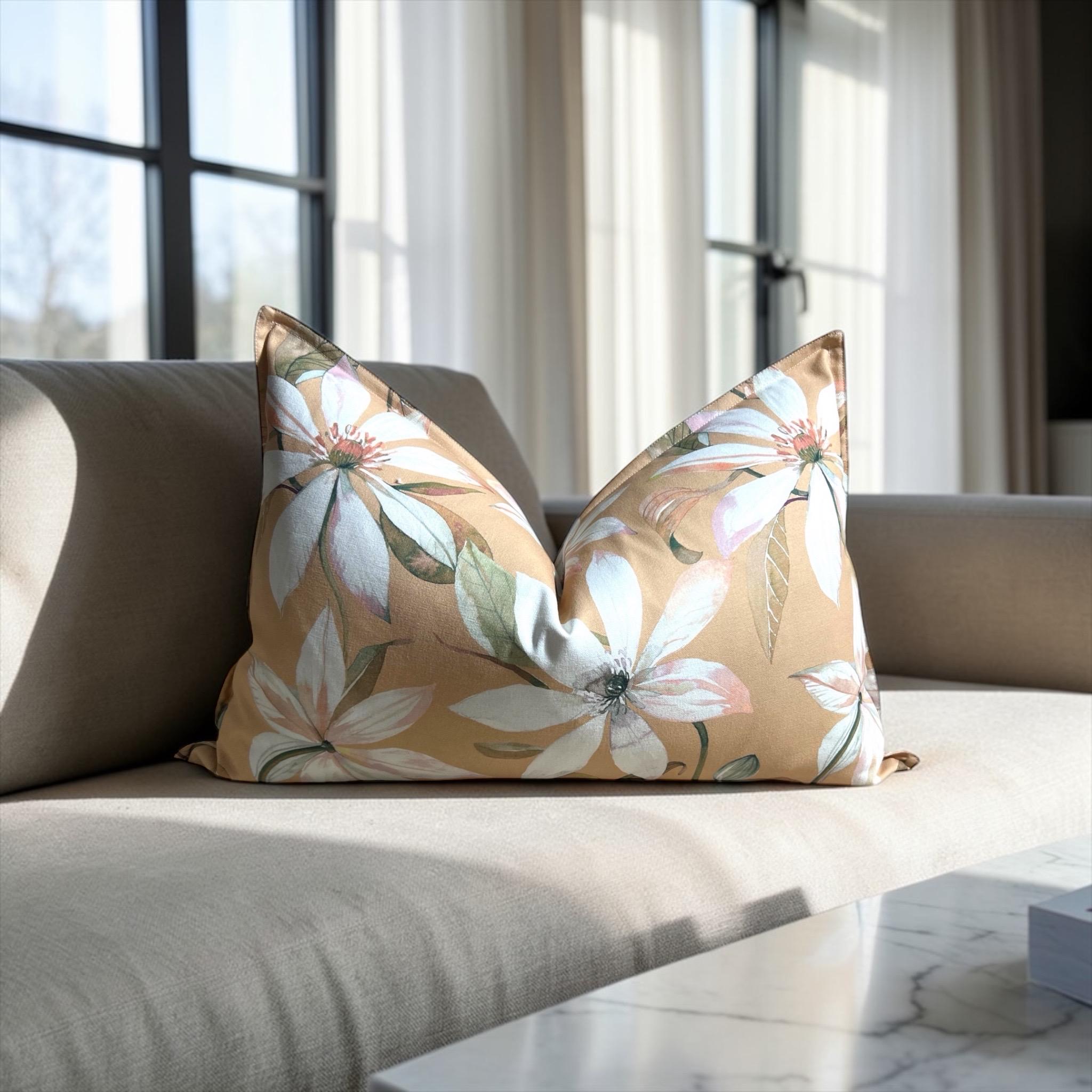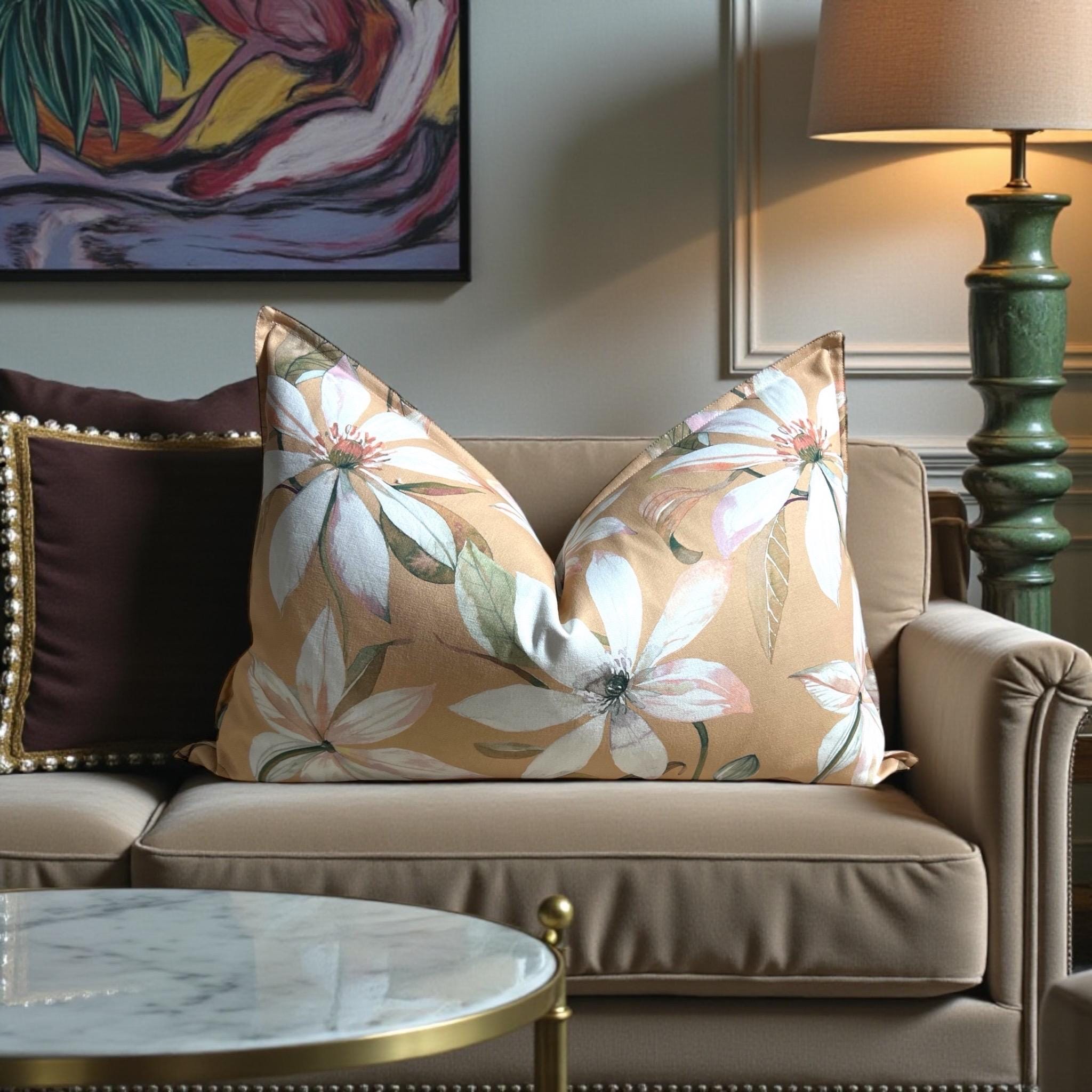 The delicate beige and white floral design makes this lumbar cushion a refined accent for both modern and classic interiors.