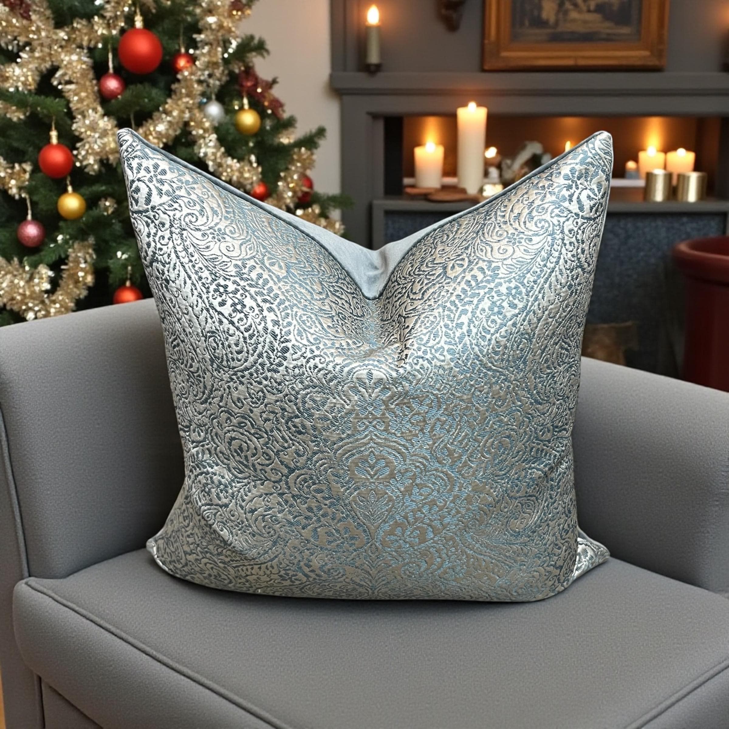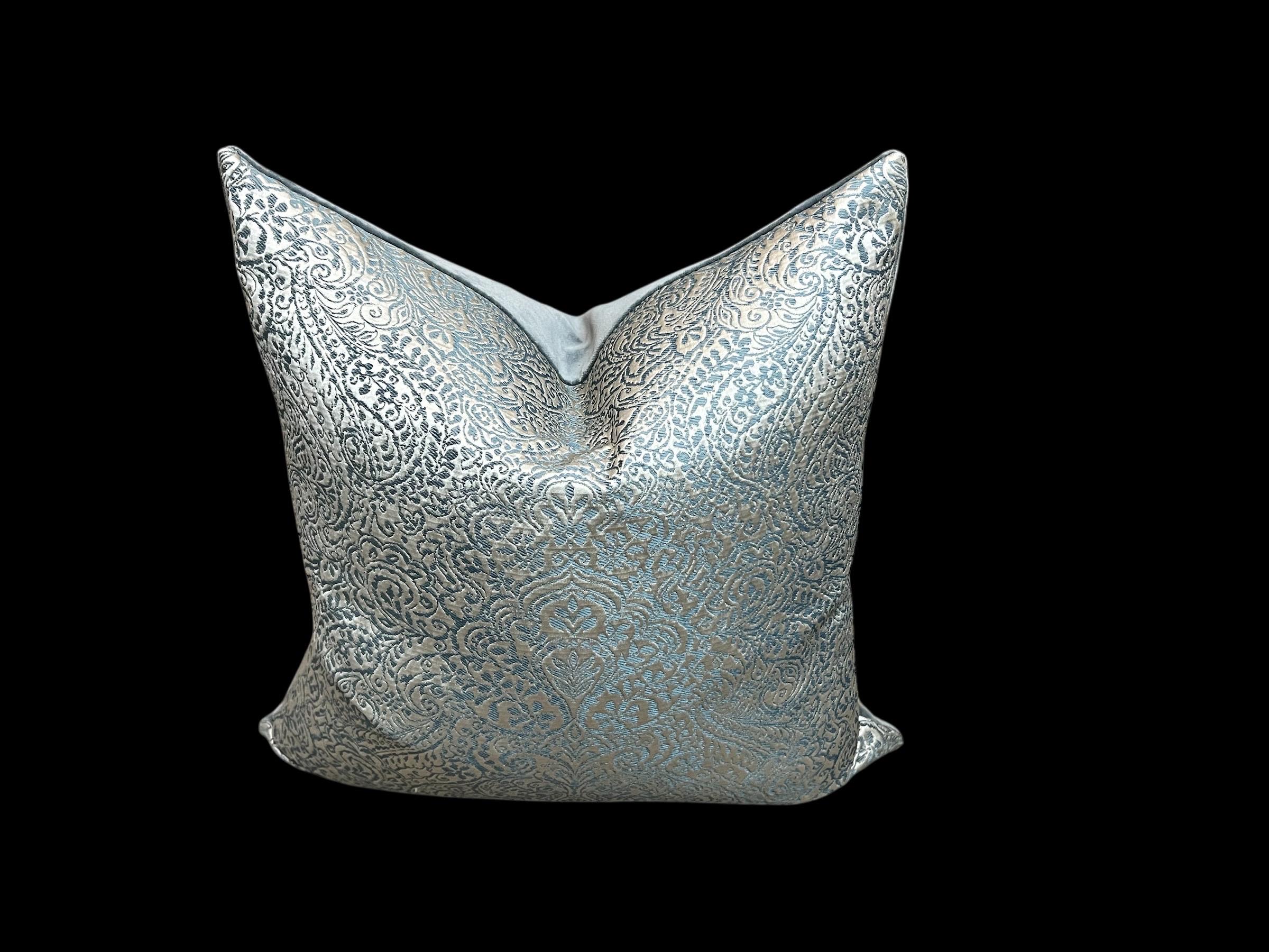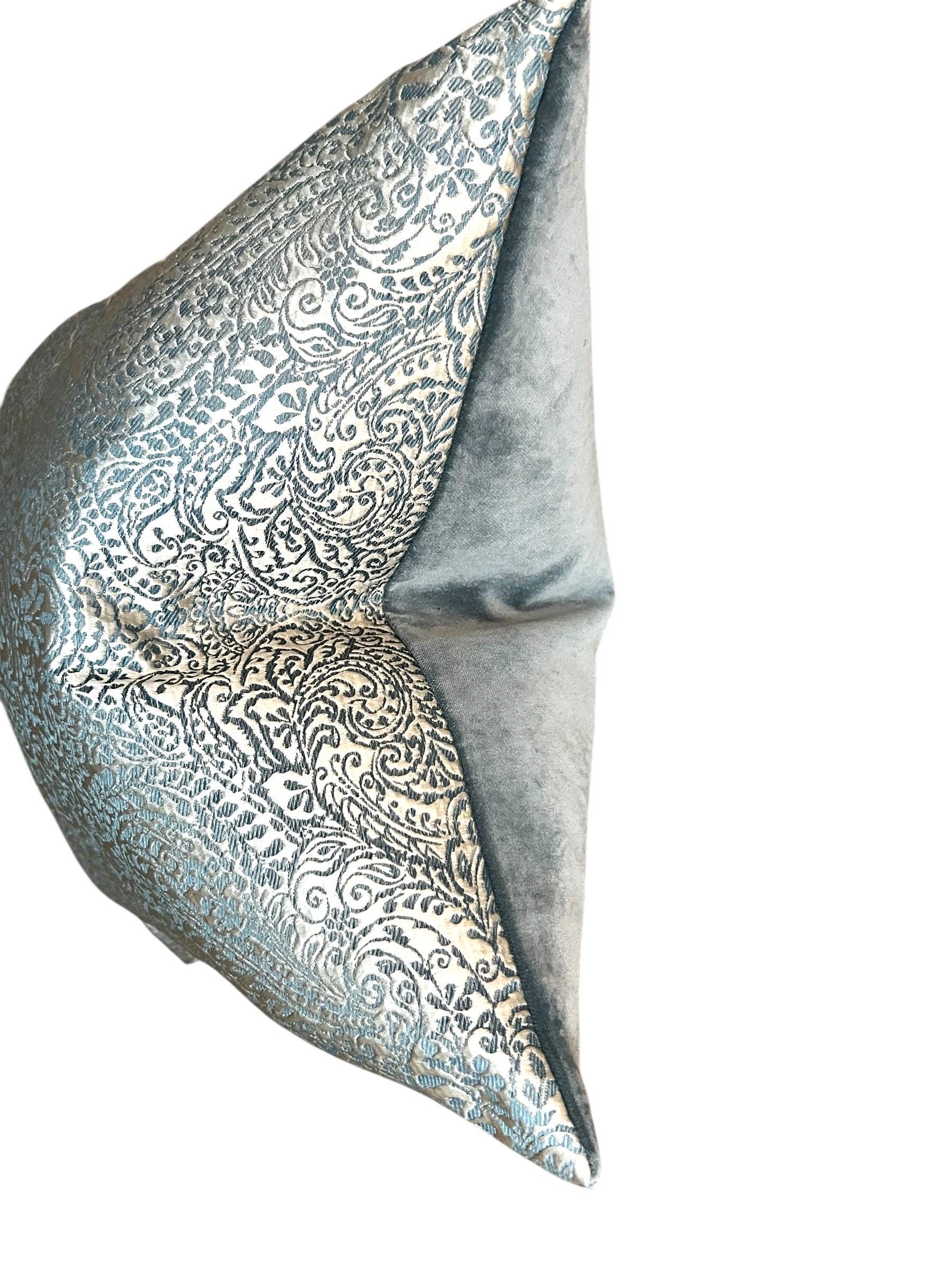 Handmade , designer, luxury cushion in silver-blue damask and grey velvet