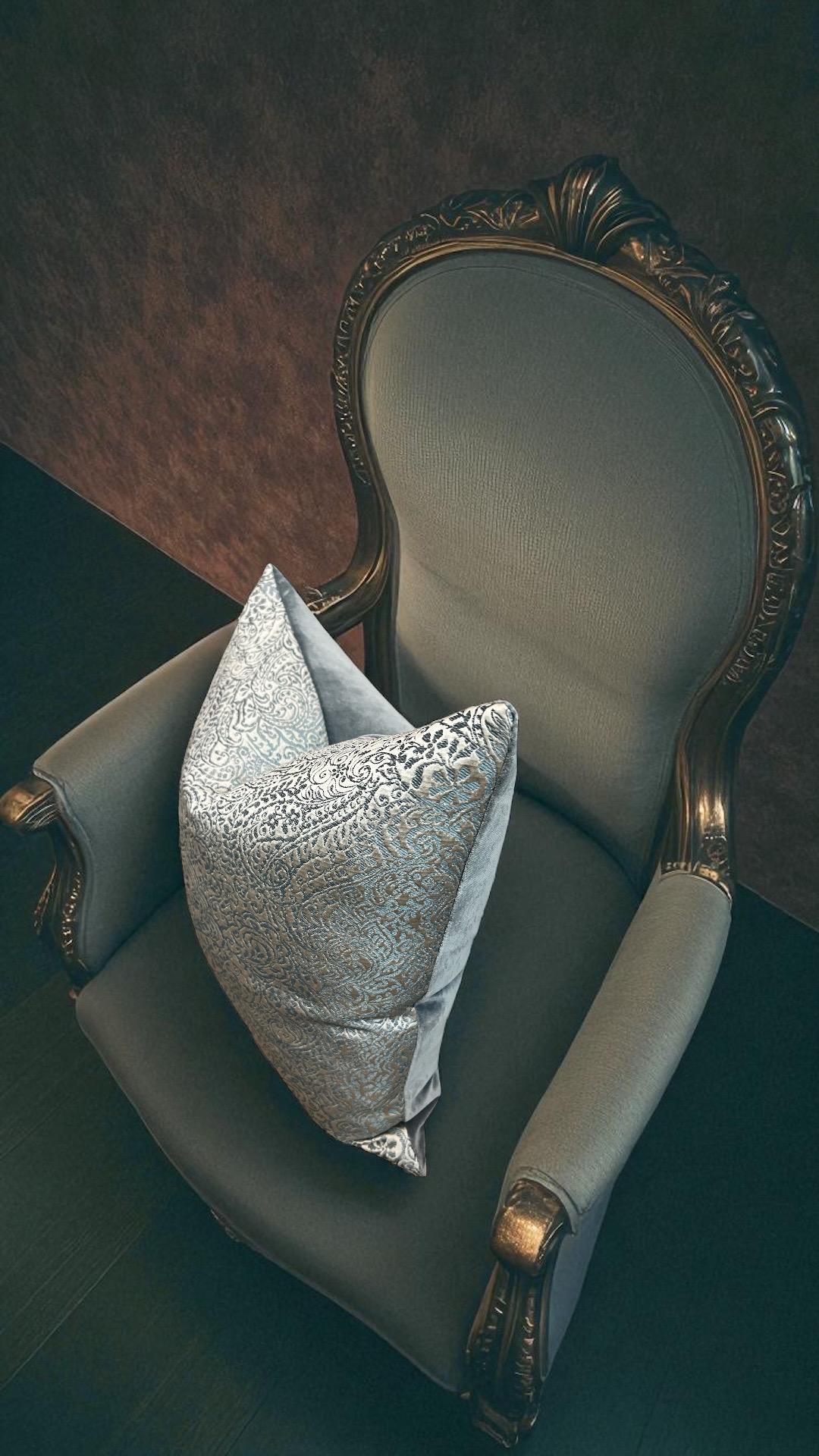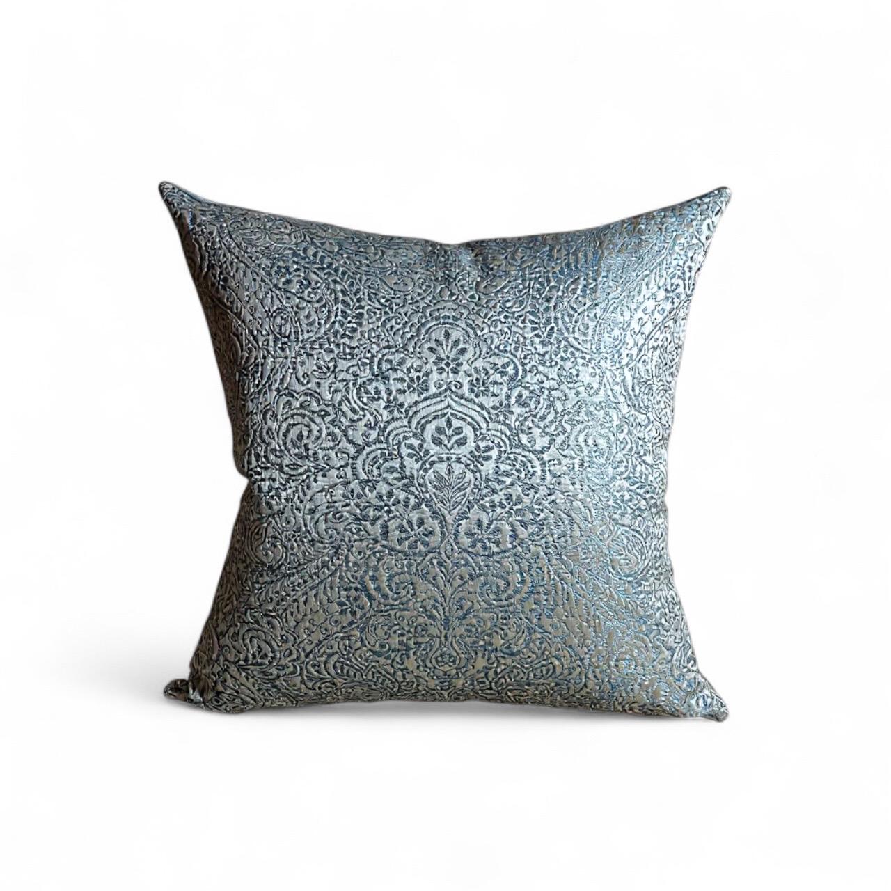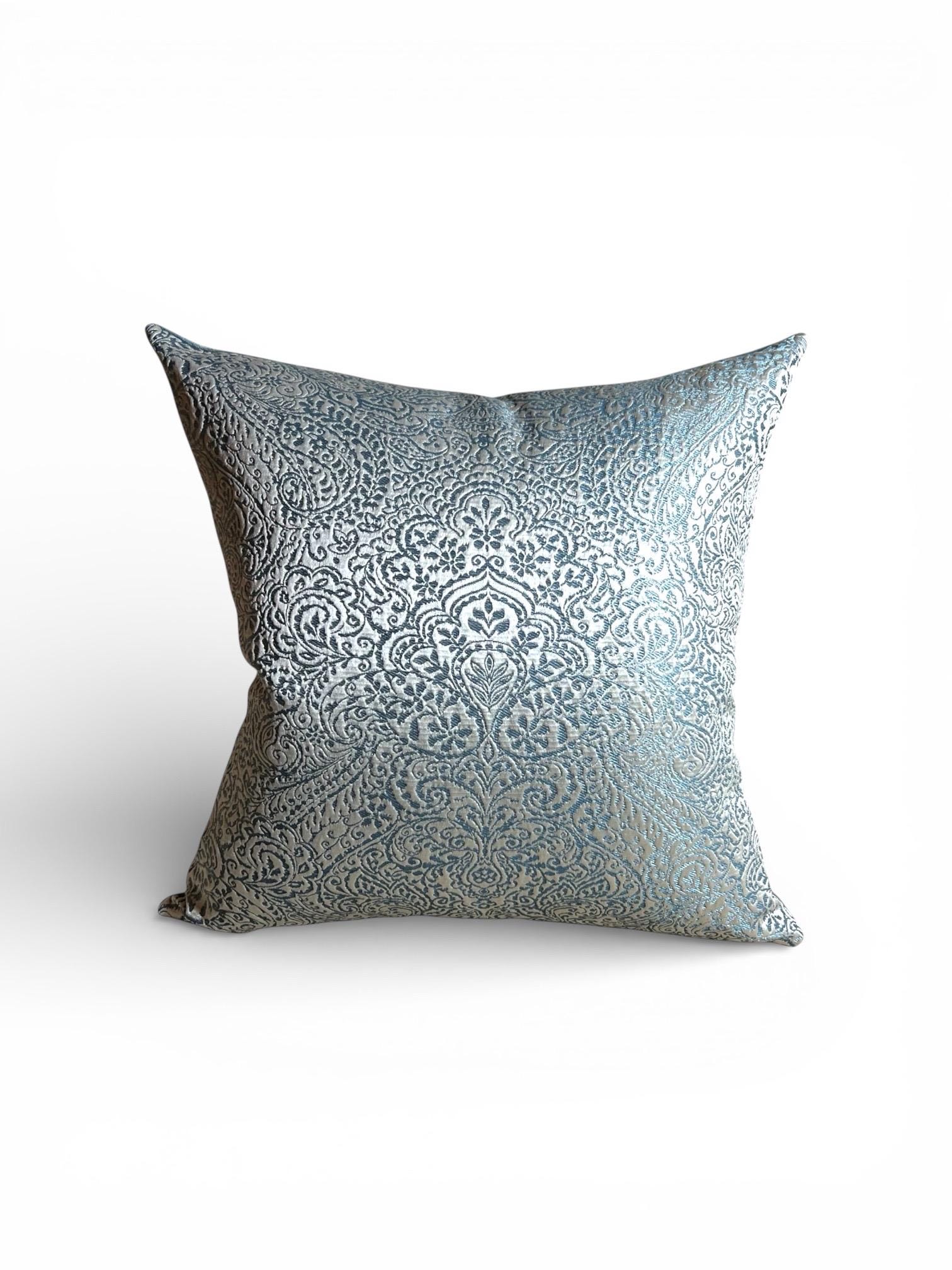 Handmade , designer, luxury cushion in silver-blue damask and grey velvet
