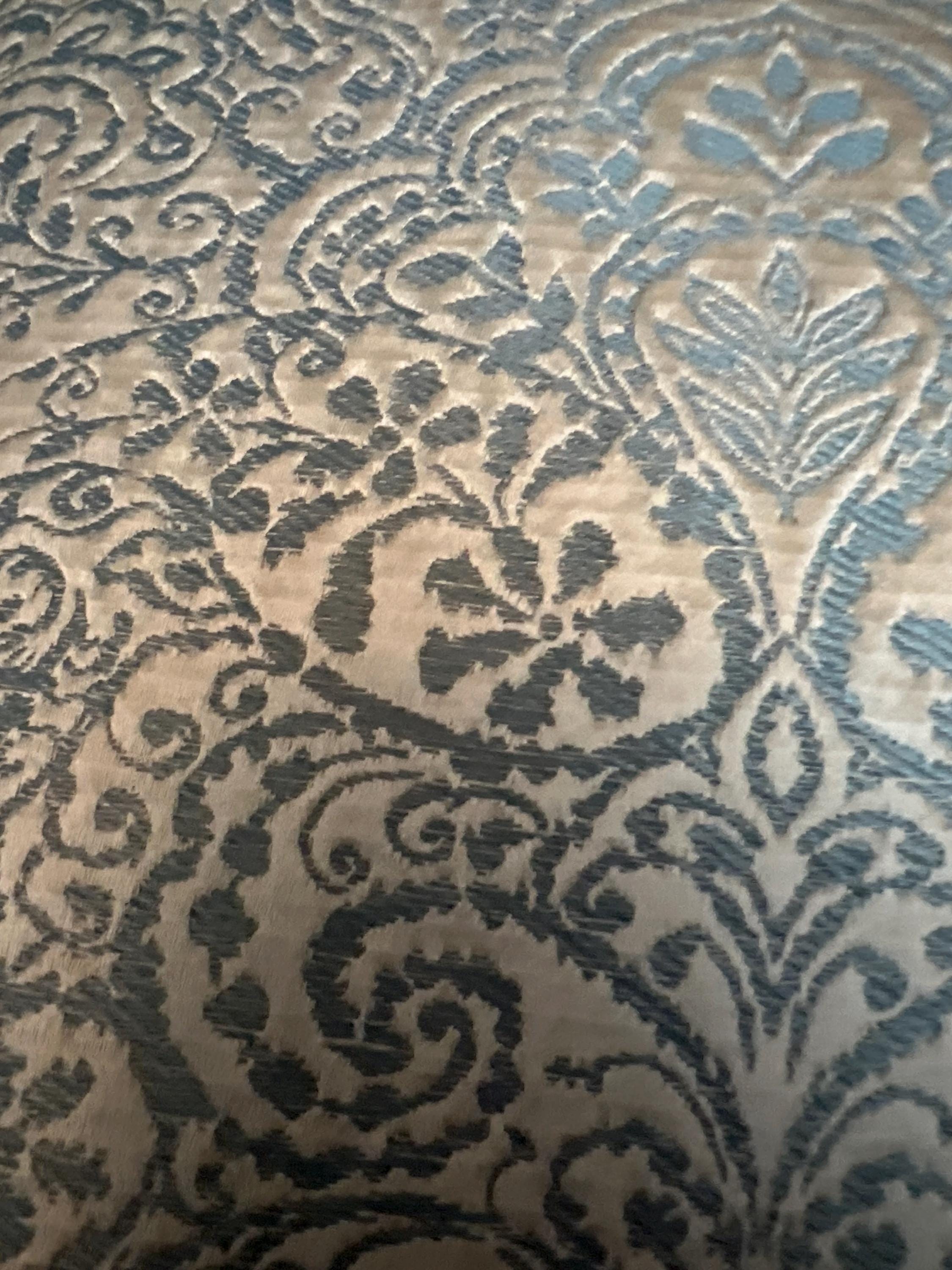 The front side features a stunning silver-blue damask jacquard, rich in woven texture and subtle sheen.