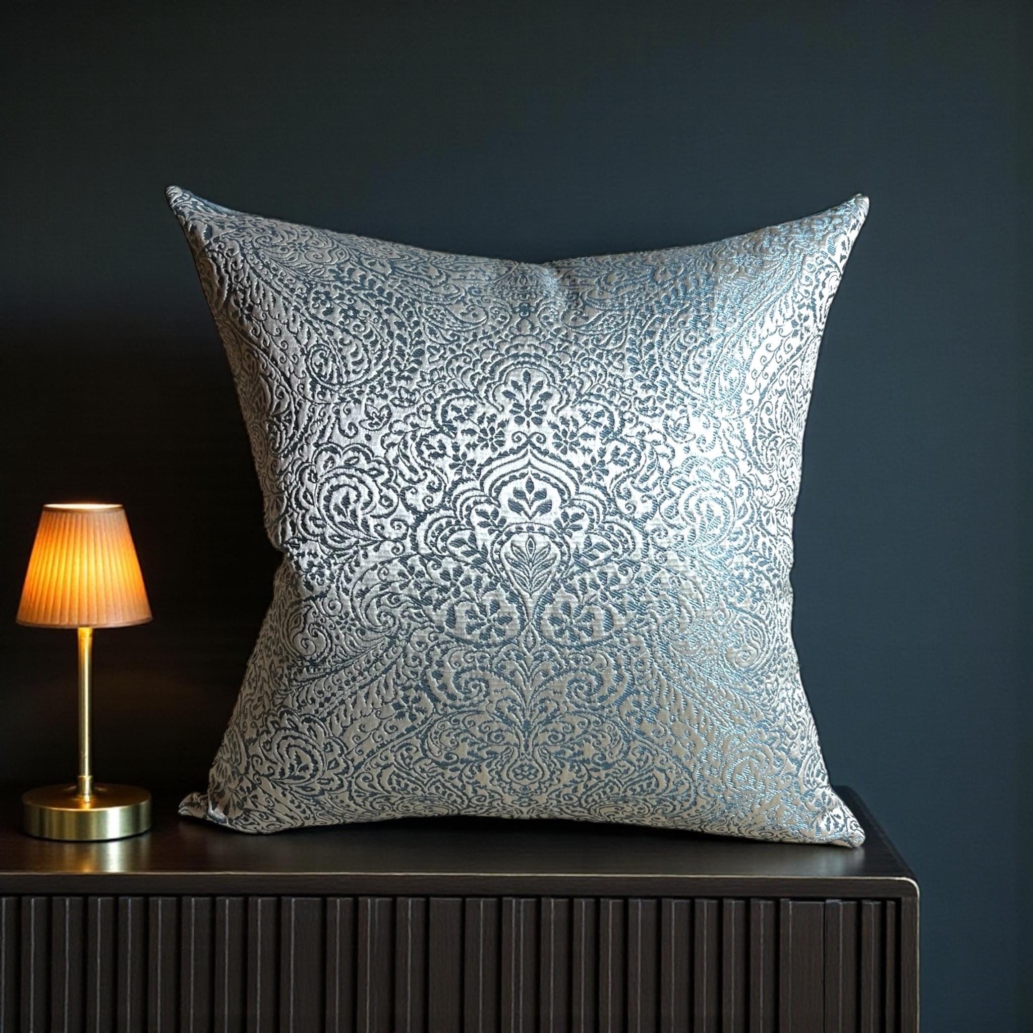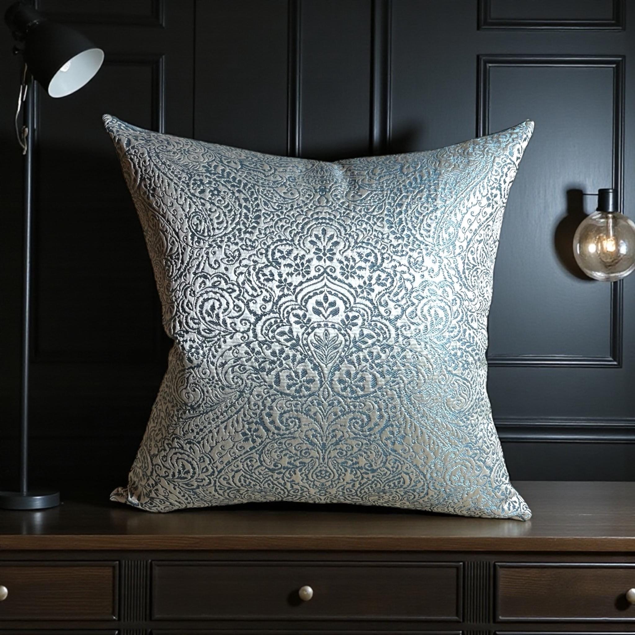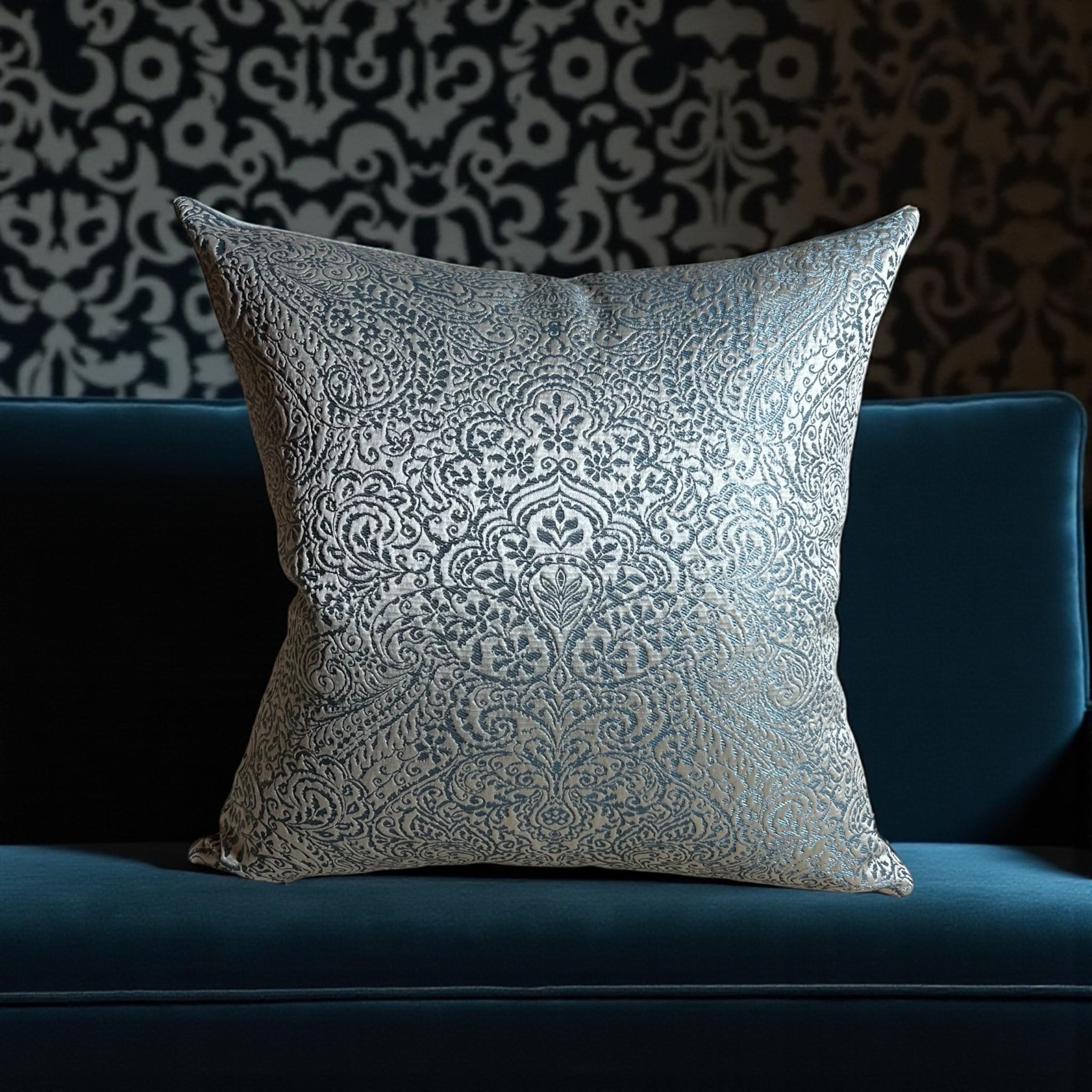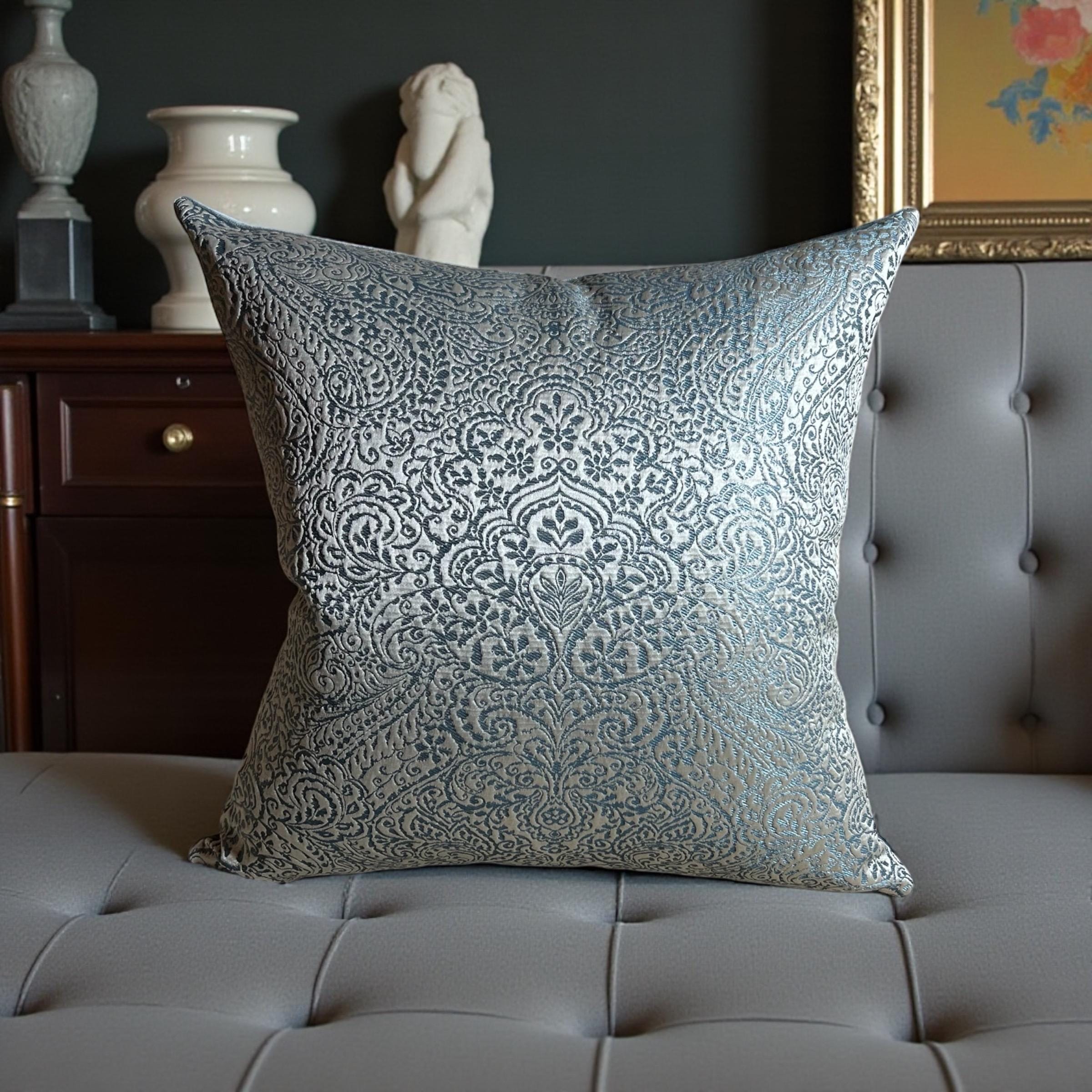 Luxury Silver-Blue Damask & Grey Velvet Pillow Cover: 18x18 Elegant Cushion