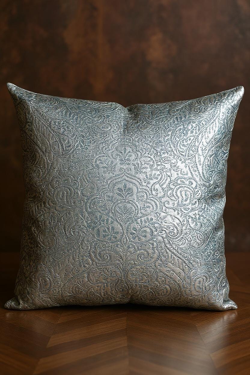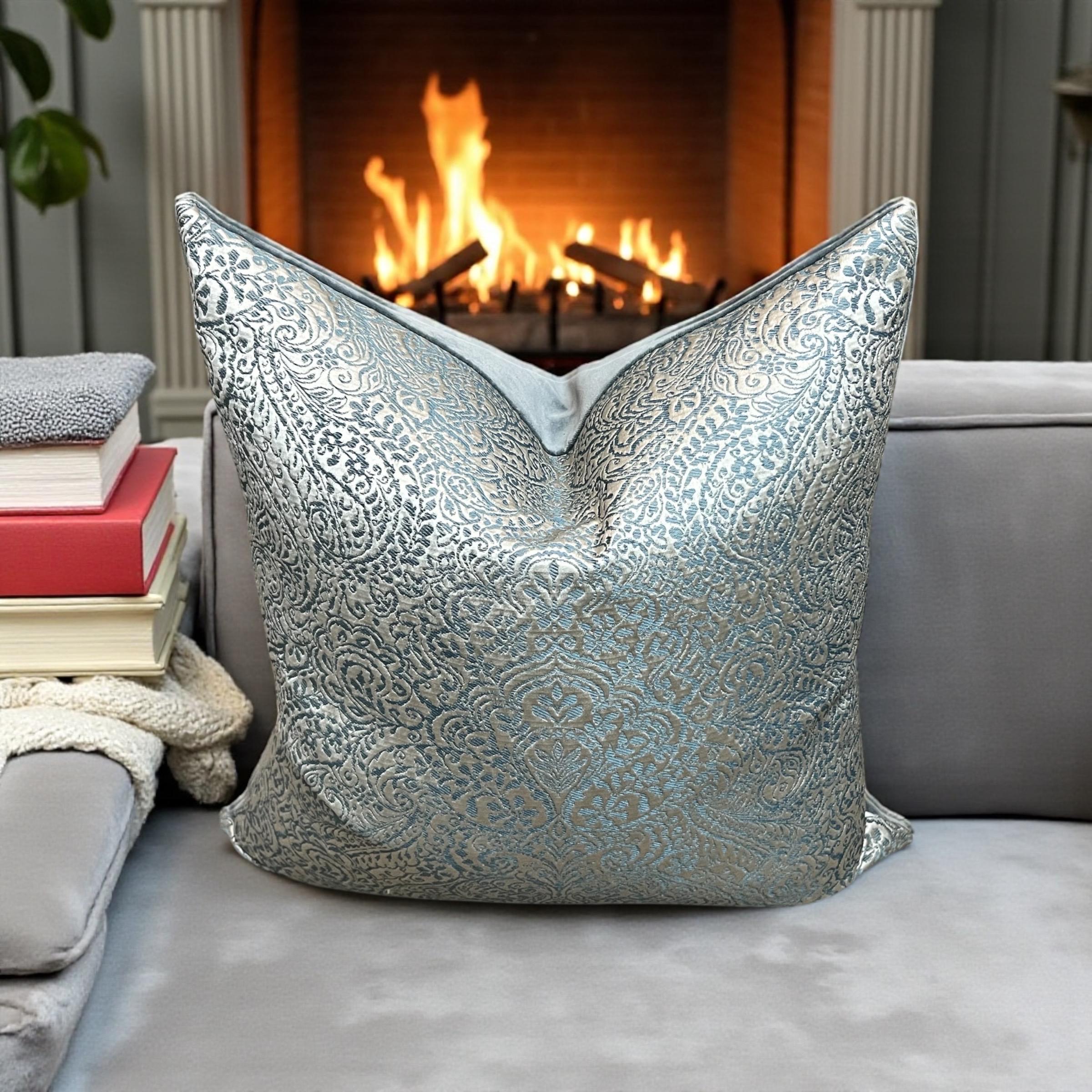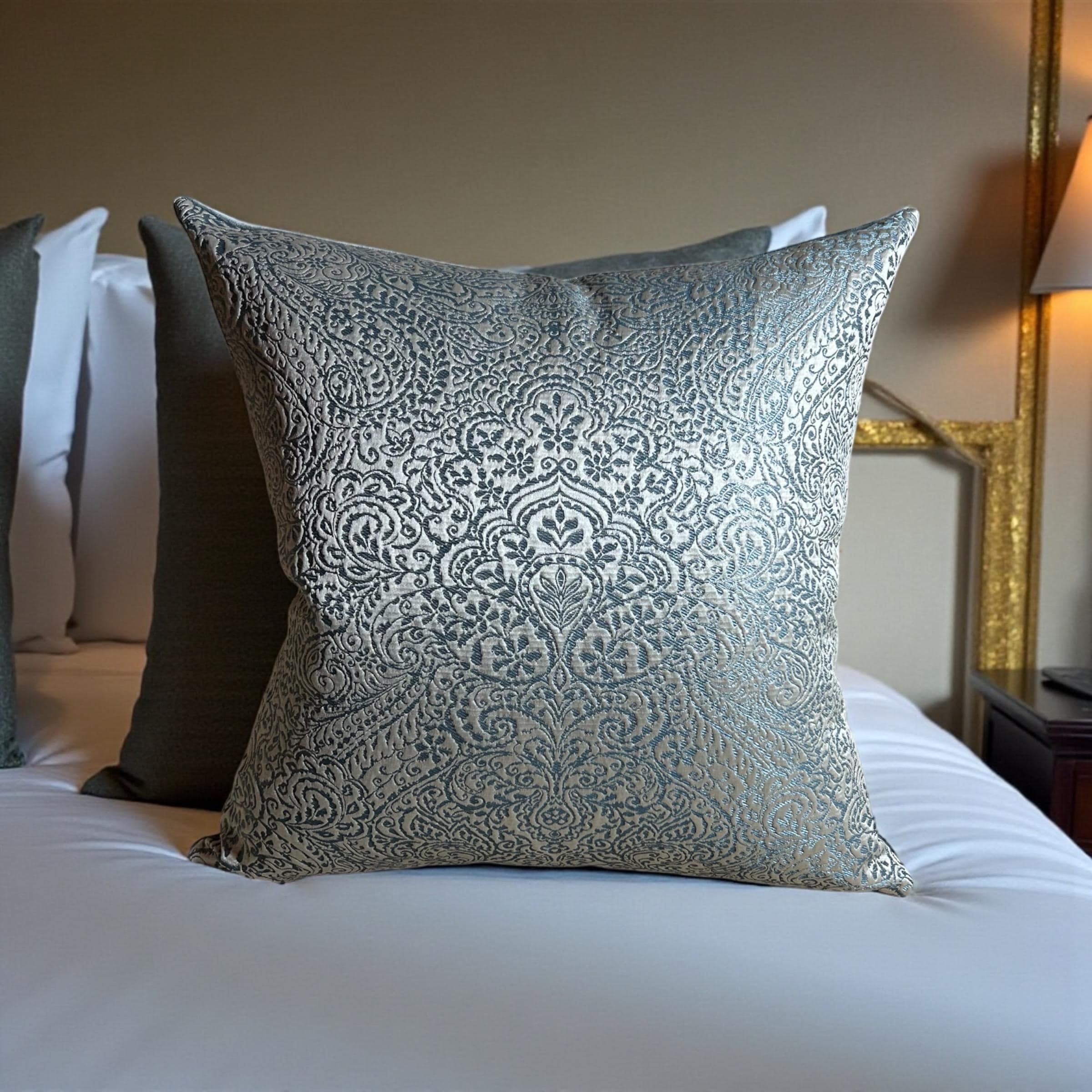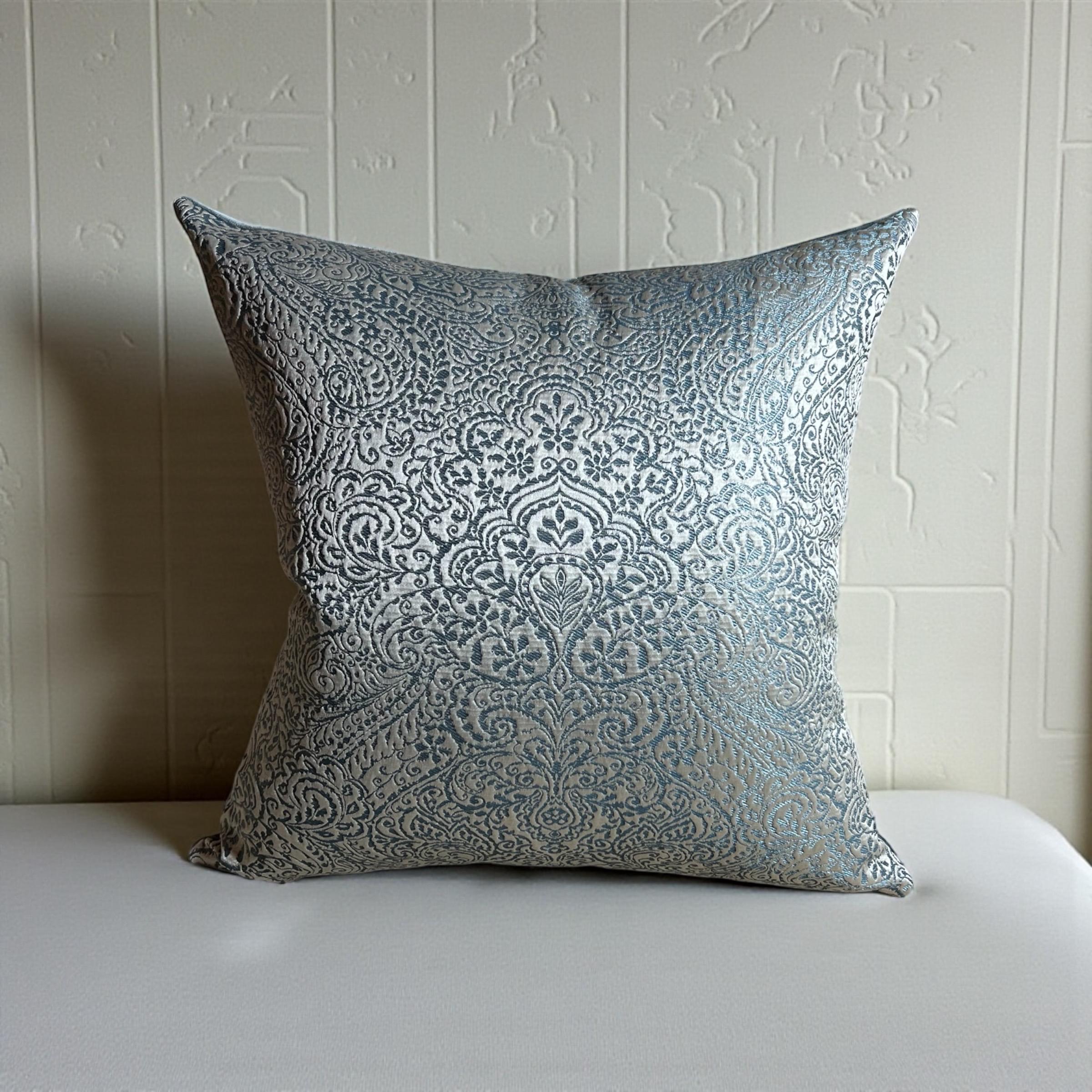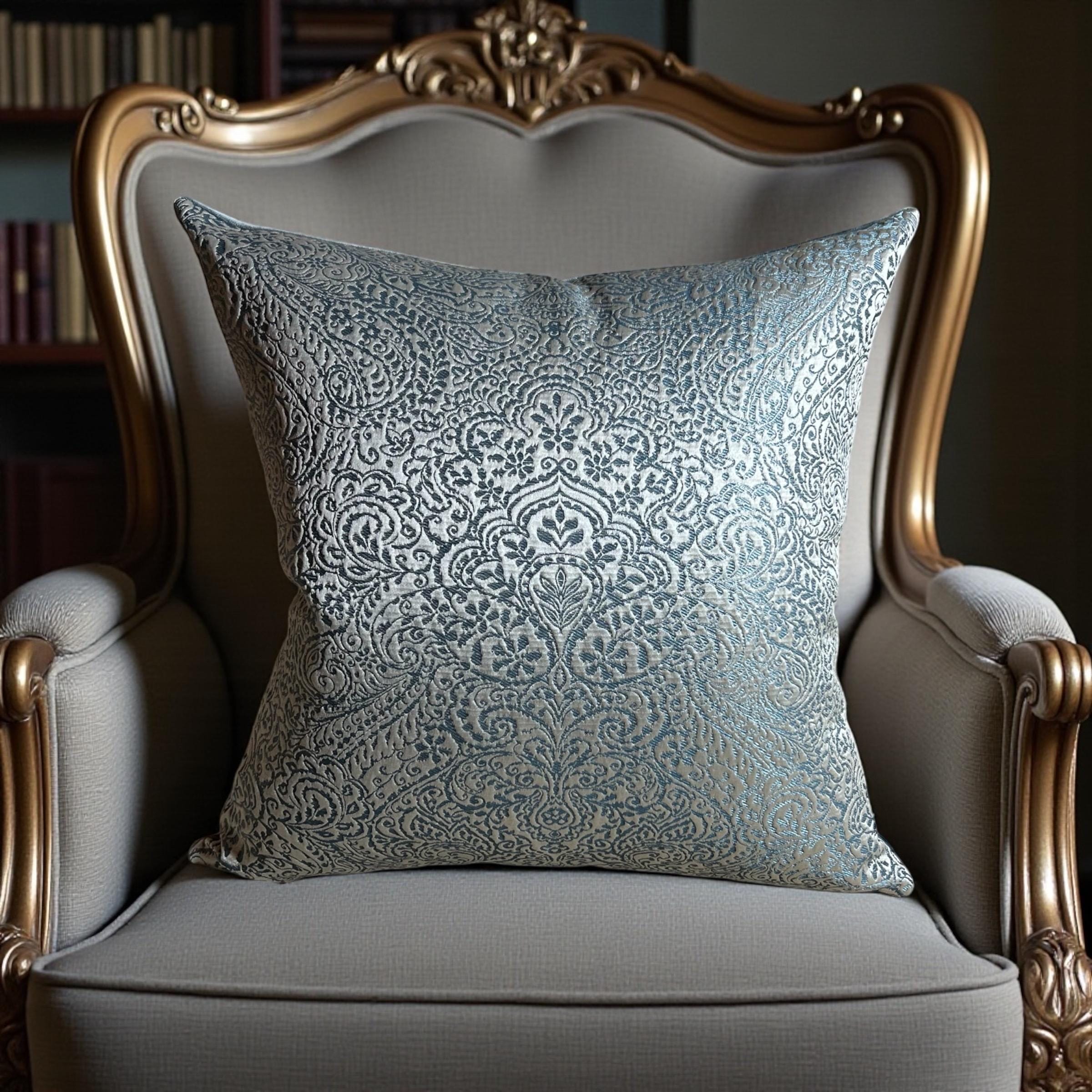 Luxury Silver-Blue Damask & Grey Velvet Pillow Cover: 18x18 Elegant Cushion